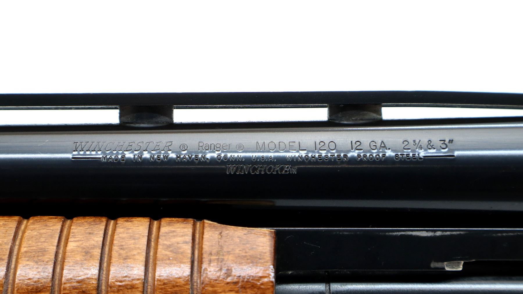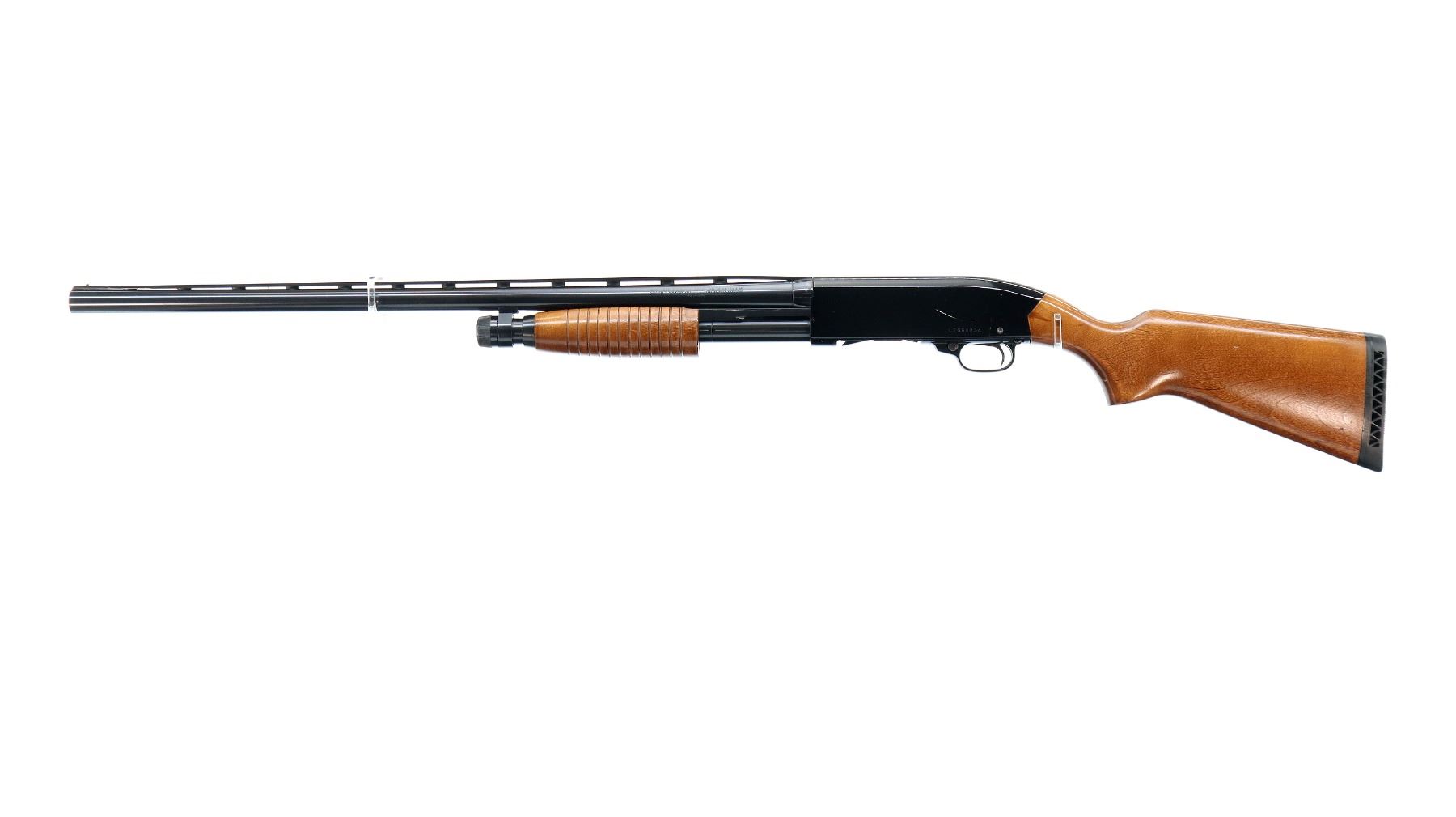 Main Description: Brass bead, blued vent rib barrel, black alloy receiver, action does not fire requires adjustment parts and repair. Two piece wood stocks, grooved forearm which is chipped, pistol grip, black vented rubber recoil pad.