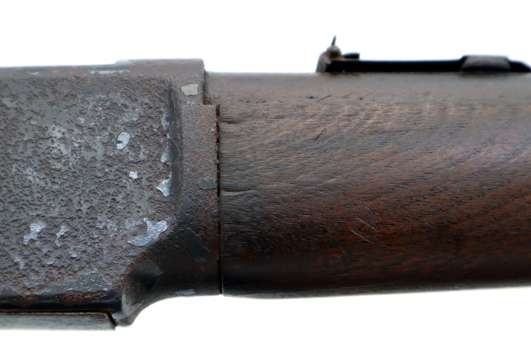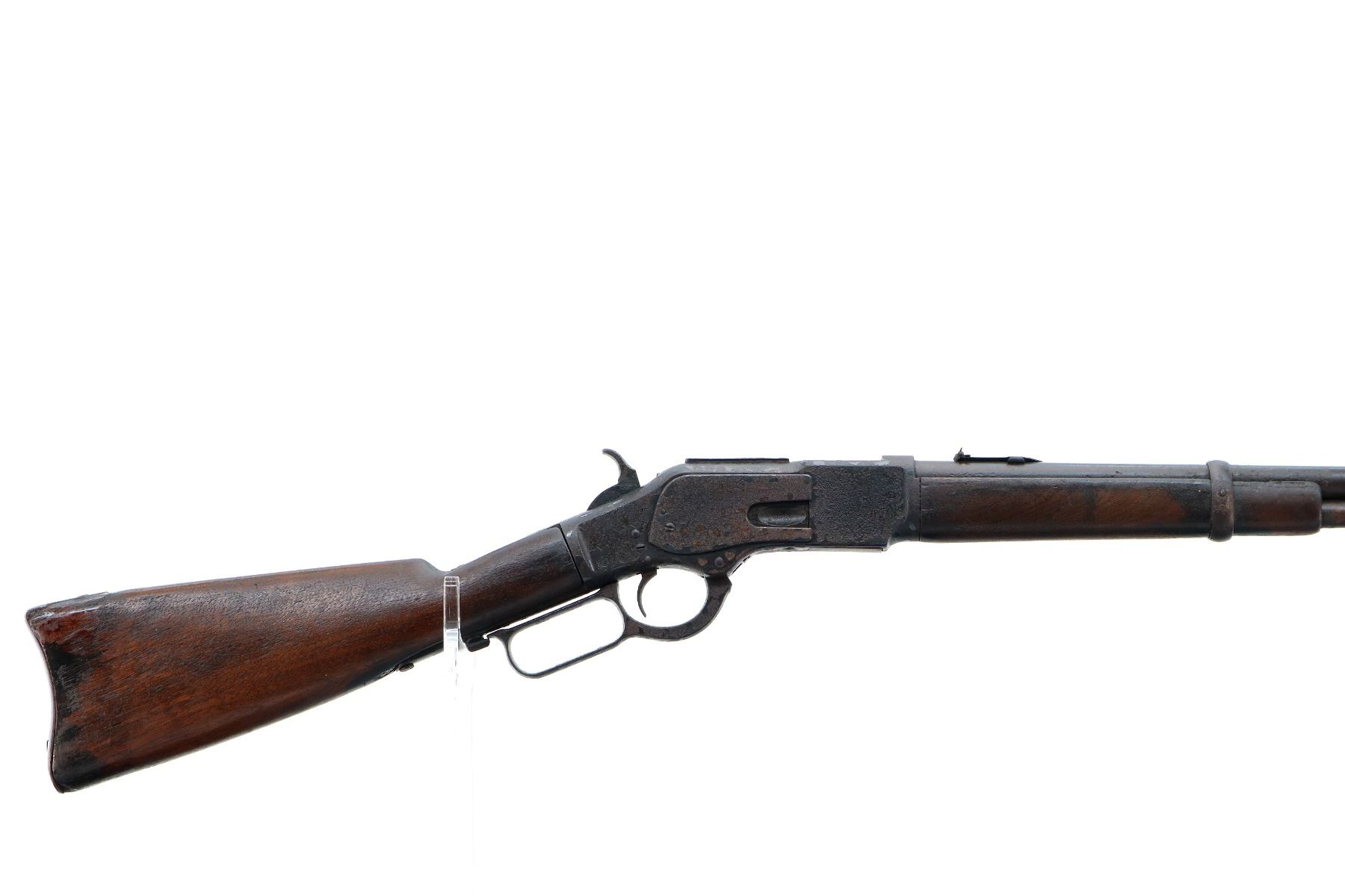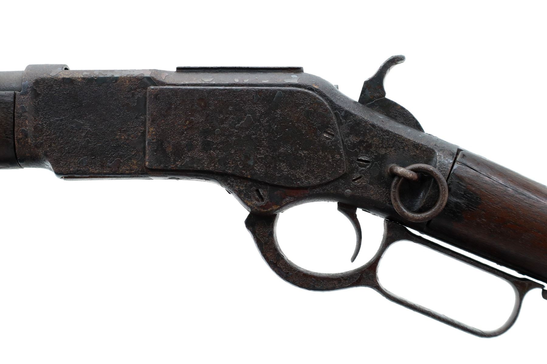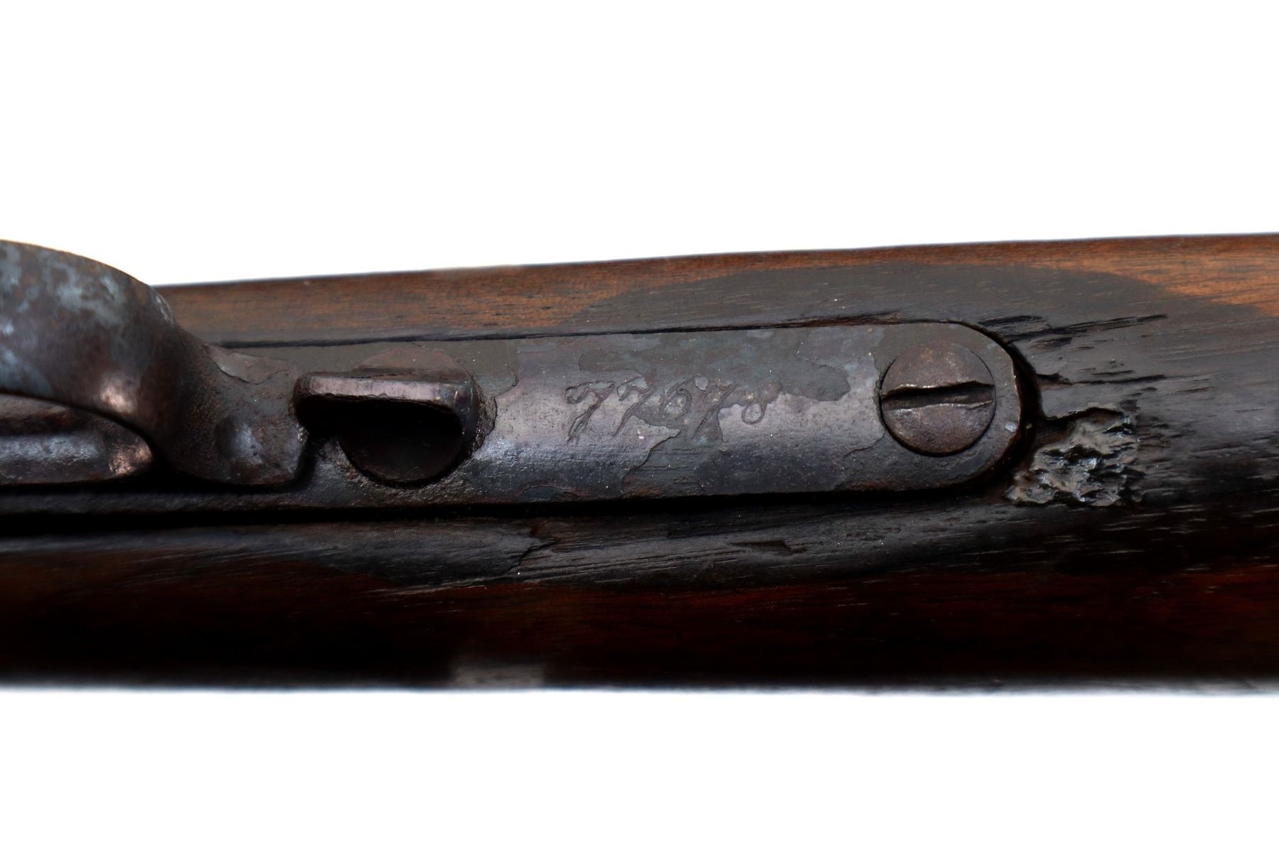 Main Description: Manufactured 1881. Consignor states: this carbine found on the banks of the Fraiser river near the location of Fort Alexandria which was an Hudsons Bay Company established in 1821. Blade front sight, u notched rear sight, missing dust cover, checkered spur hammer, mainspring is weak, saddle ring and stud. Two piece wood stocks, forearm is chipped and cracked, straight grip chipped and cracked behind receiver, smooth curved steel butt plate, stock chipped at heel, full length magtube.