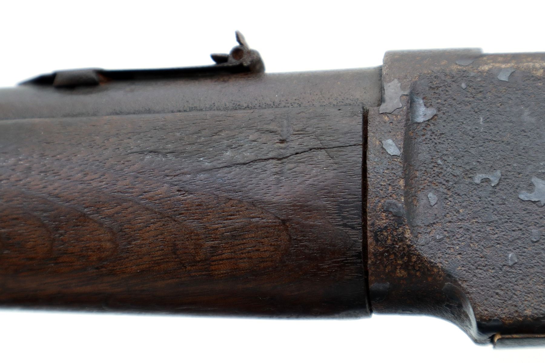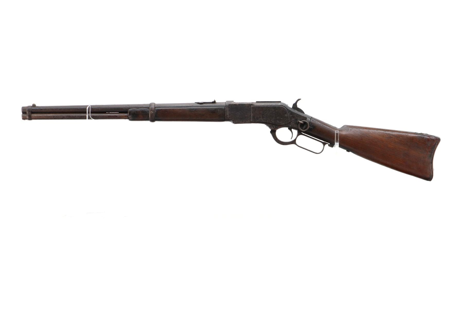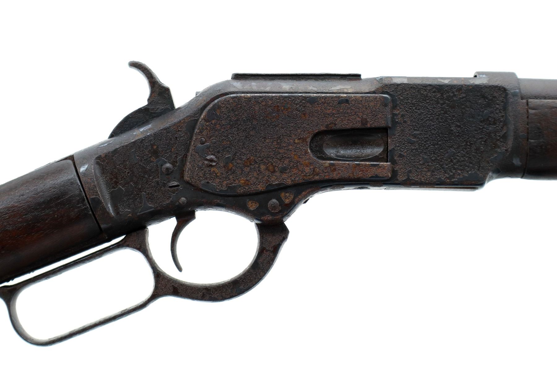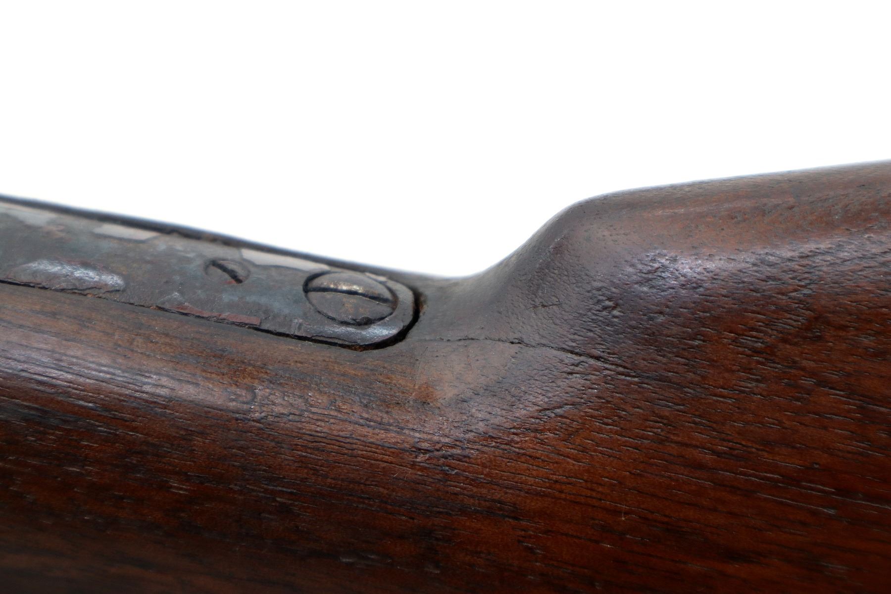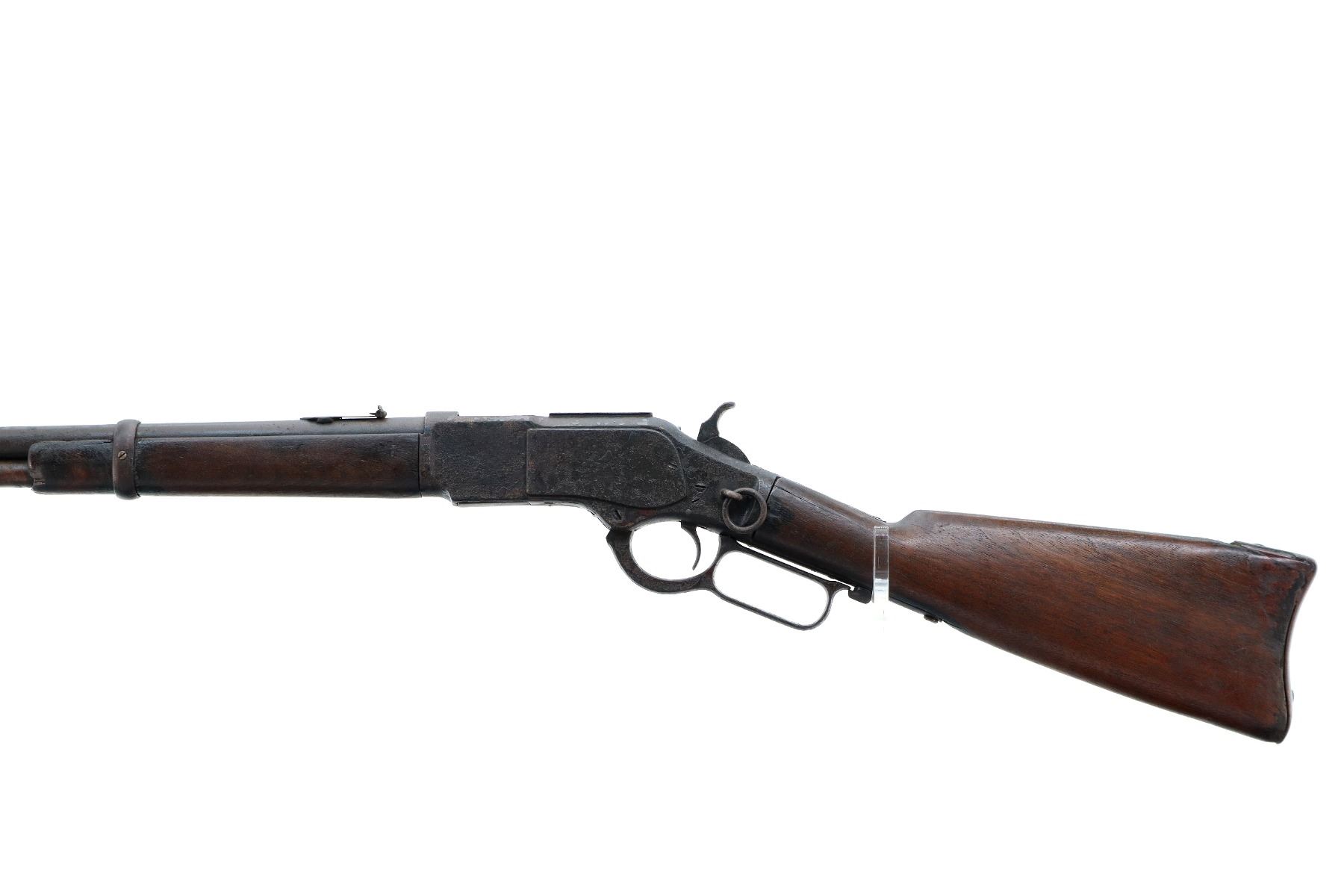 Main Description: Manufactured 1881. Consignor states: this carbine found on the banks of the Fraiser river near the location of Fort Alexandria which was an Hudsons Bay Company established in 1821. Blade front sight, u notched rear sight, missing dust cover, checkered spur hammer, mainspring is weak, saddle ring and stud. Two piece wood stocks, forearm is chipped and cracked, straight grip chipped and cracked behind receiver, smooth curved steel butt plate, stock chipped at heel, full length magtube.