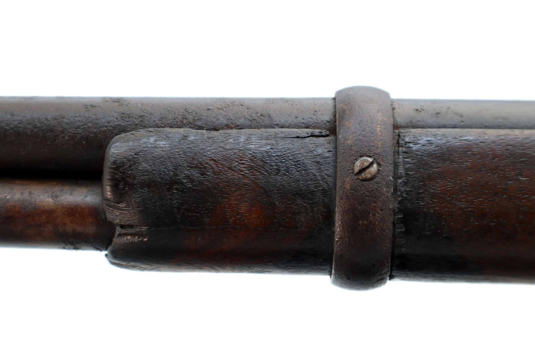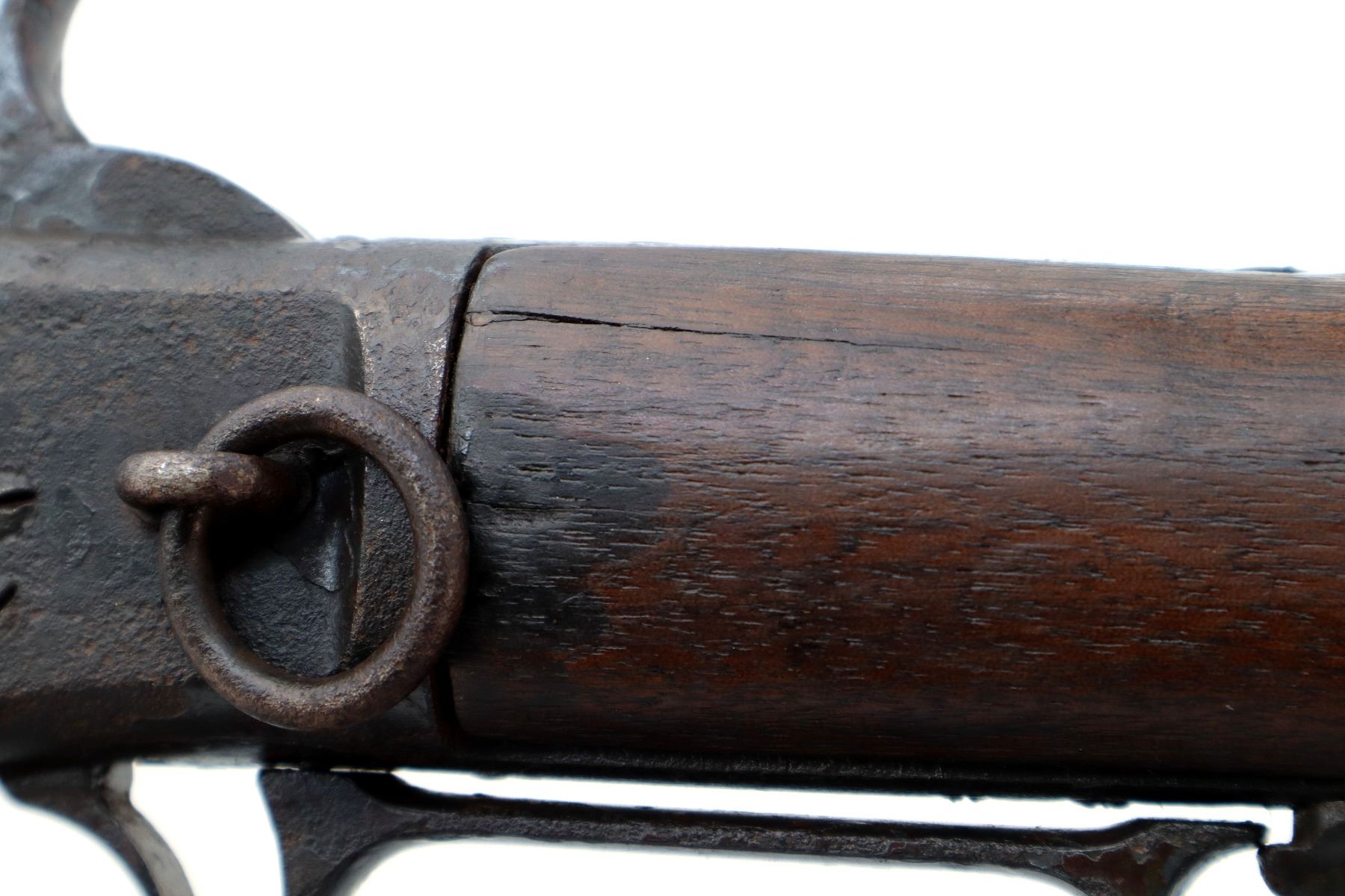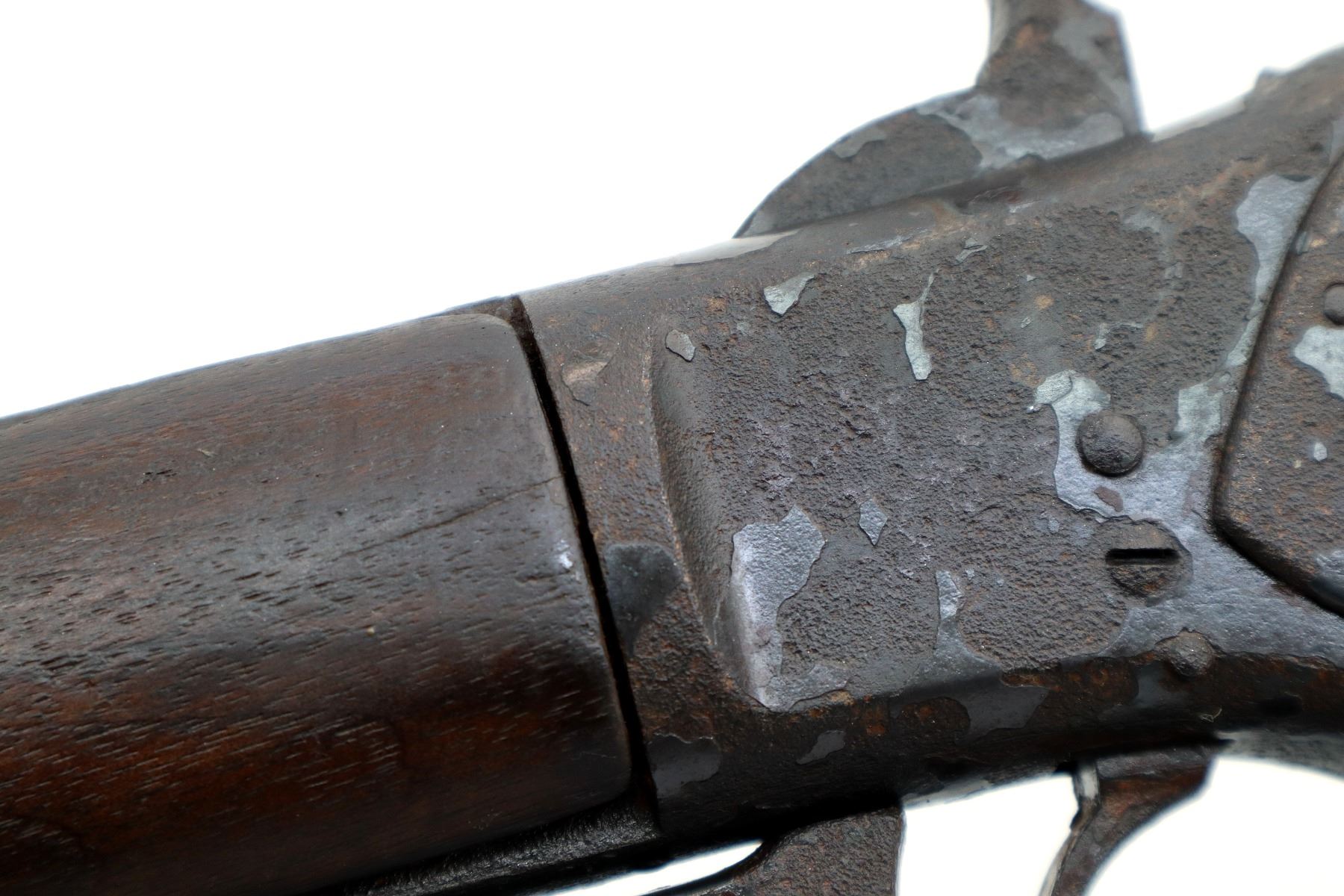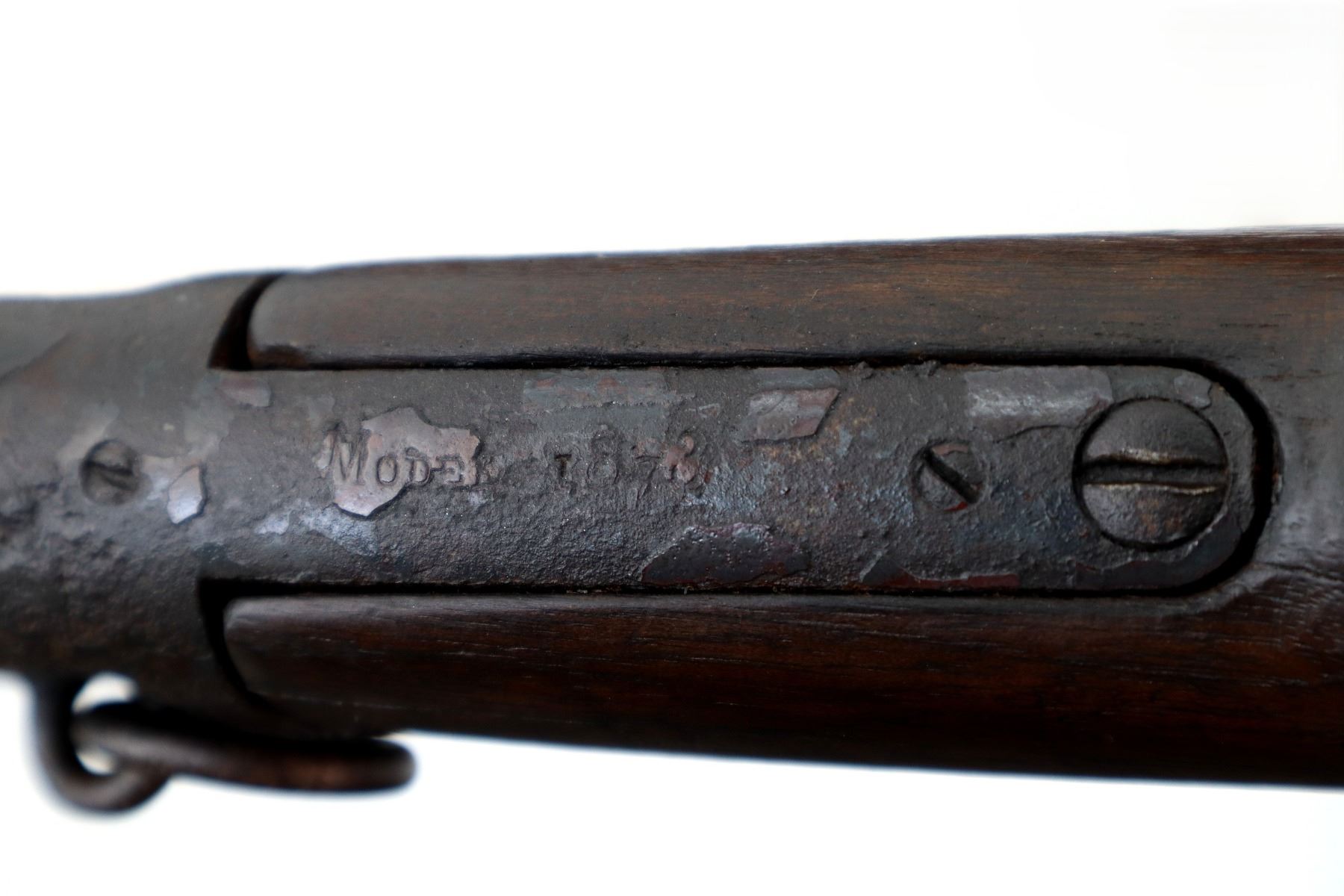 Main Description: Manufactured 1881. Consignor states: this carbine found on the banks of the Fraiser river near the location of Fort Alexandria which was an Hudsons Bay Company established in 1821. Blade front sight, u notched rear sight, missing dust cover, checkered spur hammer, mainspring is weak, saddle ring and stud. Two piece wood stocks, forearm is chipped and cracked, straight grip chipped and cracked behind receiver, smooth curved steel butt plate, stock chipped at heel, full length magtube.