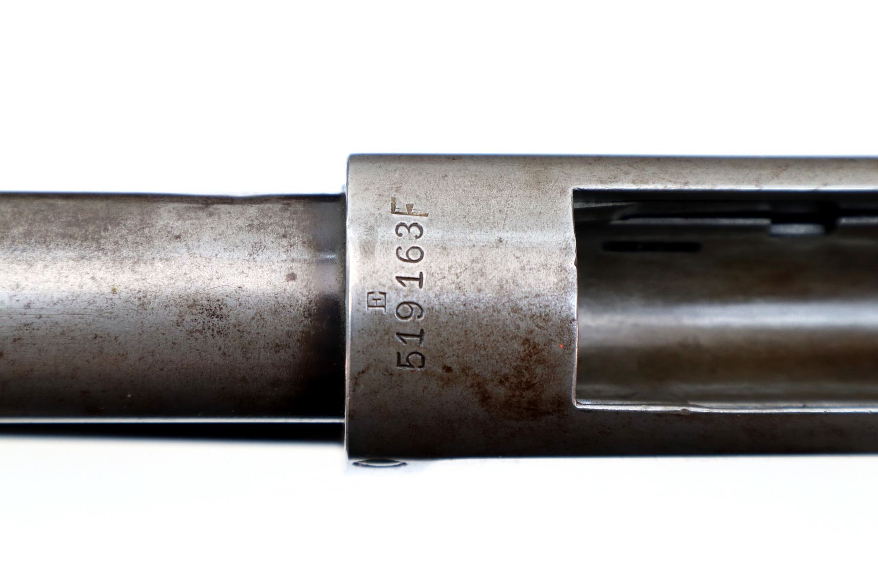 Main Description: Manufactured 1911. Shortened barrel, no bead installed, muzzle requires work, ridge around the inside of bore. Blued finish, checkered spur hammer. Two piece wood stocks, grooved forearm which is chipped and cracked, pistol grip cracked behind receiver, checkered black polymer butt plate, magtube missing two screws.