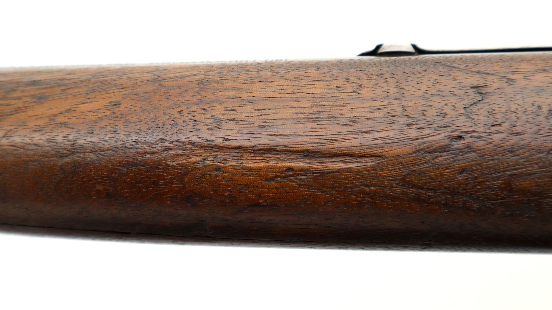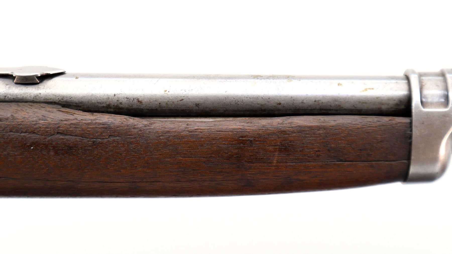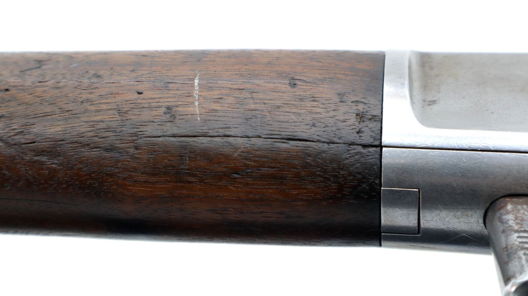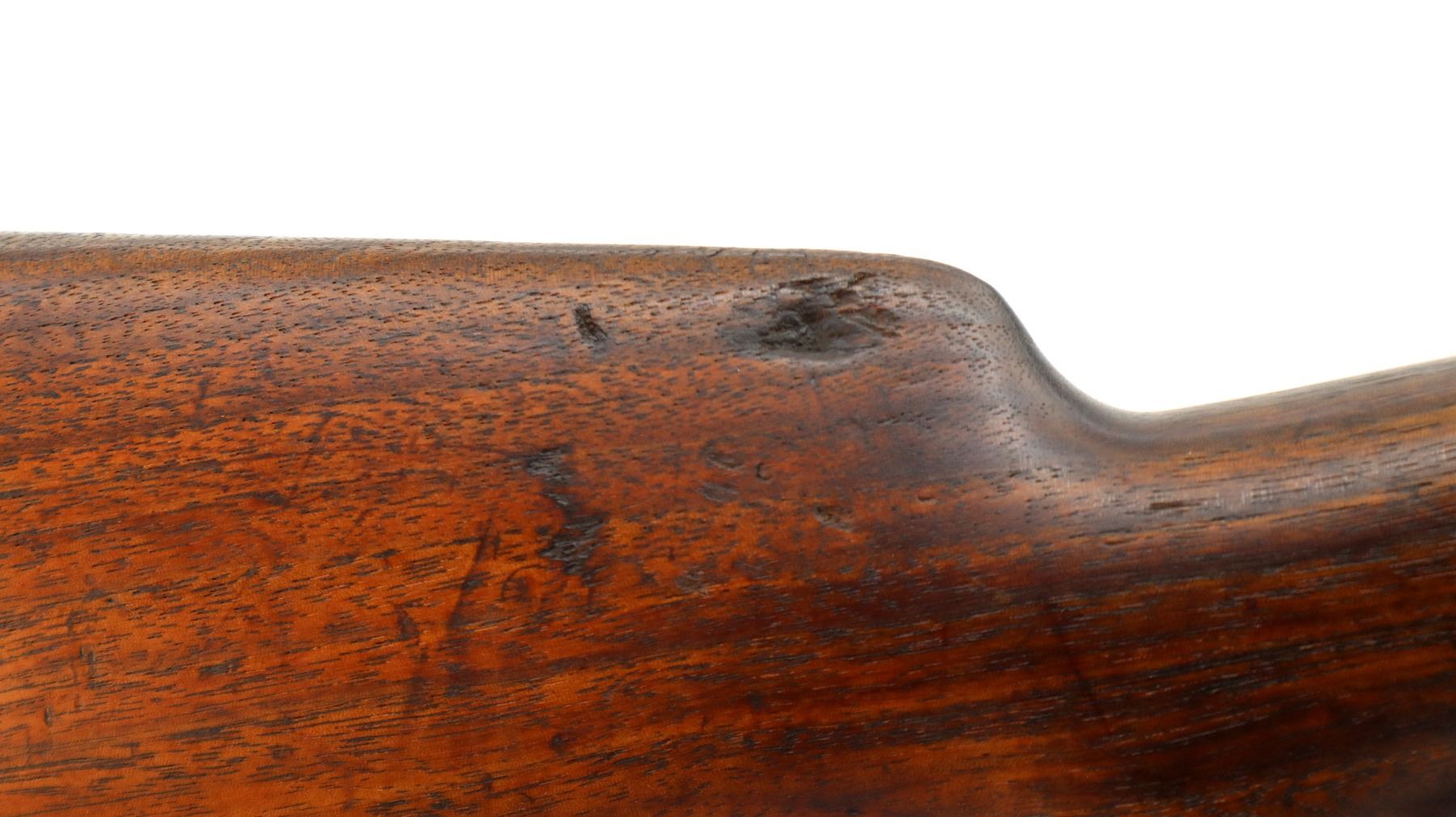 Main Description: Manufactured 1908. Blade front sight with ramp, adjustable u notched rear sight. Two piece wood stocks, forearm is chipped and cracked, pistol grip cracked behind receiver, grooved steel butt plate, 13.75" LOP.