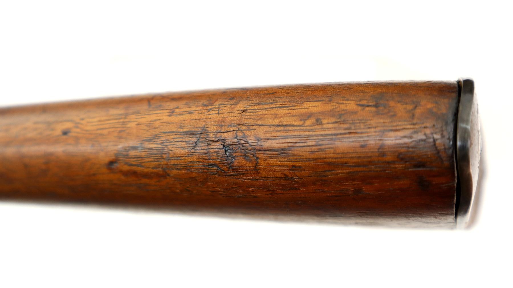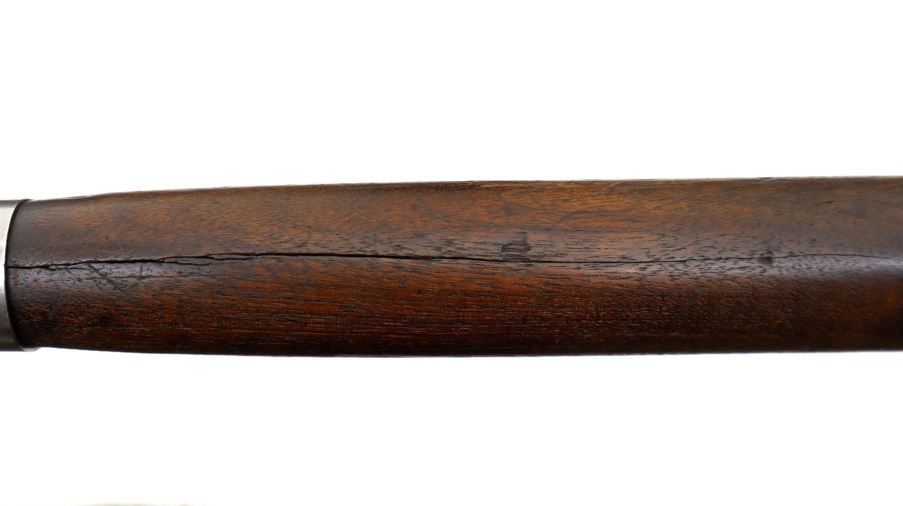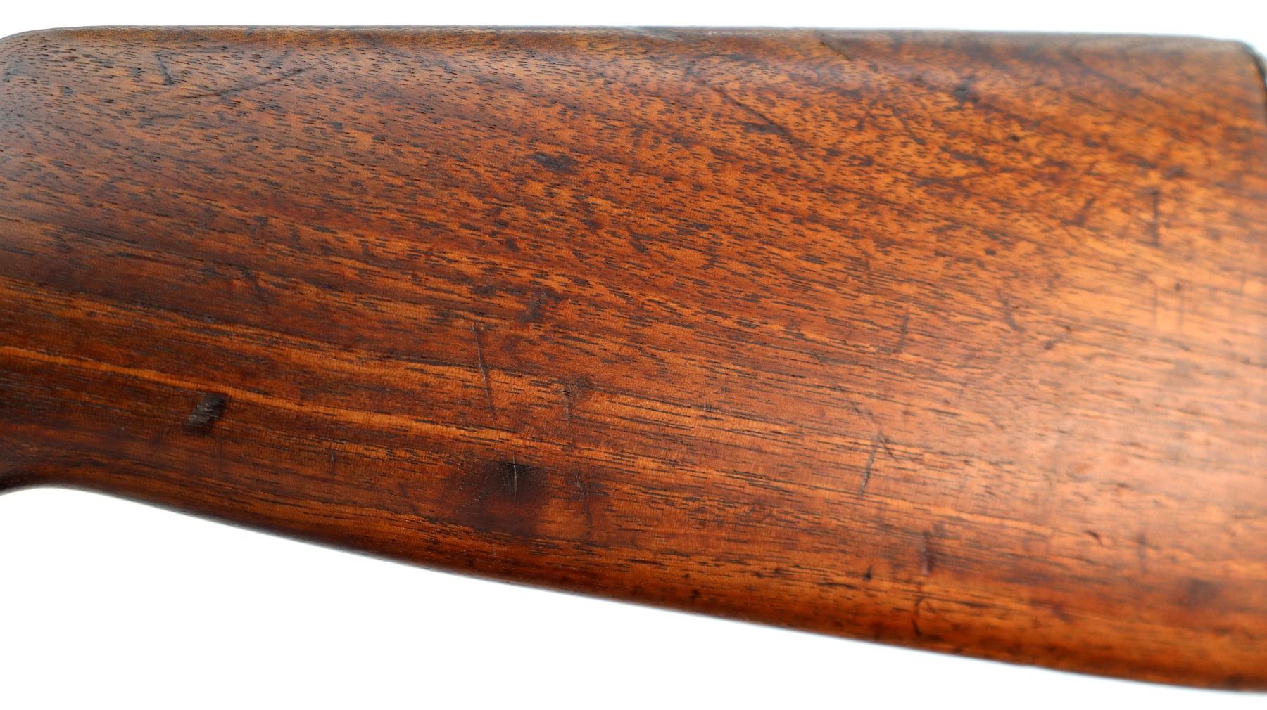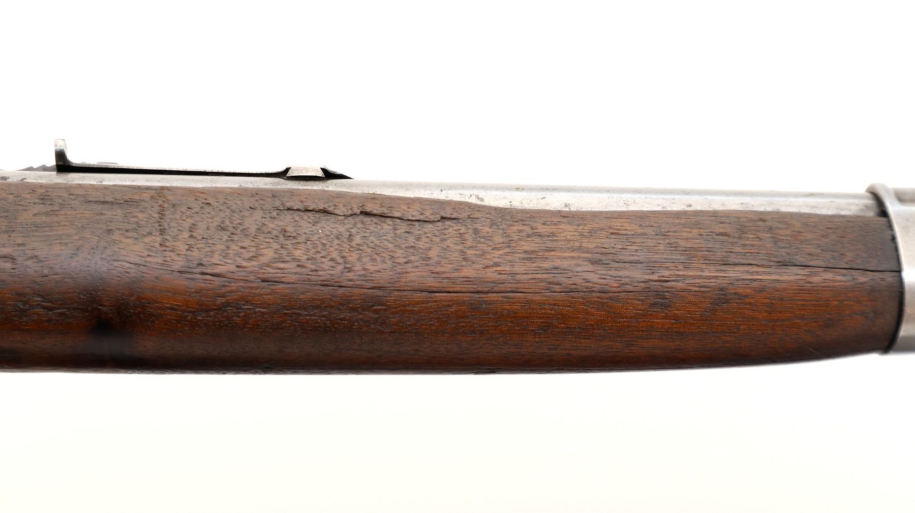 Main Description: Manufactured 1908. Blade front sight with ramp, adjustable u notched rear sight. Two piece wood stocks, forearm is chipped and cracked, pistol grip cracked behind receiver, grooved steel butt plate, 13.75" LOP.