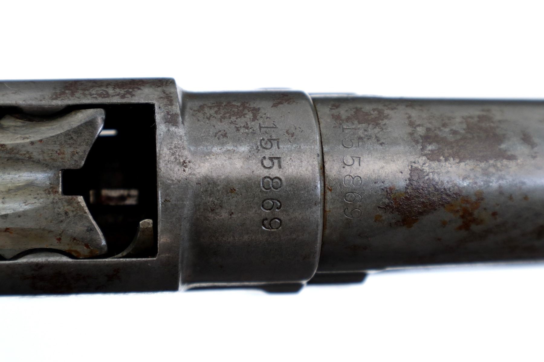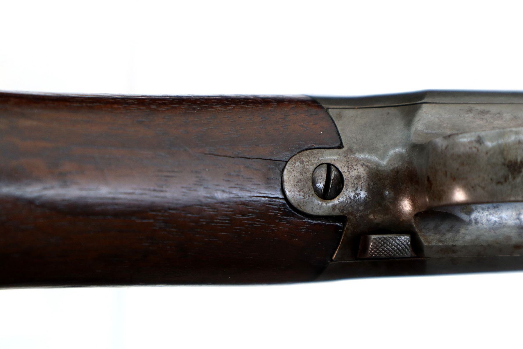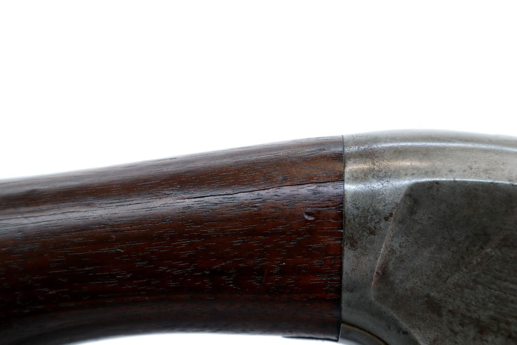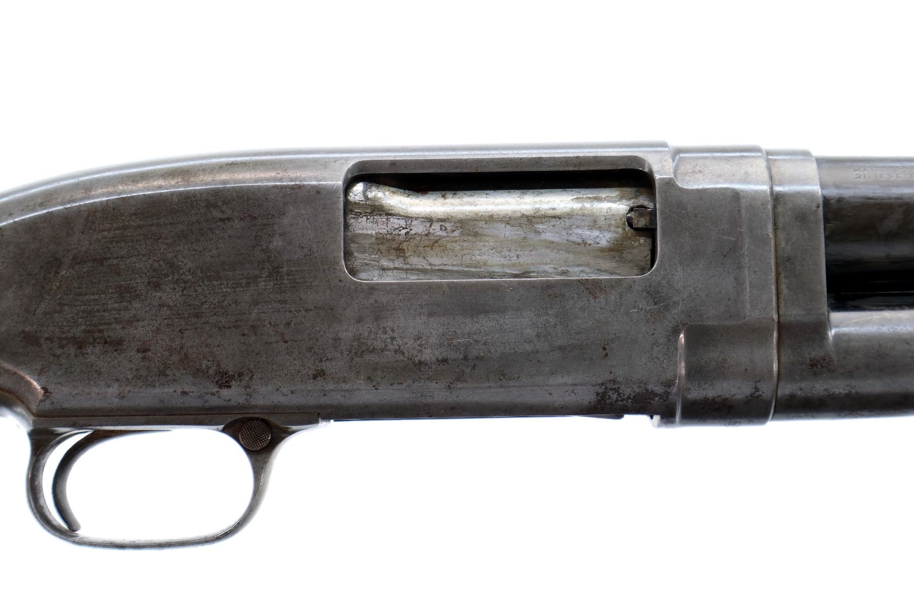 Main Description: Manufactured 1916. Broken bead, grey painted metal finish, round barrel. Two piece wood stocks, grooved forearm, pistol grip cracked behind receiver, red vented rubber recoil pad, 13.75" LOP