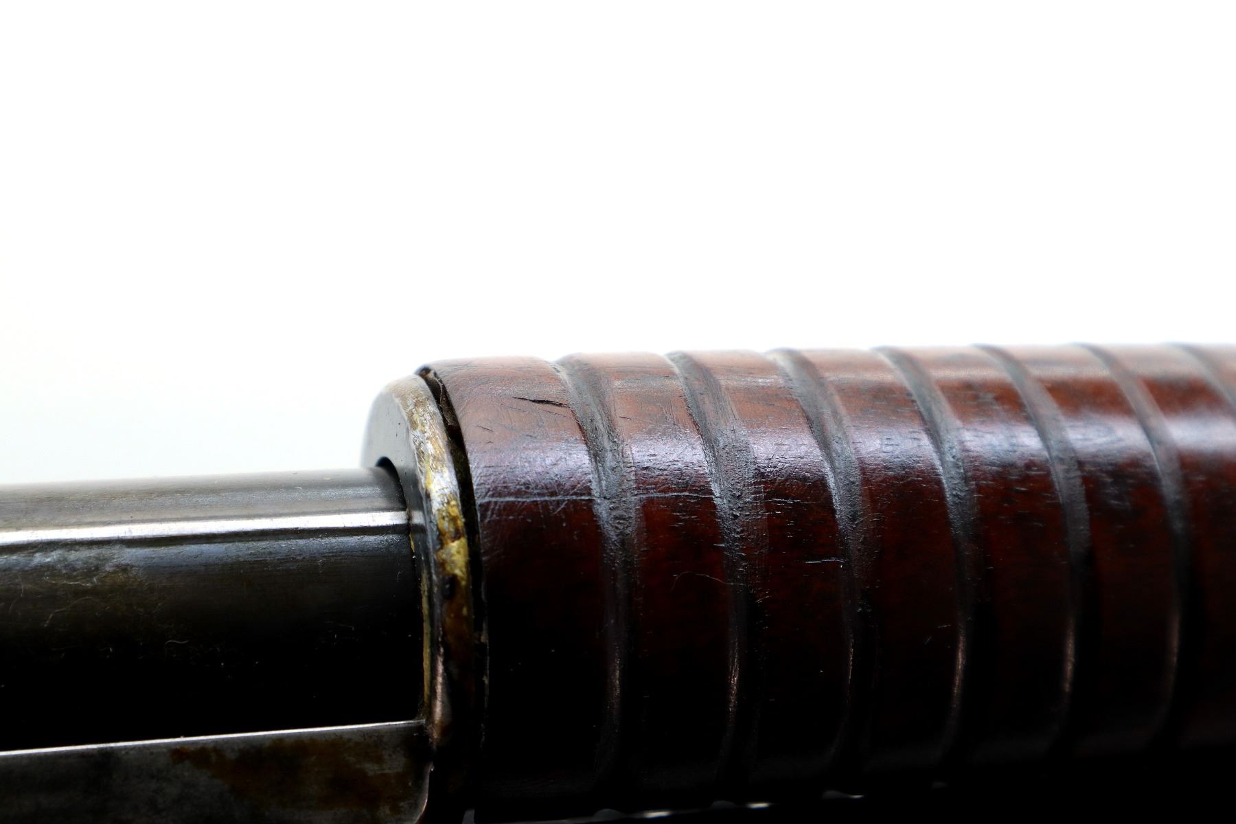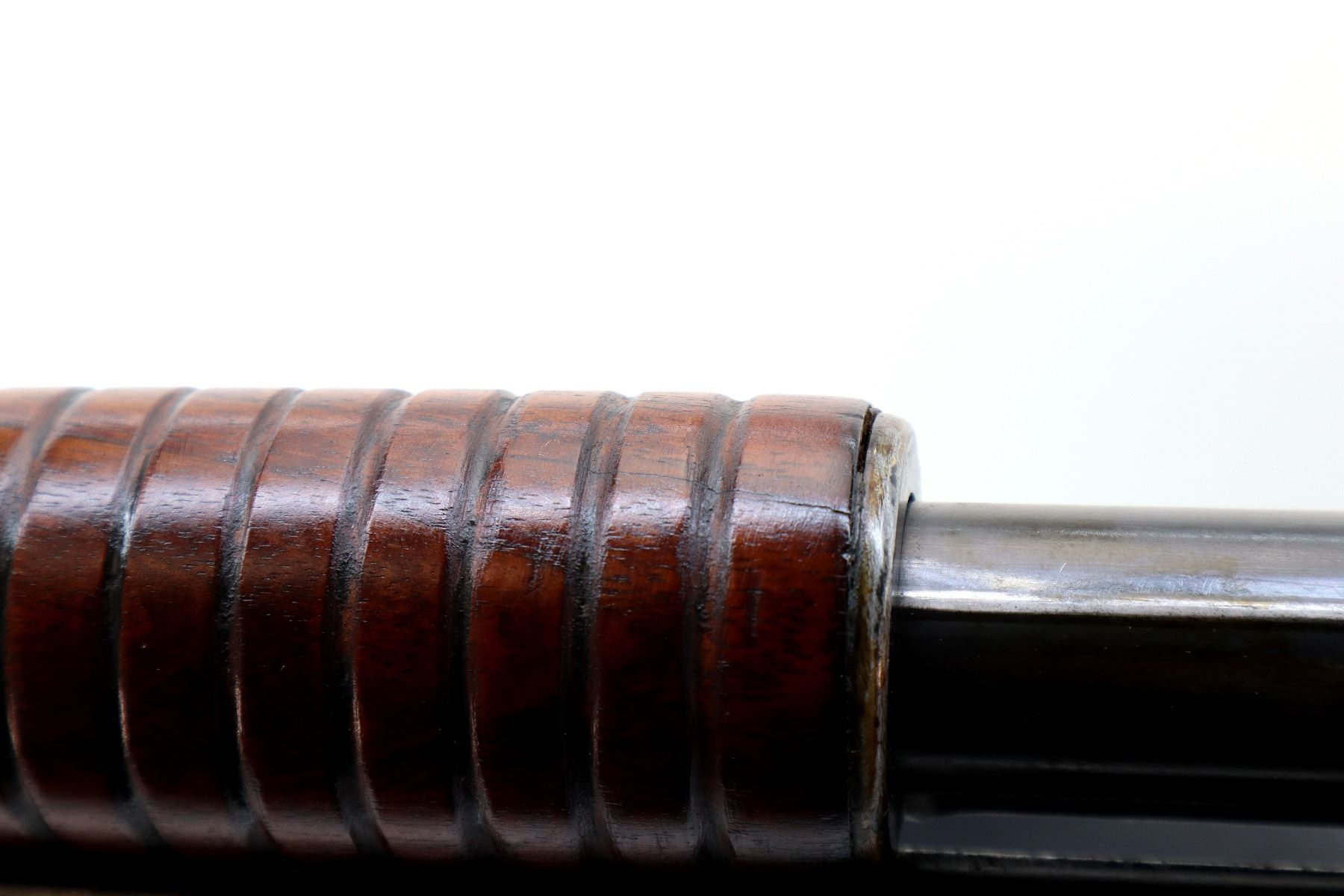 Main Description: Manufactured 1912. Brass bead, blued finish, round barrel. Two piece wood stocks, grooved forearm which is cracked, pistol grip, note: shaped different than standard Winchester butt stock, possibly a replacement or early variation. Red vented rubber recoil pad with black spacer which is cracked and a clear spacer, 14" LOP