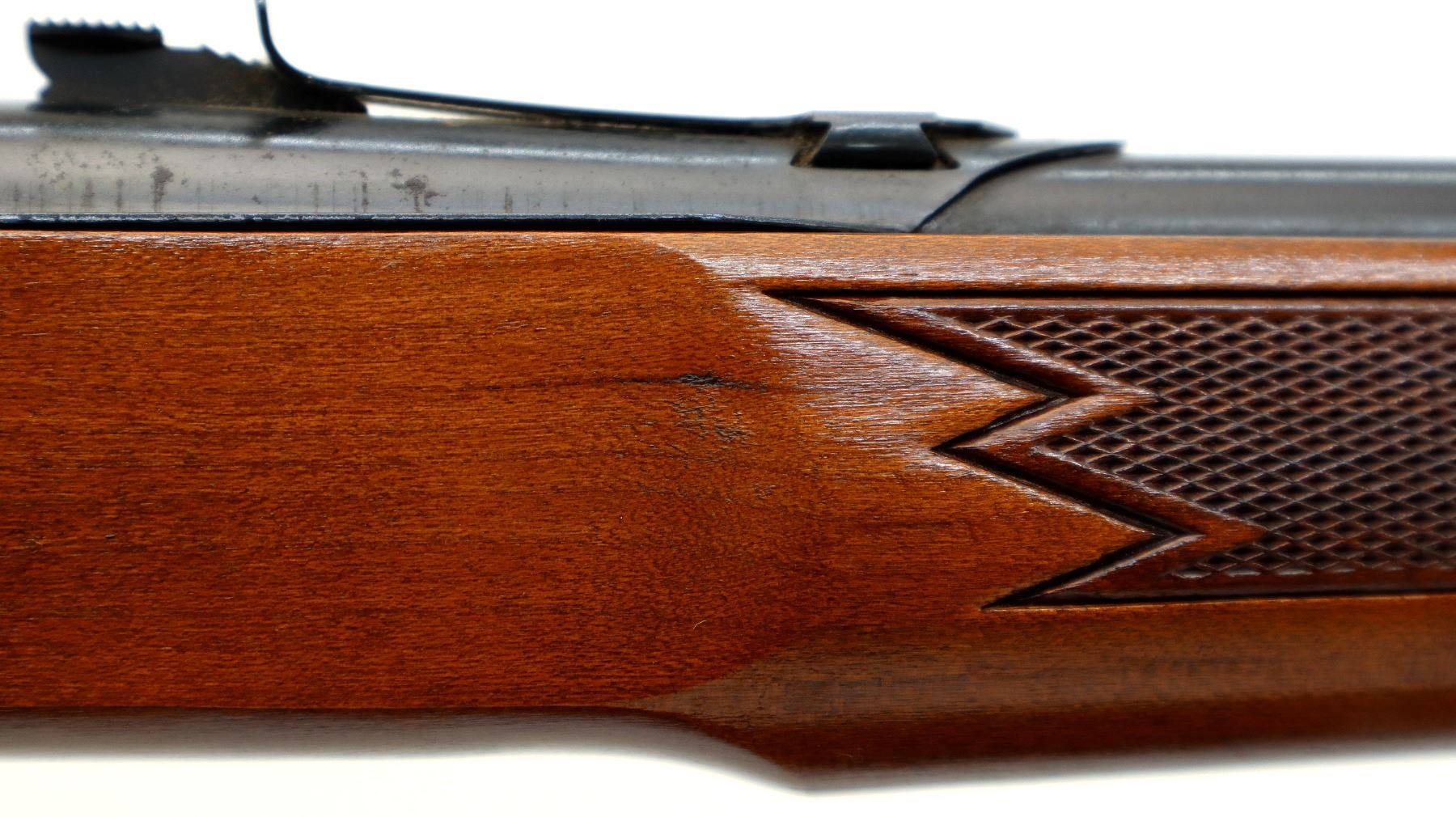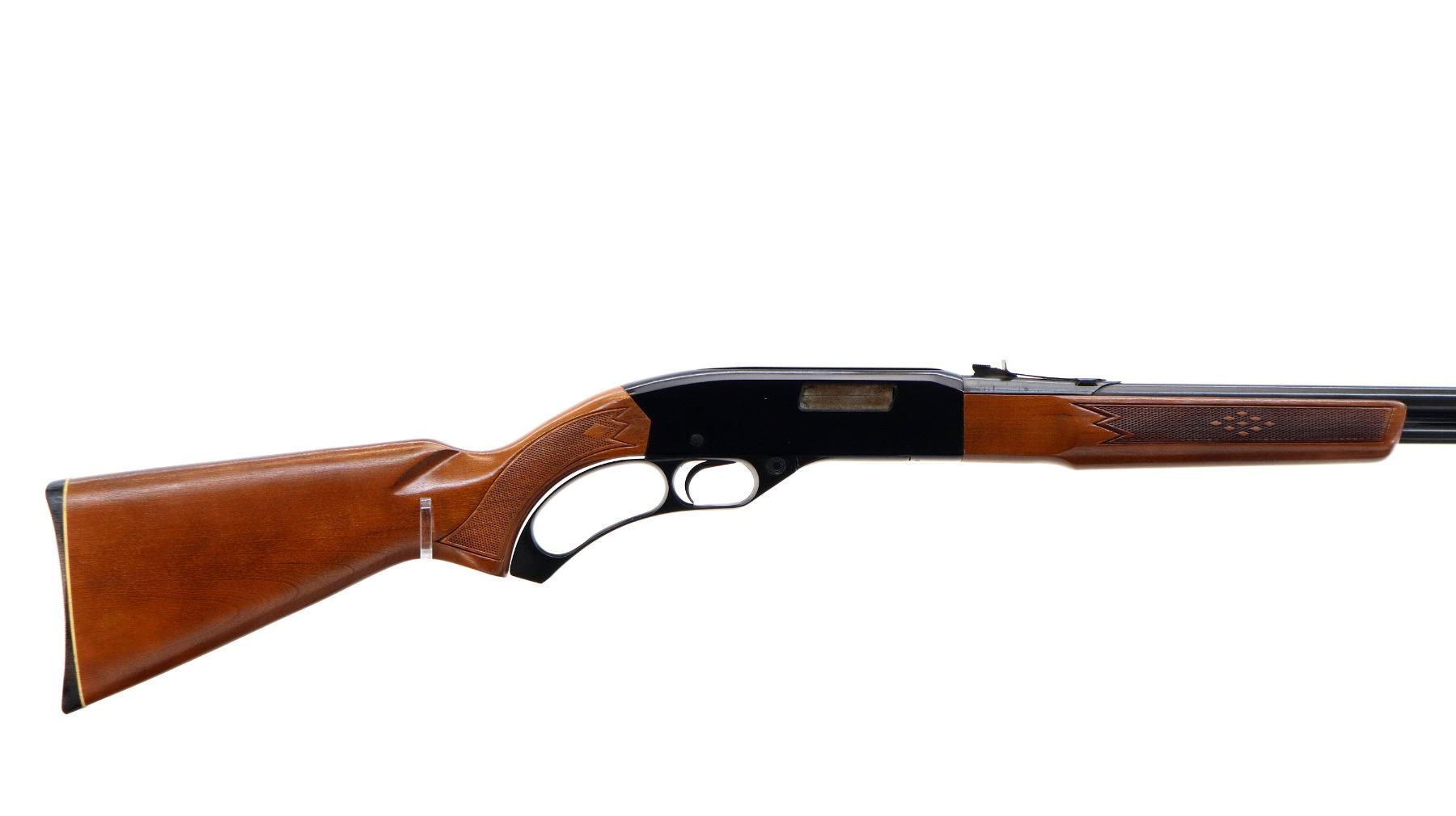 Main Description: Blade front sight, adjustable u notched rear sight, blued barrel, grooved black alloy receiver. Two piece wood stocks, checkered forearm and pistol grip, grooved black polymer butt plate