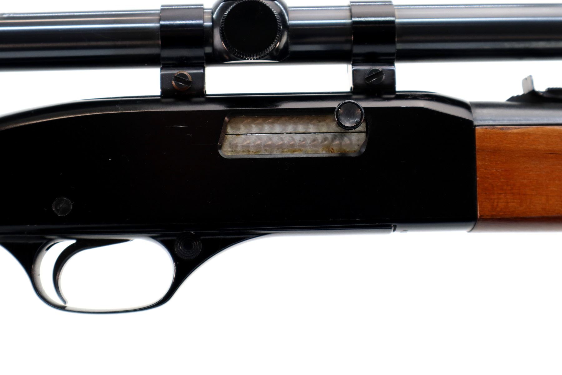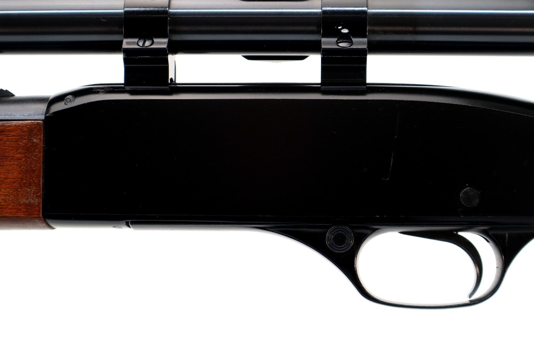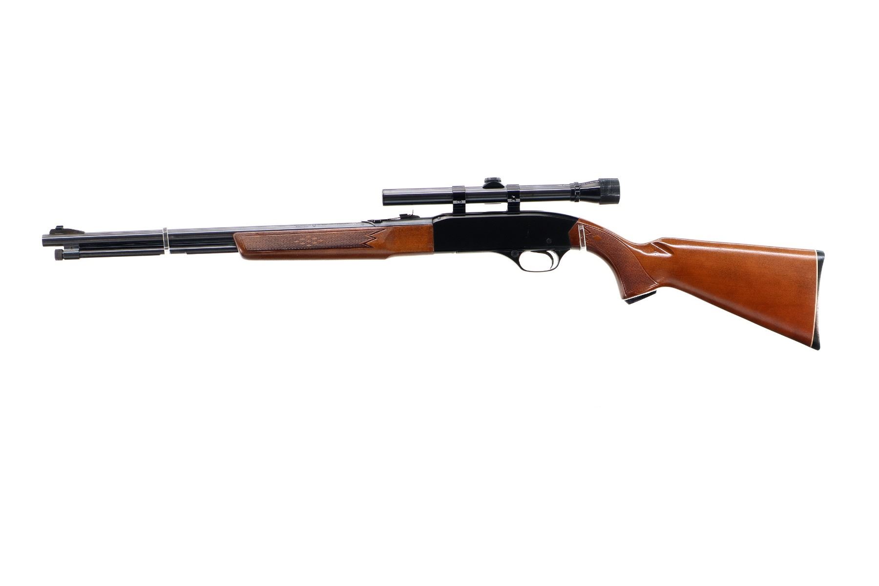 Main Description: Blade front sight with ramp, adjustable u notched rear sight, blued barrel and outer magtube, grooved black polymer receiver with Weaver D4 scope installed, clear optics with duplex crosshair. Two piece wood stocks, checkered forearm and pistol grip, grooved black polymer butt plate, grip cap.