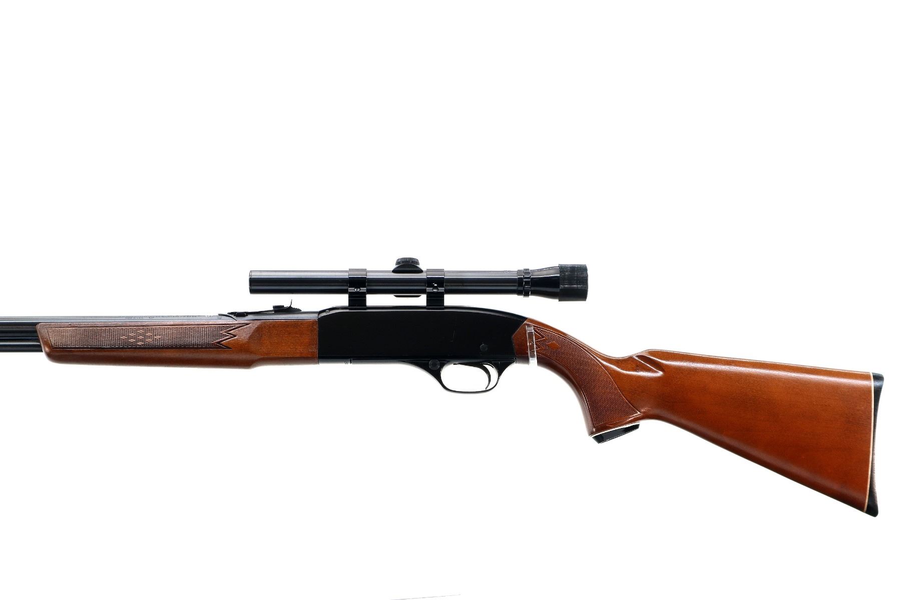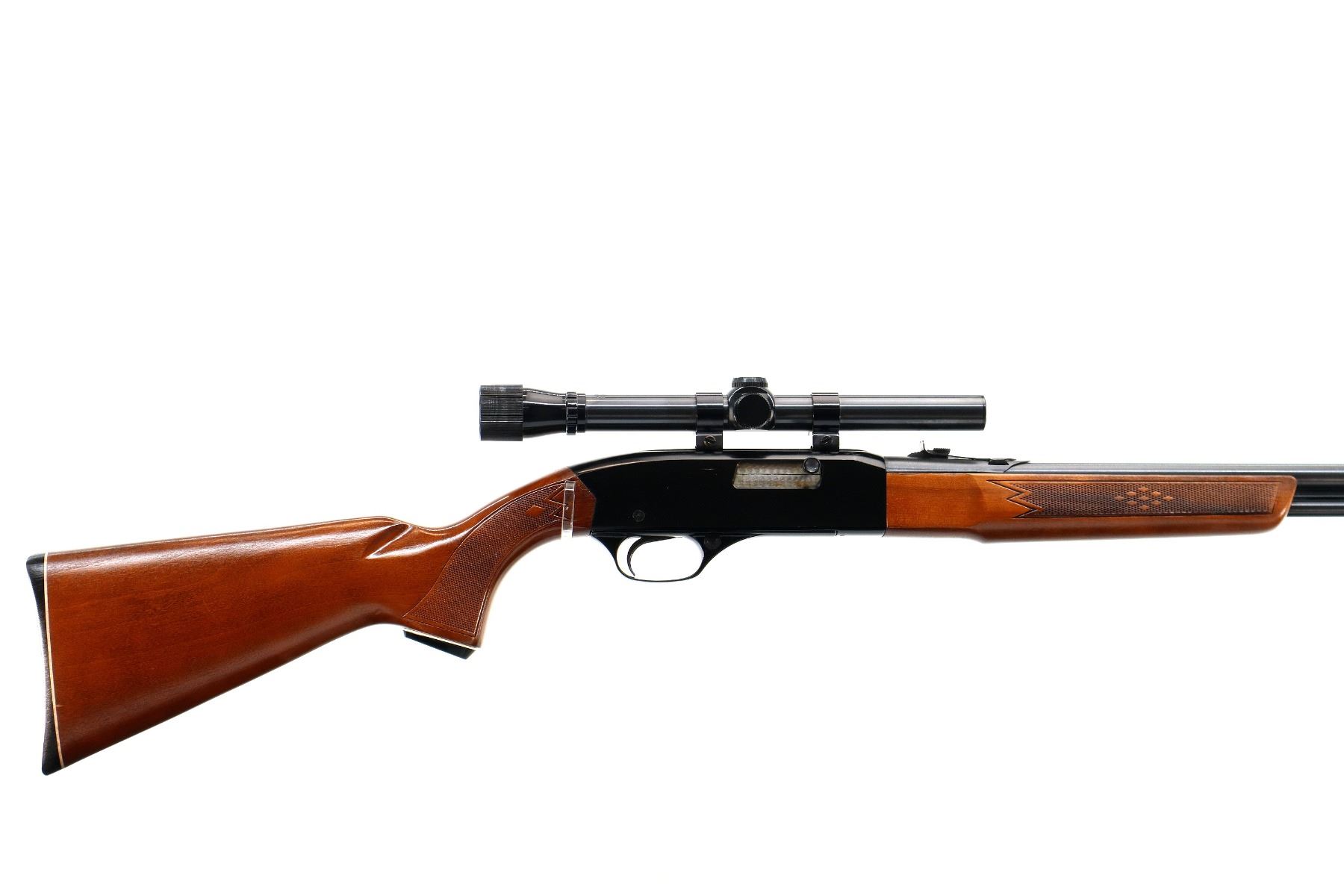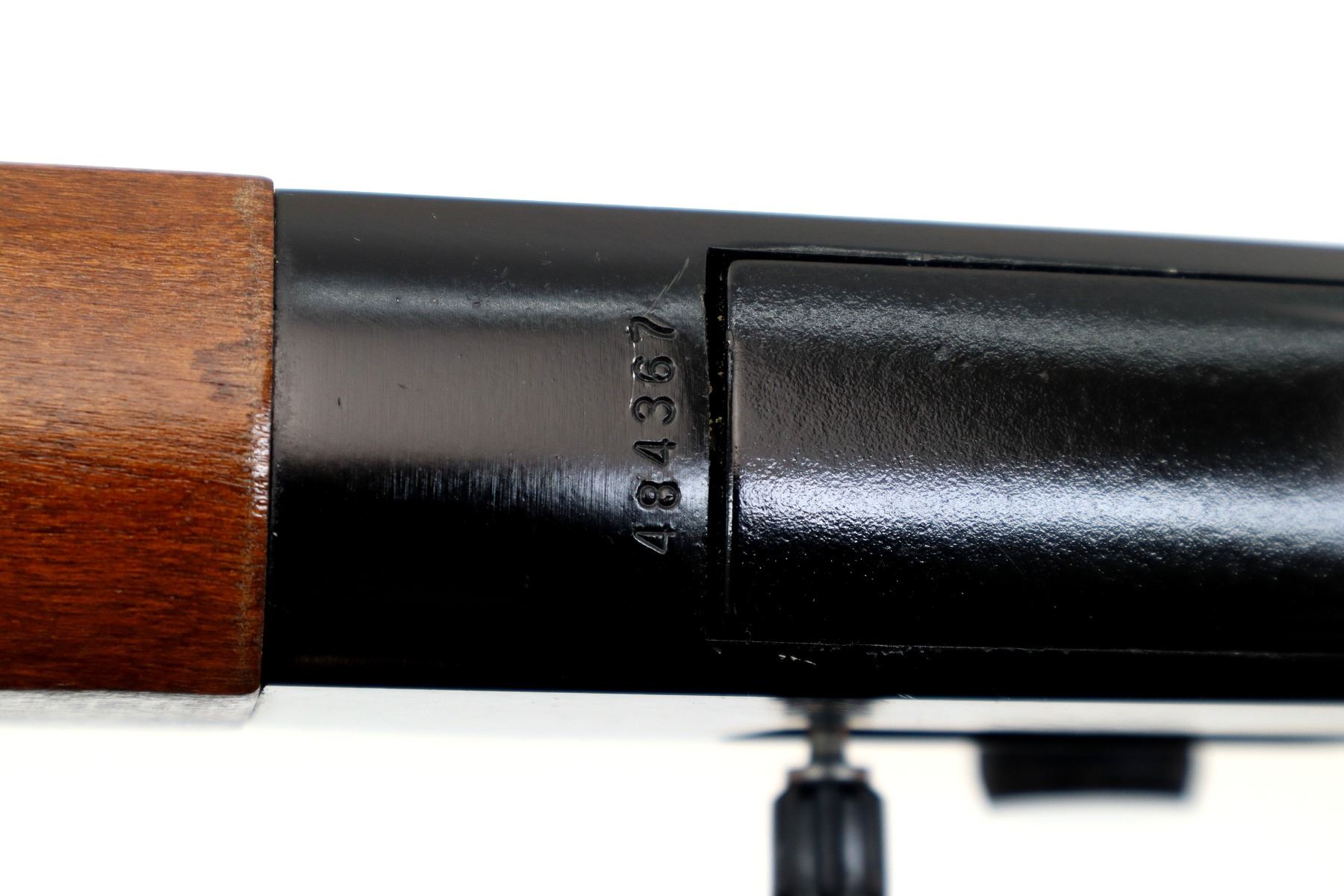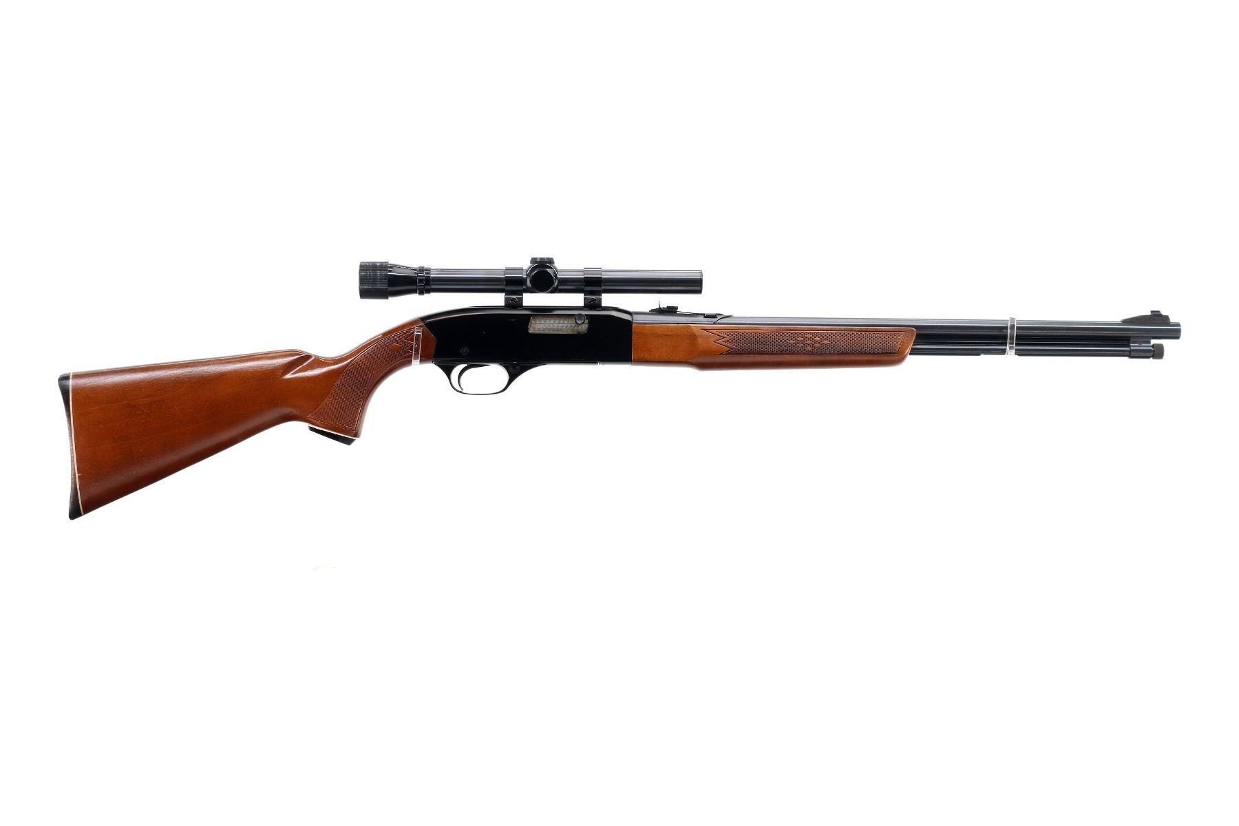 Main Description: Blade front sight with ramp, adjustable u notched rear sight, blued barrel and outer magtube, grooved black polymer receiver with Weaver D4 scope installed, clear optics with duplex crosshair. Two piece wood stocks, checkered forearm and pistol grip, grooved black polymer butt plate, grip cap.