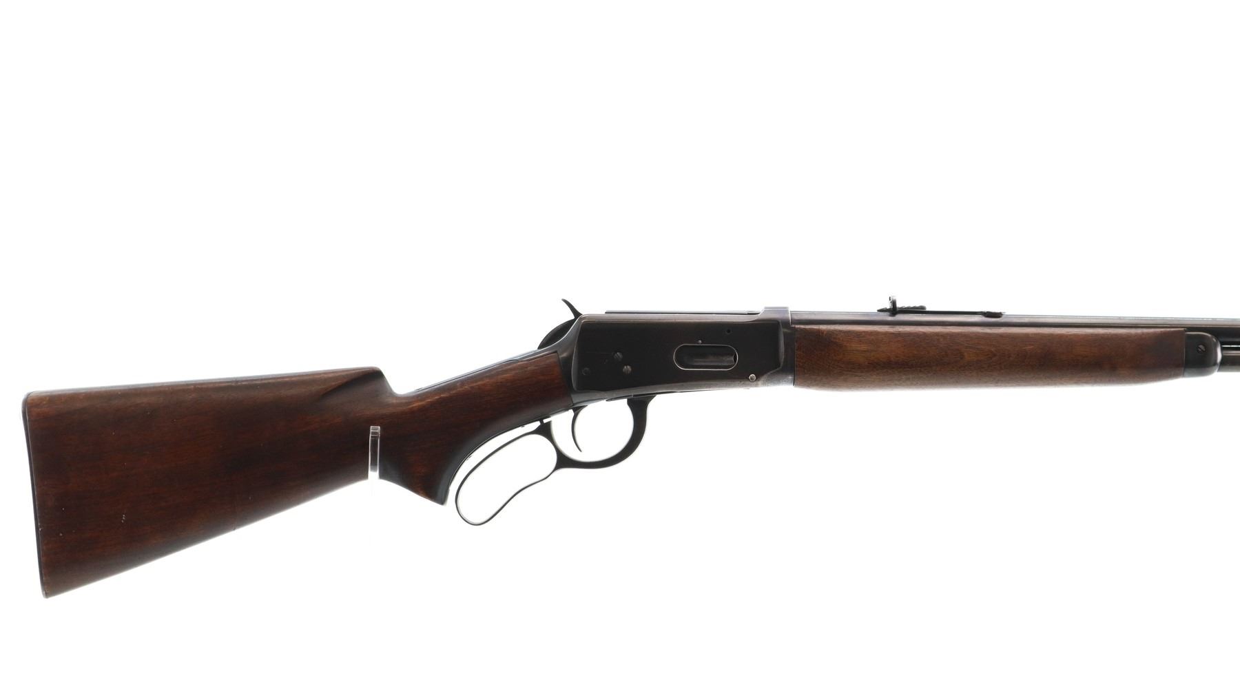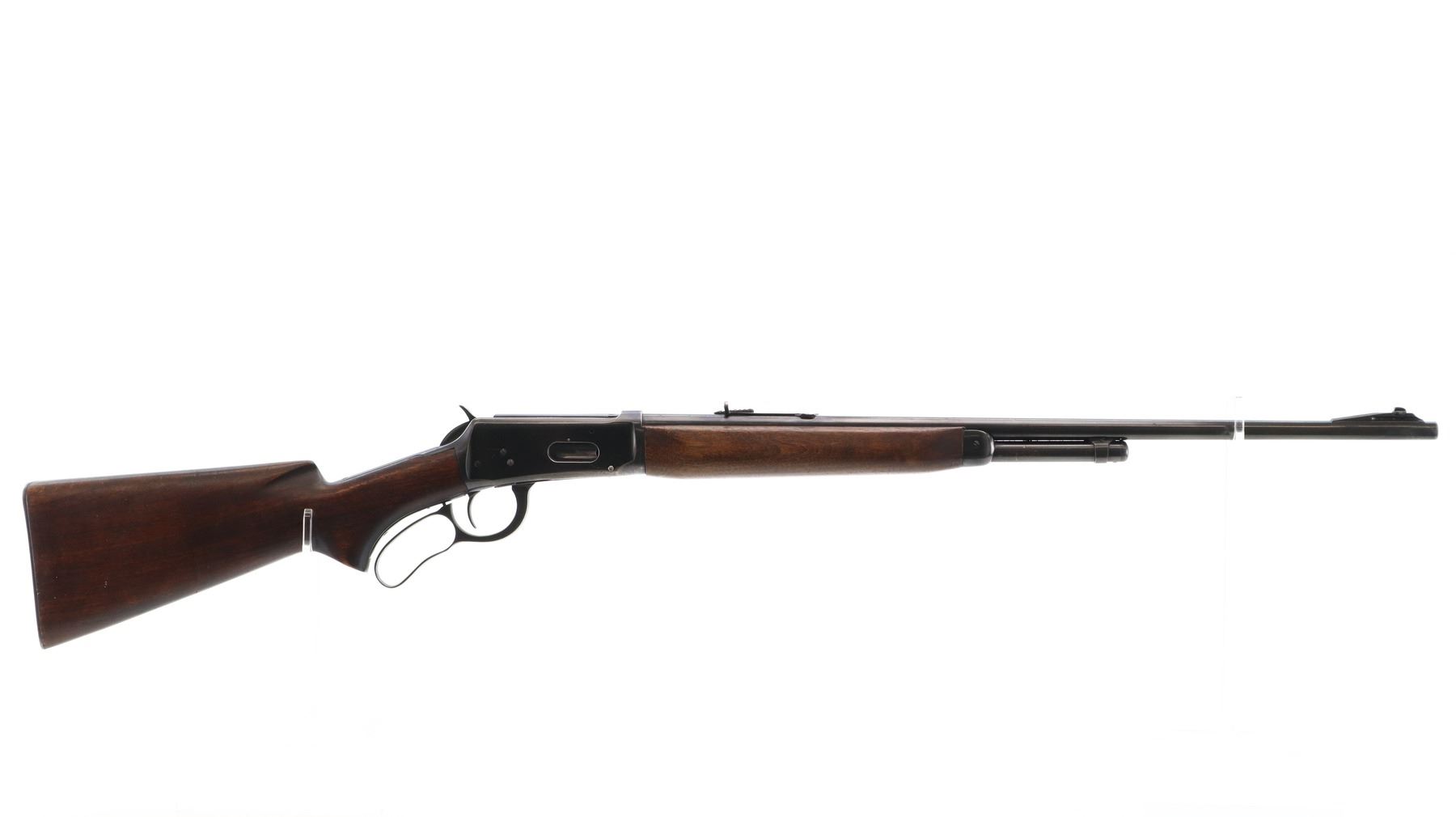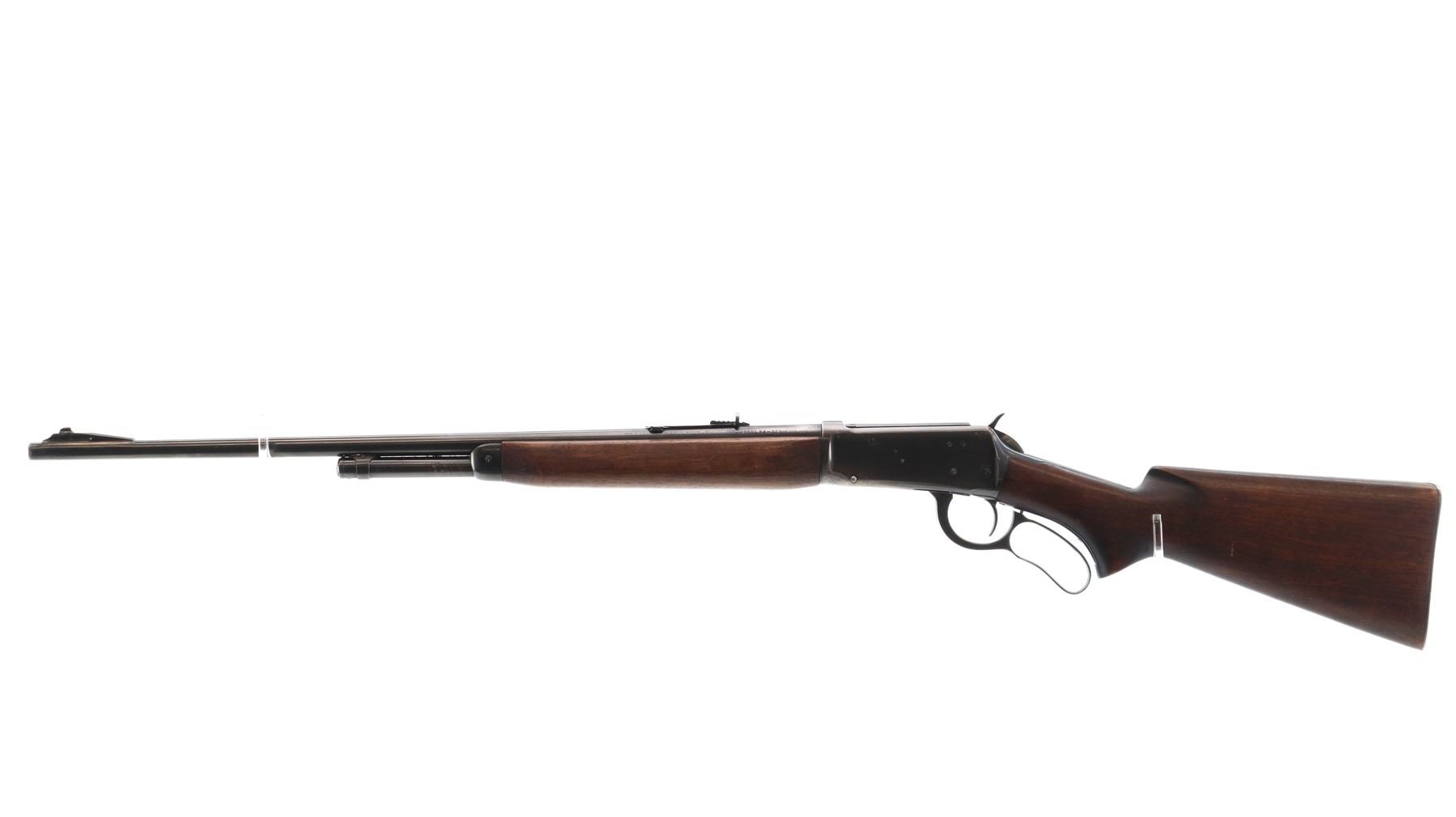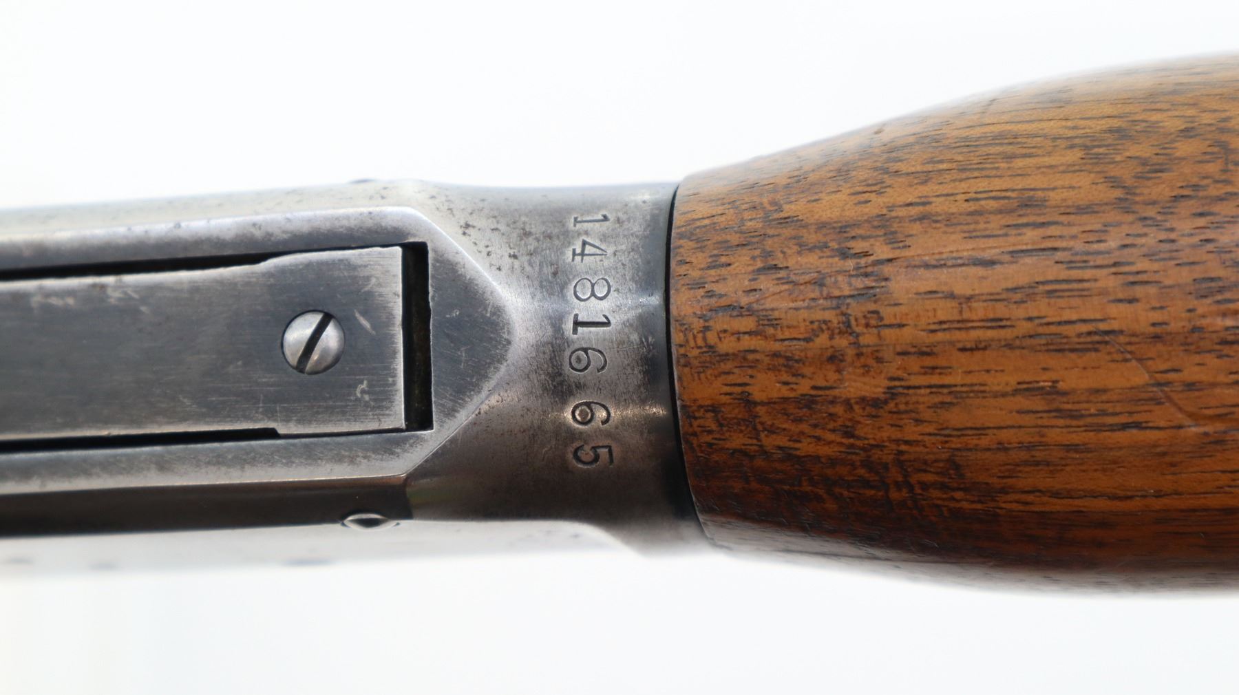 Main Description: Manufactured 1948. Blade front sight with ramp, adjustable u notched rear sight, Approx. 80 percent blueing remaining, round barrel, grooved spur hammer. Two piece smooth wood stocks, pistol grip, checkered steel butt plate, 2/3rd length button magtube.