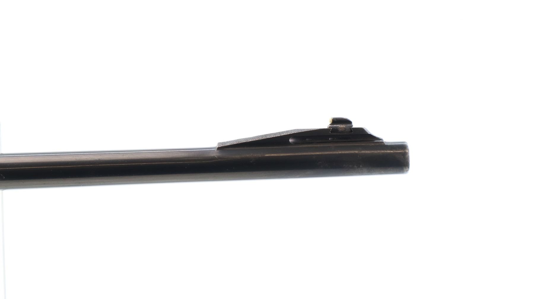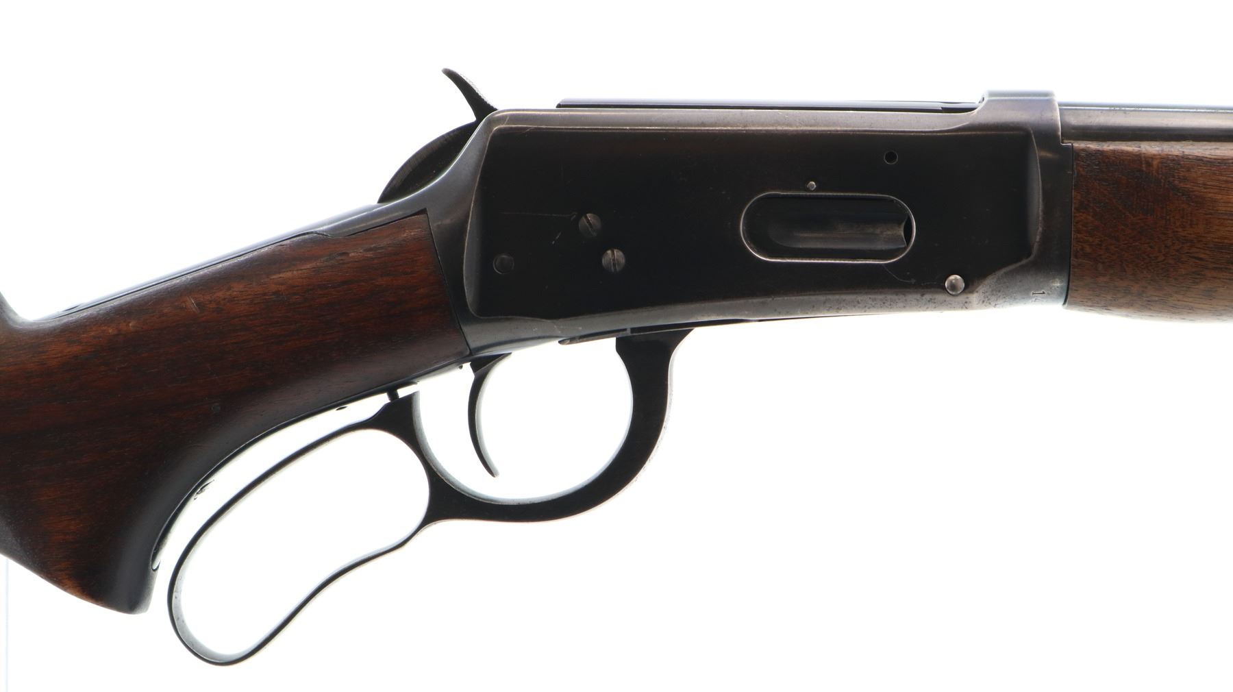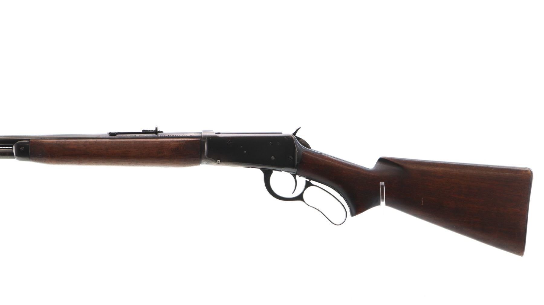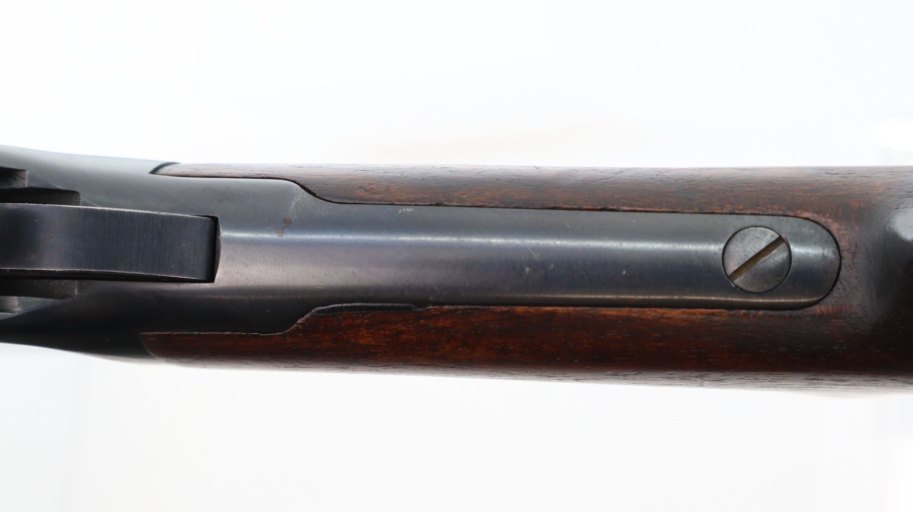 Main Description: Manufactured 1948. Blade front sight with ramp, adjustable u notched rear sight, Approx. 80 percent blueing remaining, round barrel, grooved spur hammer. Two piece smooth wood stocks, pistol grip, checkered steel butt plate, 2/3rd length button magtube.