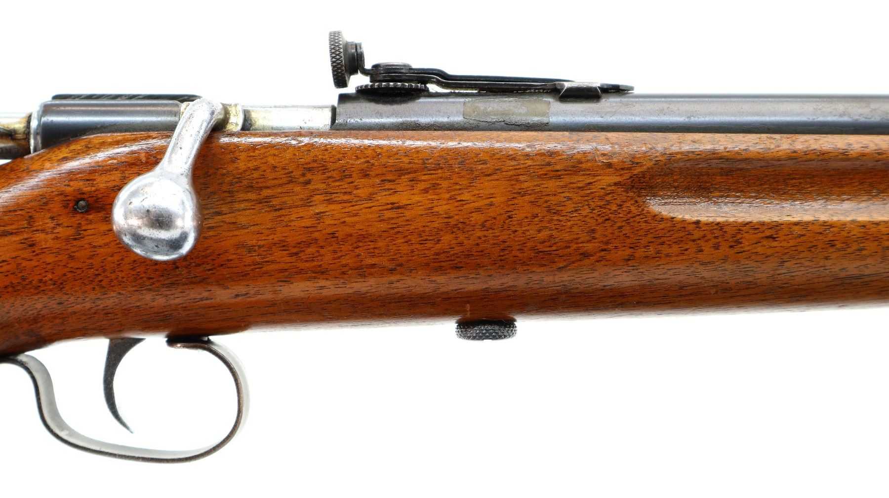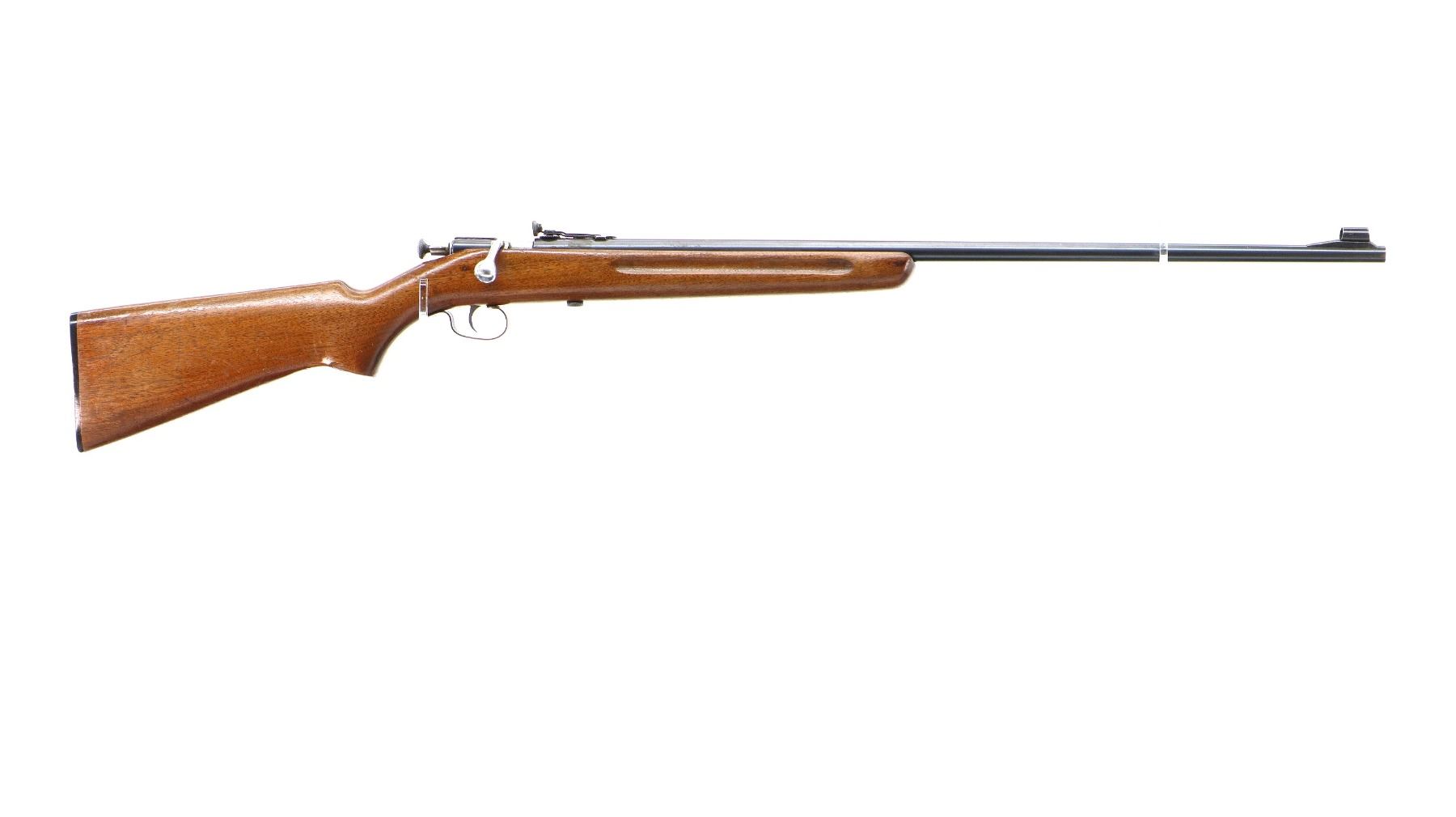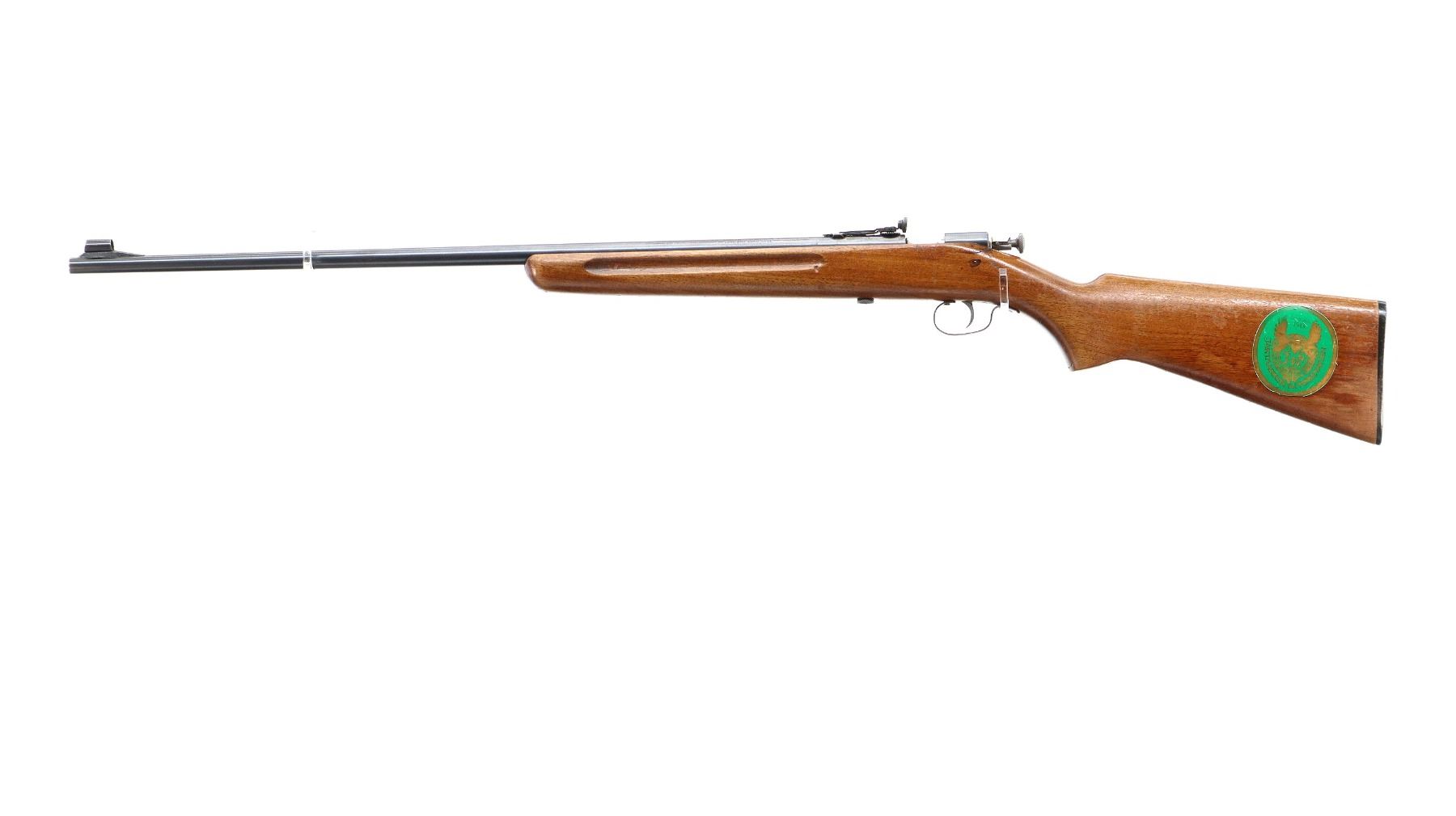 Main Description: Blade front sight with hood and ramp, adjustable rear peep sight, blued finish, smooth bolt knob, extractor is present. One piece wood stock, finger grooved forearm, pistol grip, checkered black polymer butt plate, large sticker on left side of stock.