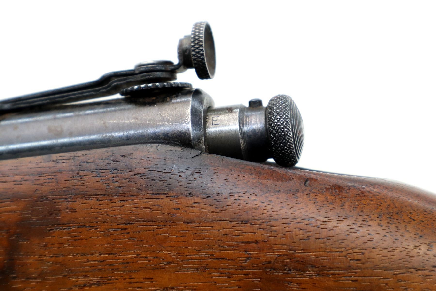 Main Description: Blade front sight with ramp, adjustable rear peep sight, blued finish, round bolt knob. One piece wood stock, pistol grip, checkered black polymer butt plate.