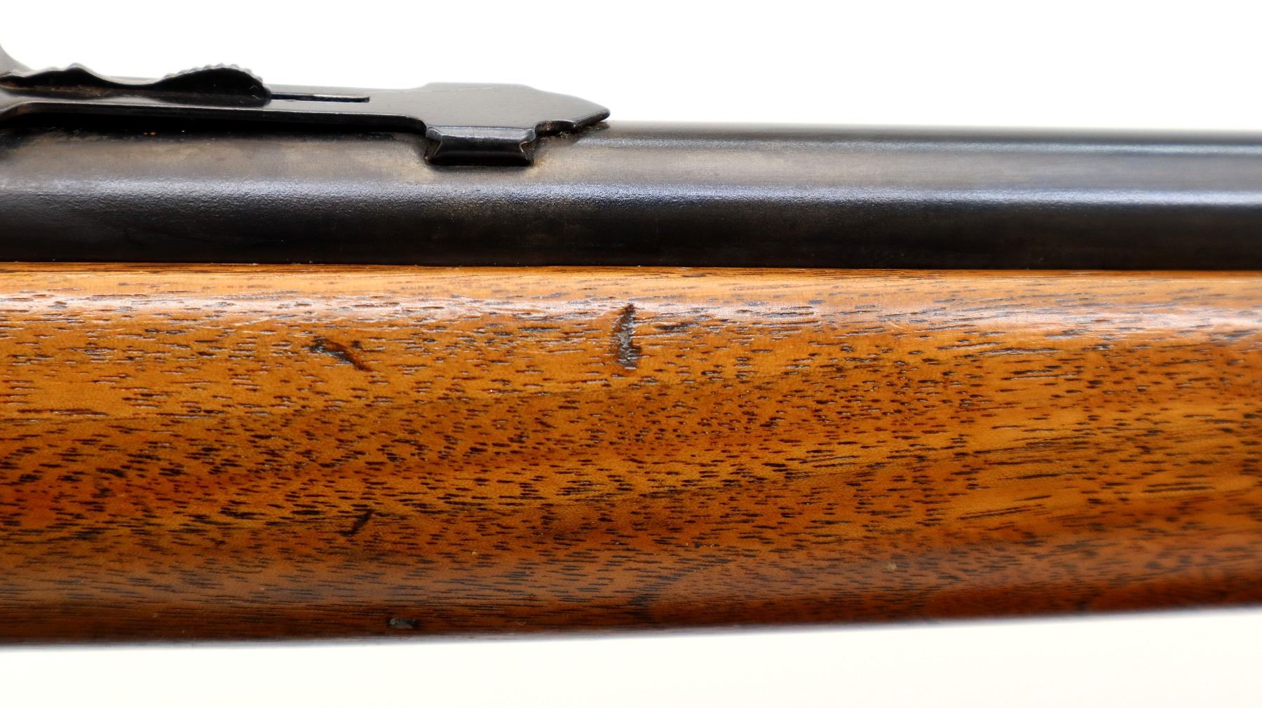 Main Description: Blade front sight, adjustable u notched rear sight, metal has been reblued. One piece refinished wood stock, forend tip is cracked, pistol grip, checkered black polymer butt plate.
