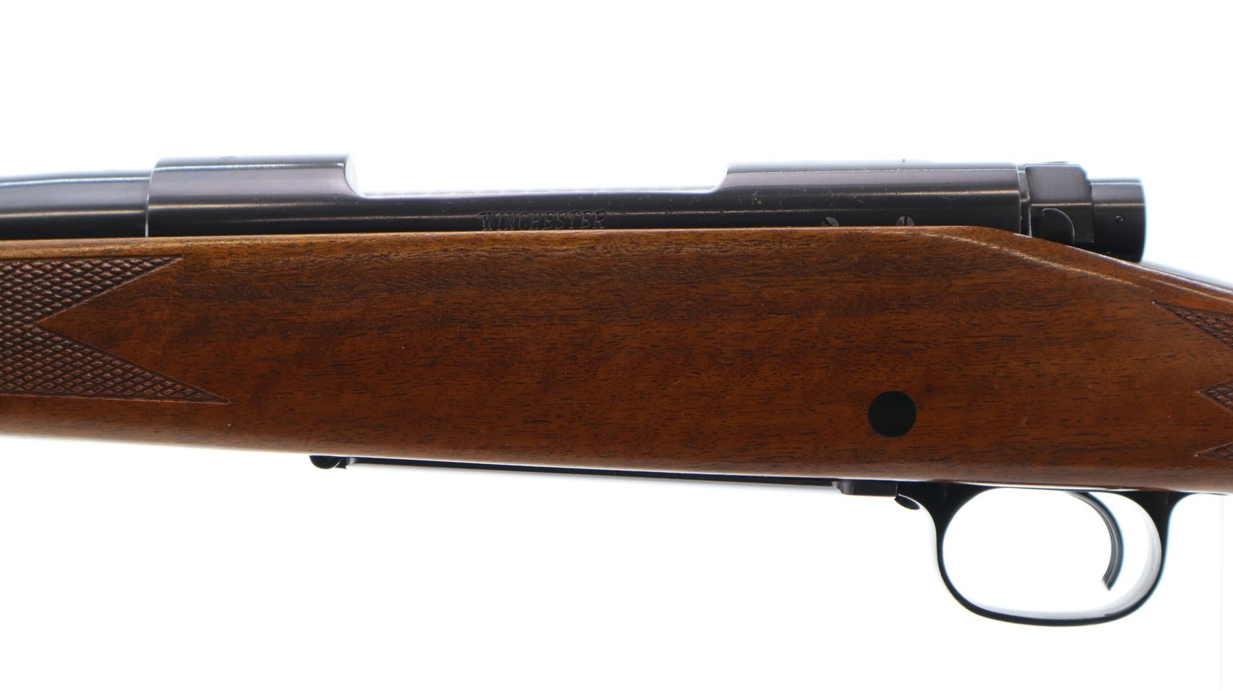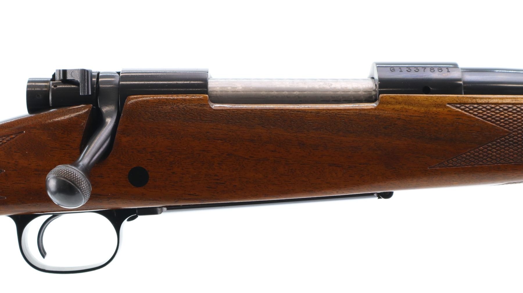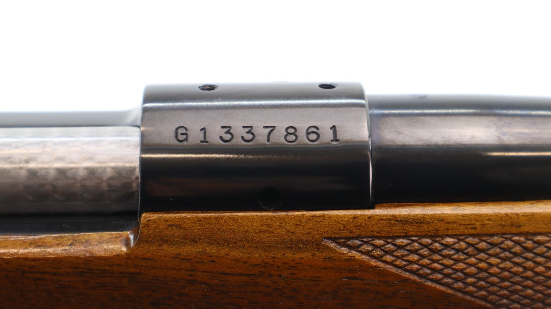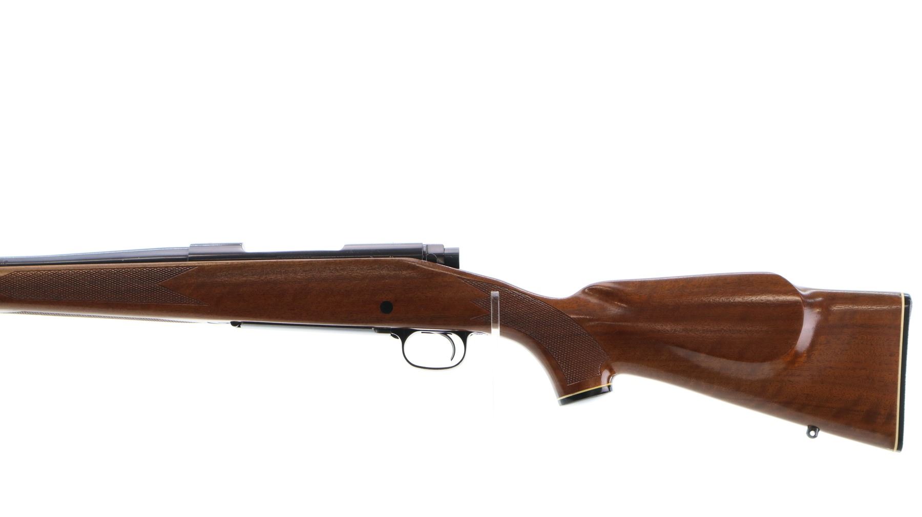 Main Description: Missing front and rear sights, threaded holes filled with plug screws, blued finish, receiver drilled and tapped with no plug screws installed, jewelled pushfeed bolt with checkered knob. One piece wood stock, black polymer forend and pistol grip caps, checkered forearm and pistol grip, cheek rest, checkered black polymer butt plate, hinged floor plate, swivel studs.
