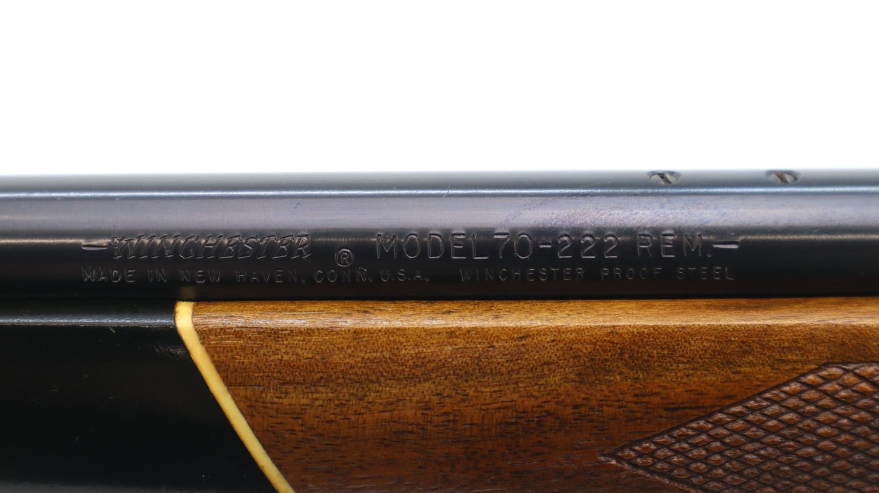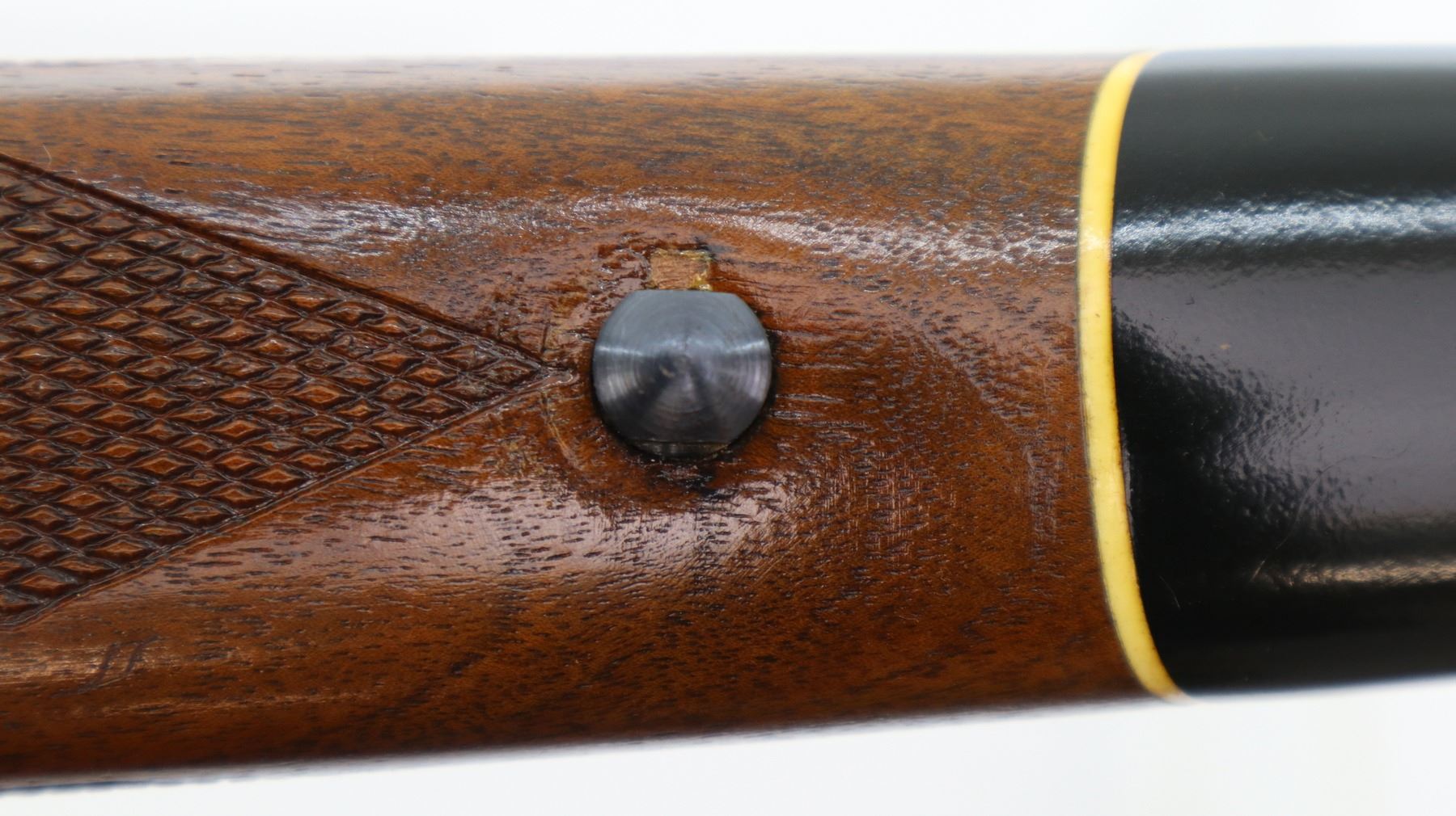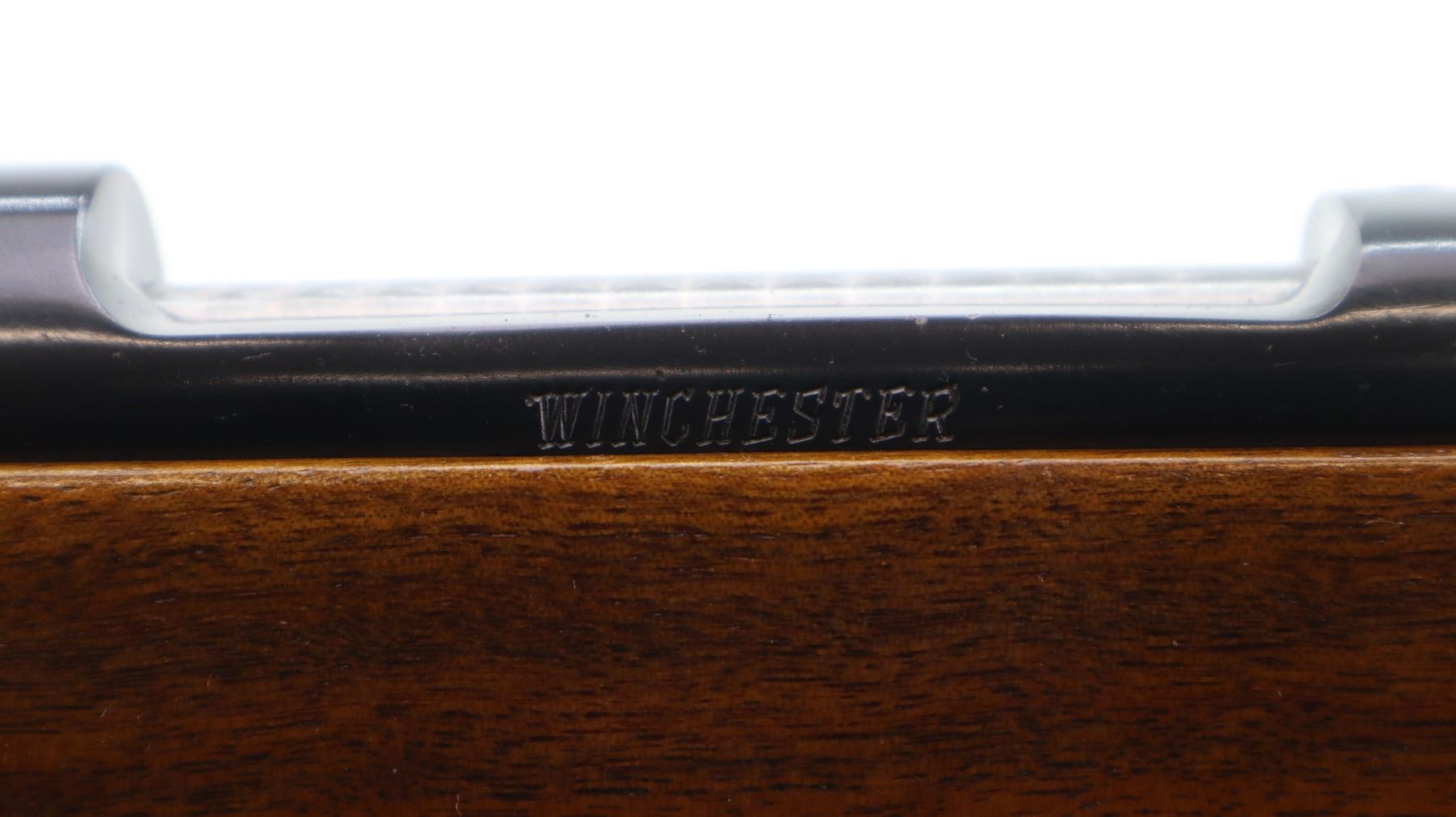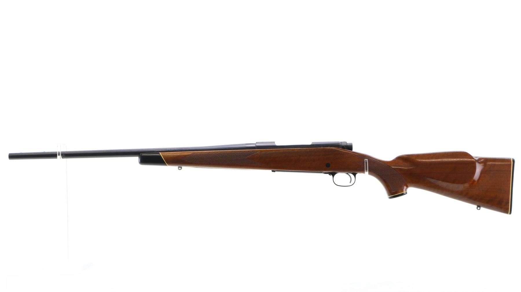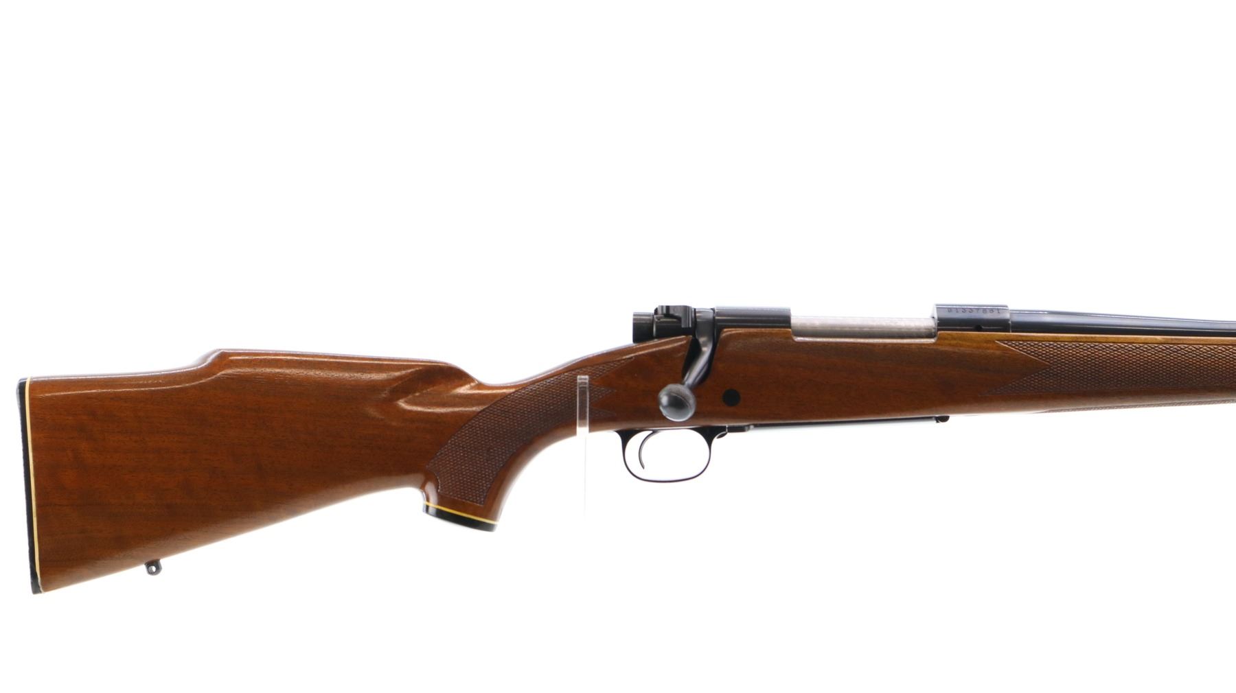 Main Description: Missing front and rear sights, threaded holes filled with plug screws, blued finish, receiver drilled and tapped with no plug screws installed, jewelled pushfeed bolt with checkered knob. One piece wood stock, black polymer forend and pistol grip caps, checkered forearm and pistol grip, cheek rest, checkered black polymer butt plate, hinged floor plate, swivel studs.