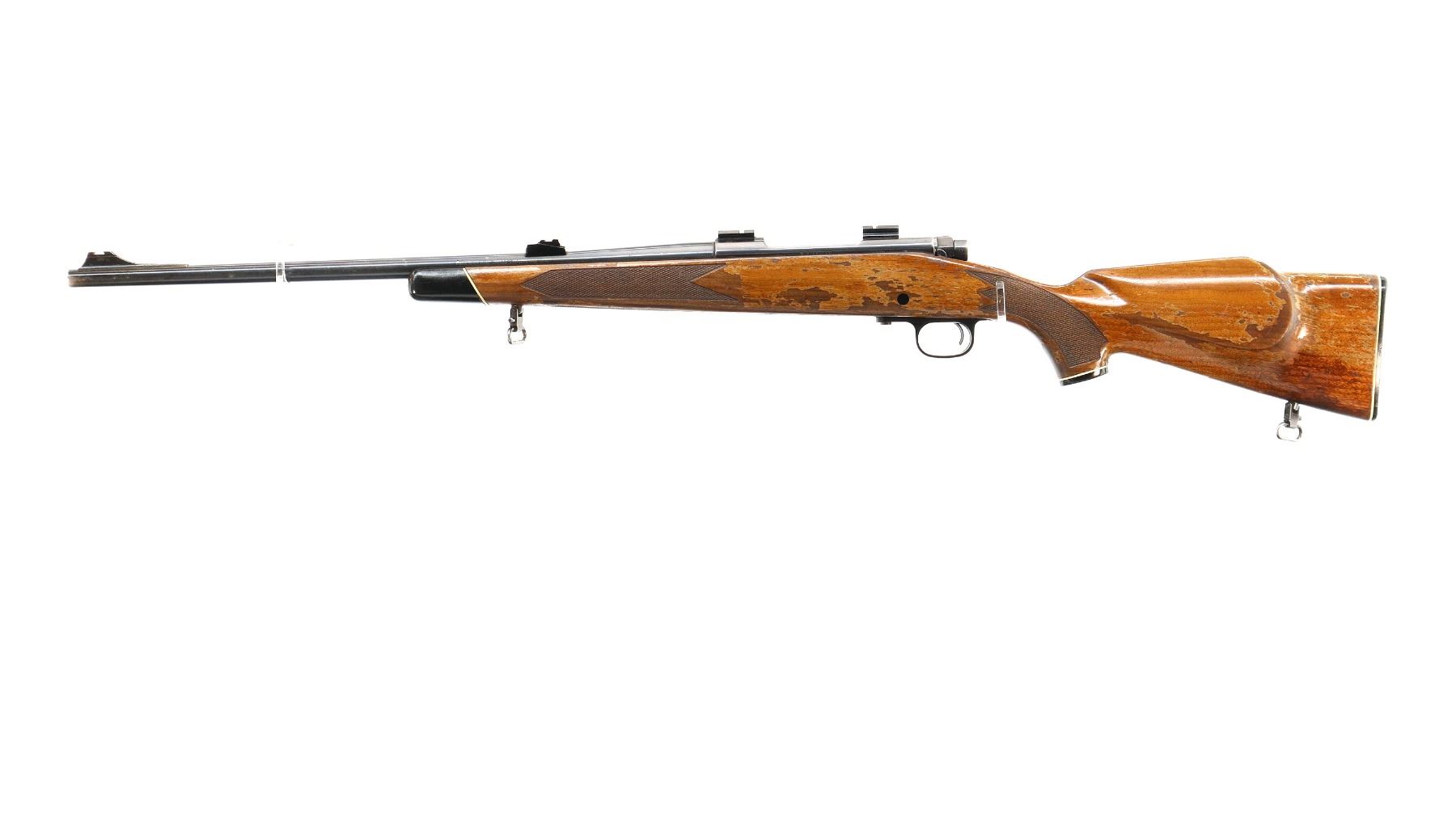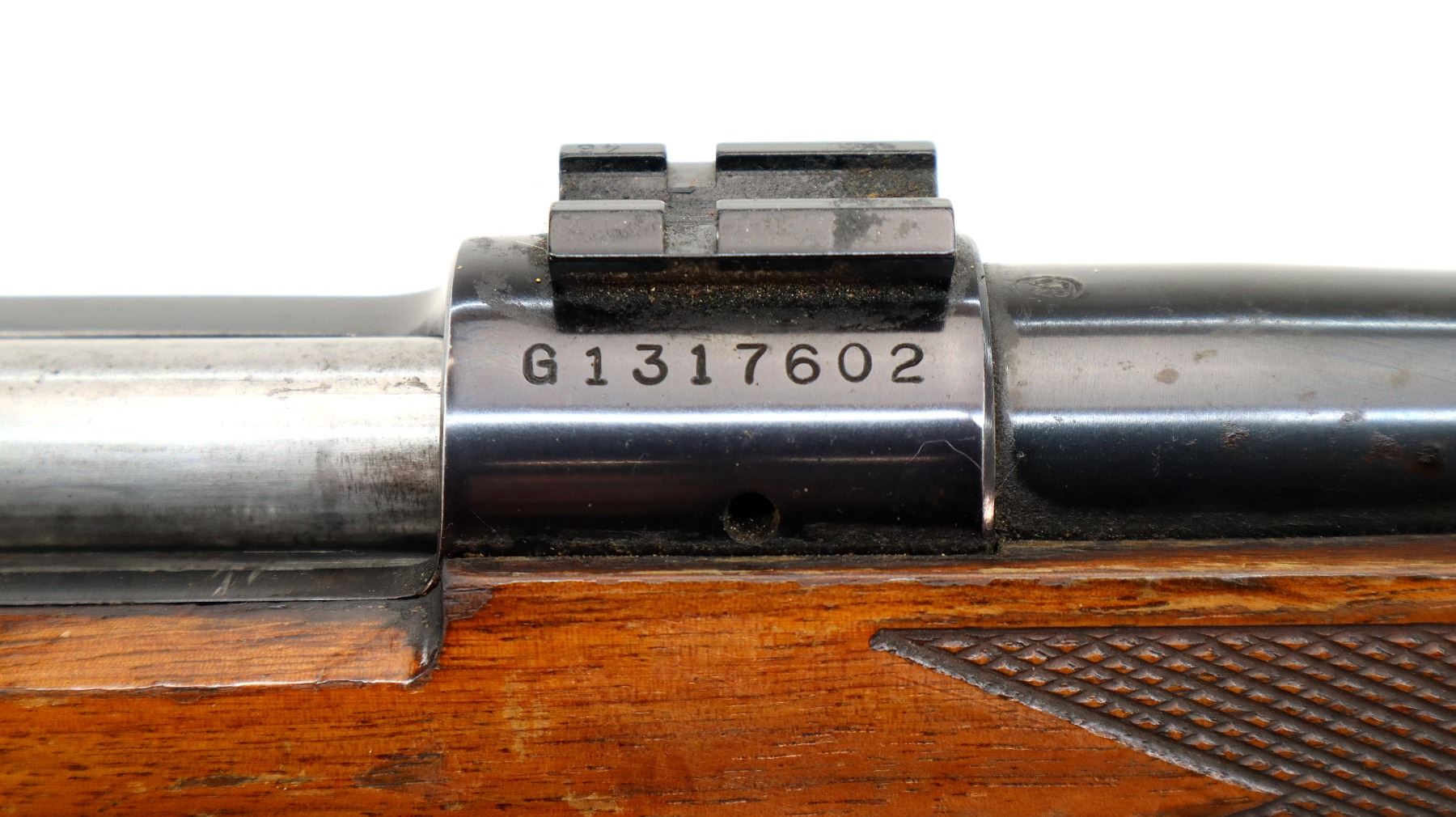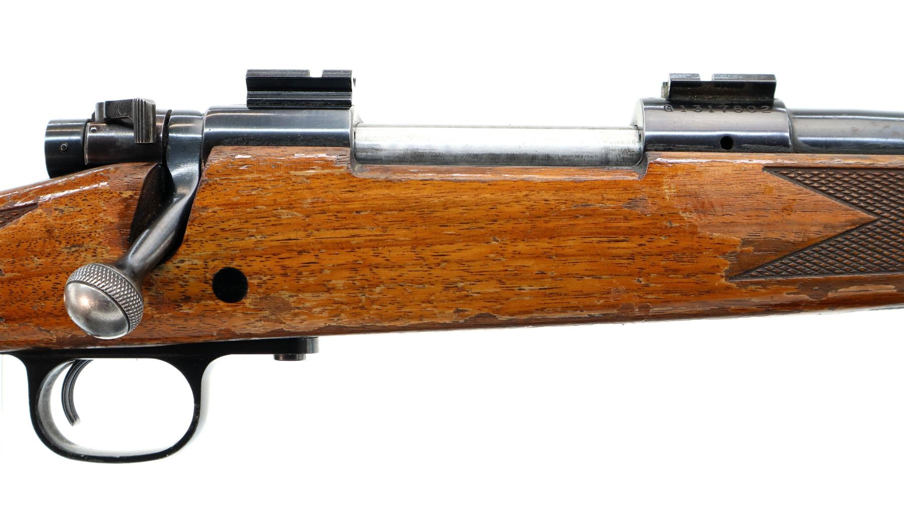 Main Description: Manufactured 1977. Missing front sight blade ramp is present, adjustable rear sight missing the u notched blade, blued finish, receiver drilled and tapped with two piece scope bases installed, checkered bolt knob. One piece wood stock, black polymer forend and pistol grip caps, checkered forearm, pistol grip and black polymer butt plate, cheek rest, missing hinged floor plate, follower and spring. Trigger guard is an incorrect replacement, has sling swivels.