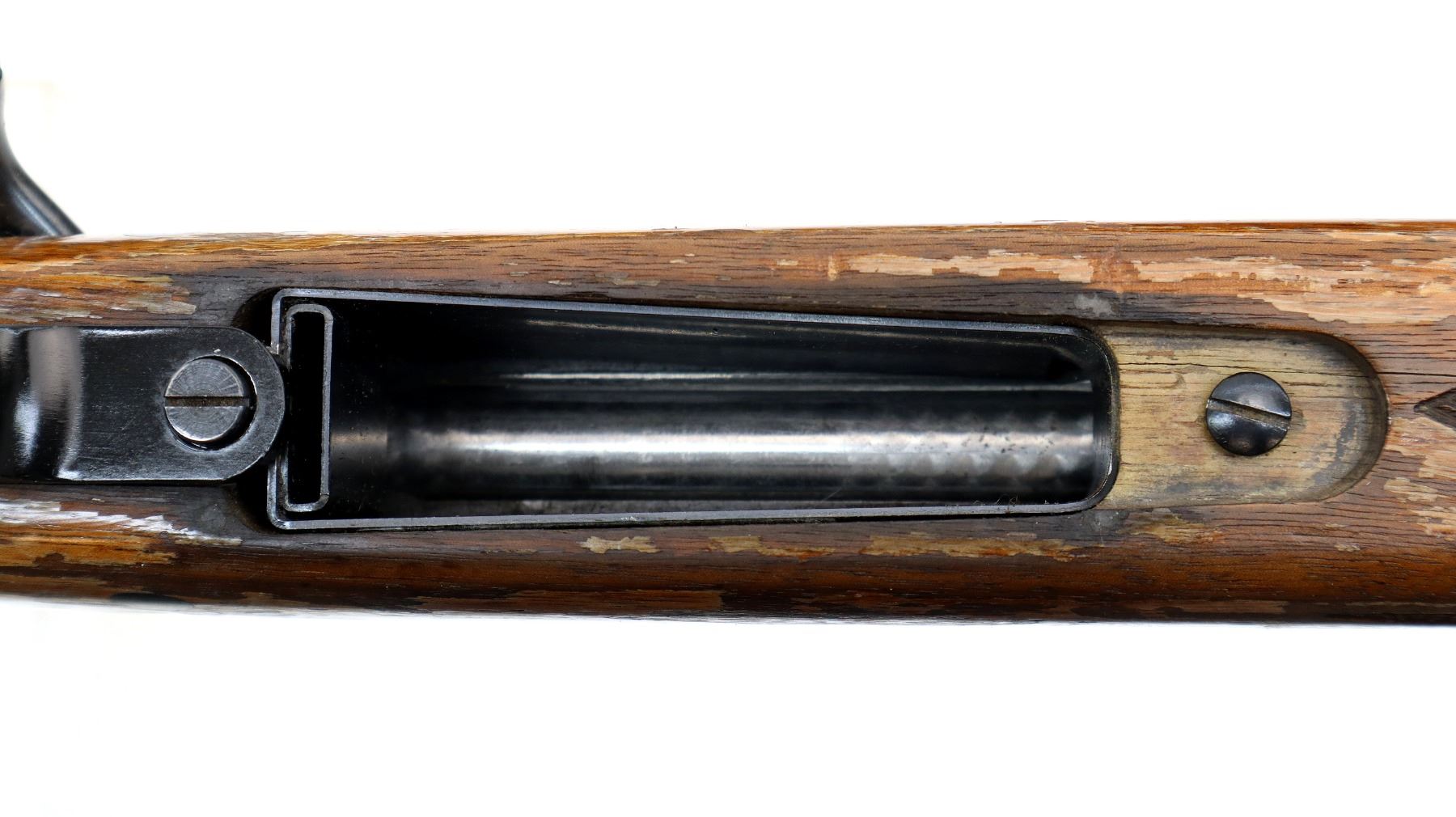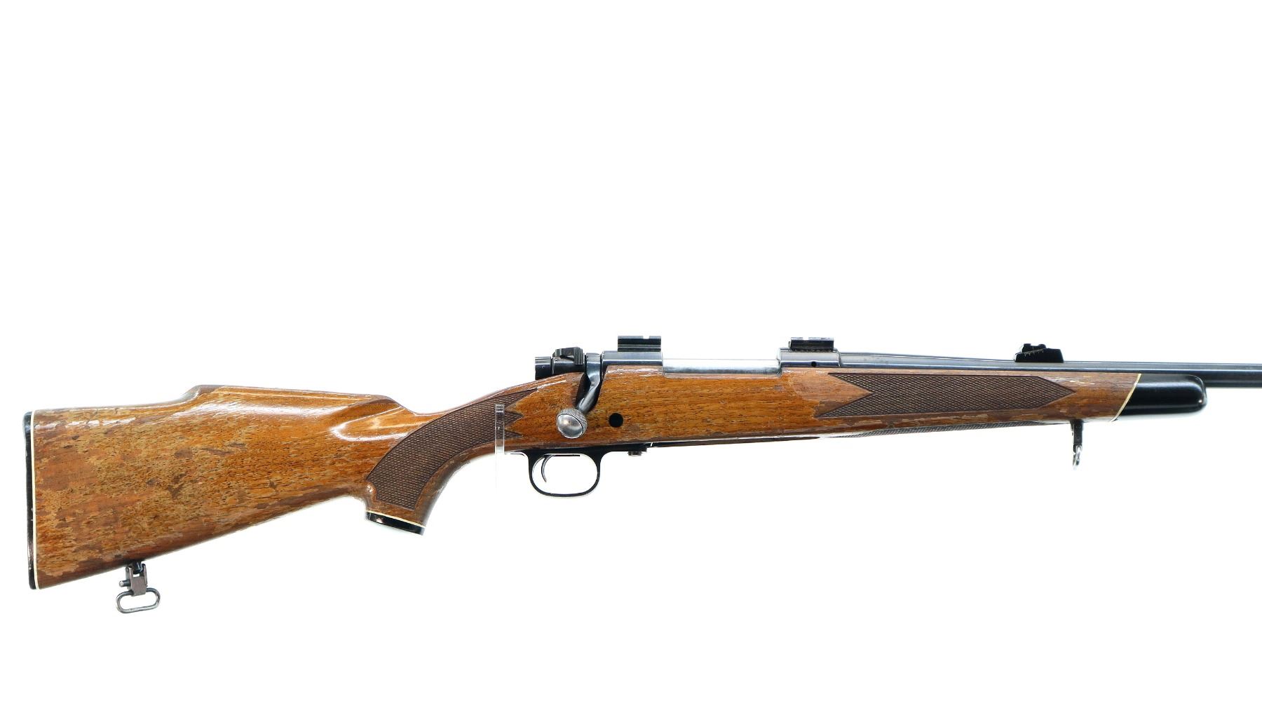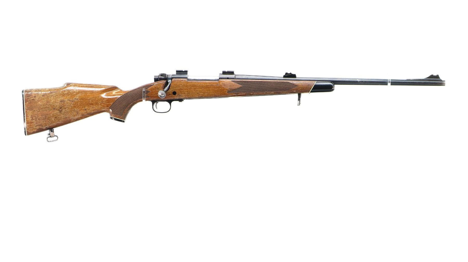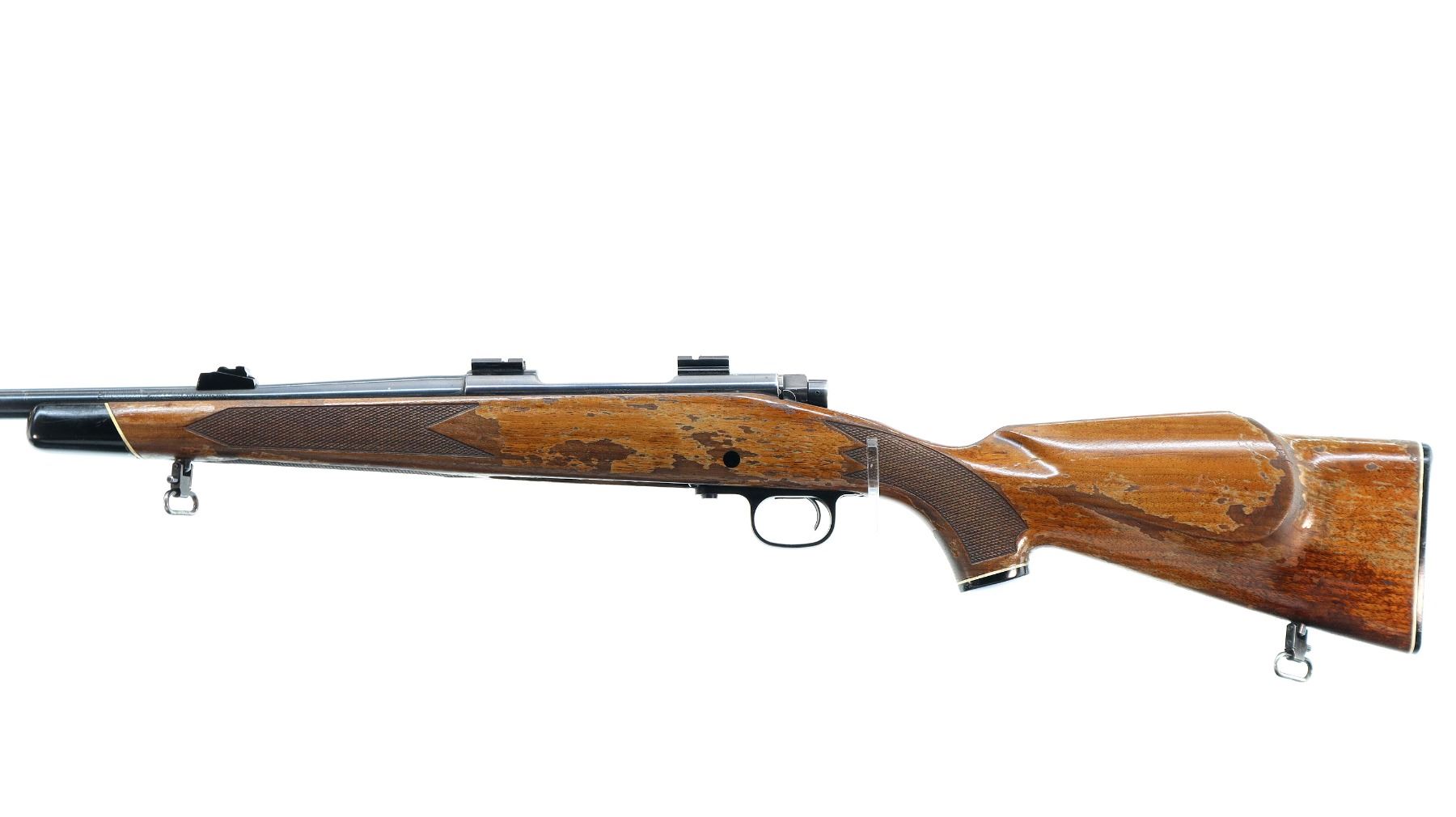 Main Description: Manufactured 1977. Missing front sight blade ramp is present, adjustable rear sight missing the u notched blade, blued finish, receiver drilled and tapped with two piece scope bases installed, checkered bolt knob. One piece wood stock, black polymer forend and pistol grip caps, checkered forearm, pistol grip and black polymer butt plate, cheek rest, missing hinged floor plate, follower and spring. Trigger guard is an incorrect replacement, has sling swivels.
