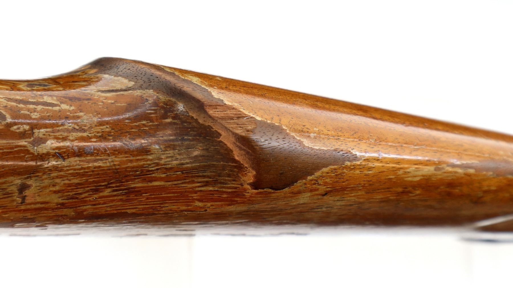 Wear: Metal finish shows some light rust speckles, scratches, handling marks and wear. Stock shows marks, scratches and finish wear.