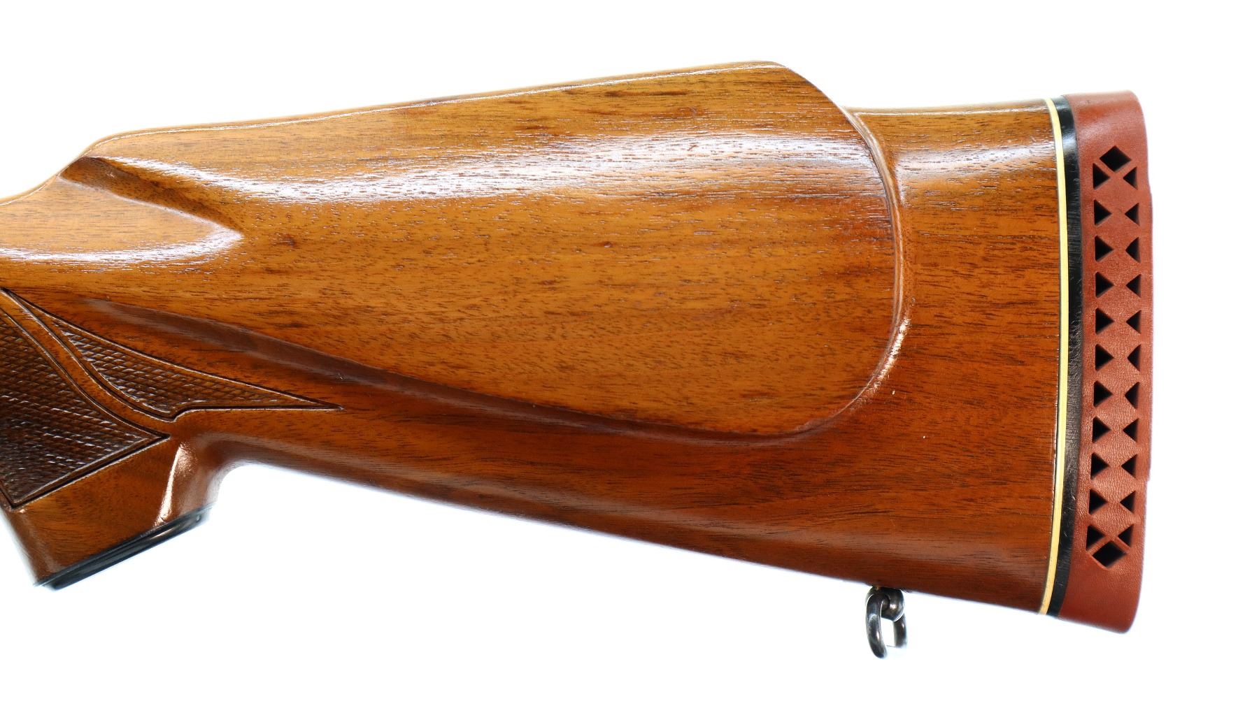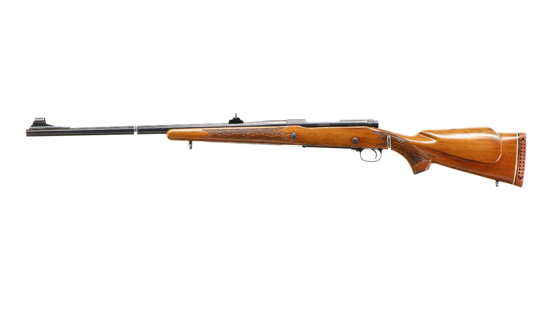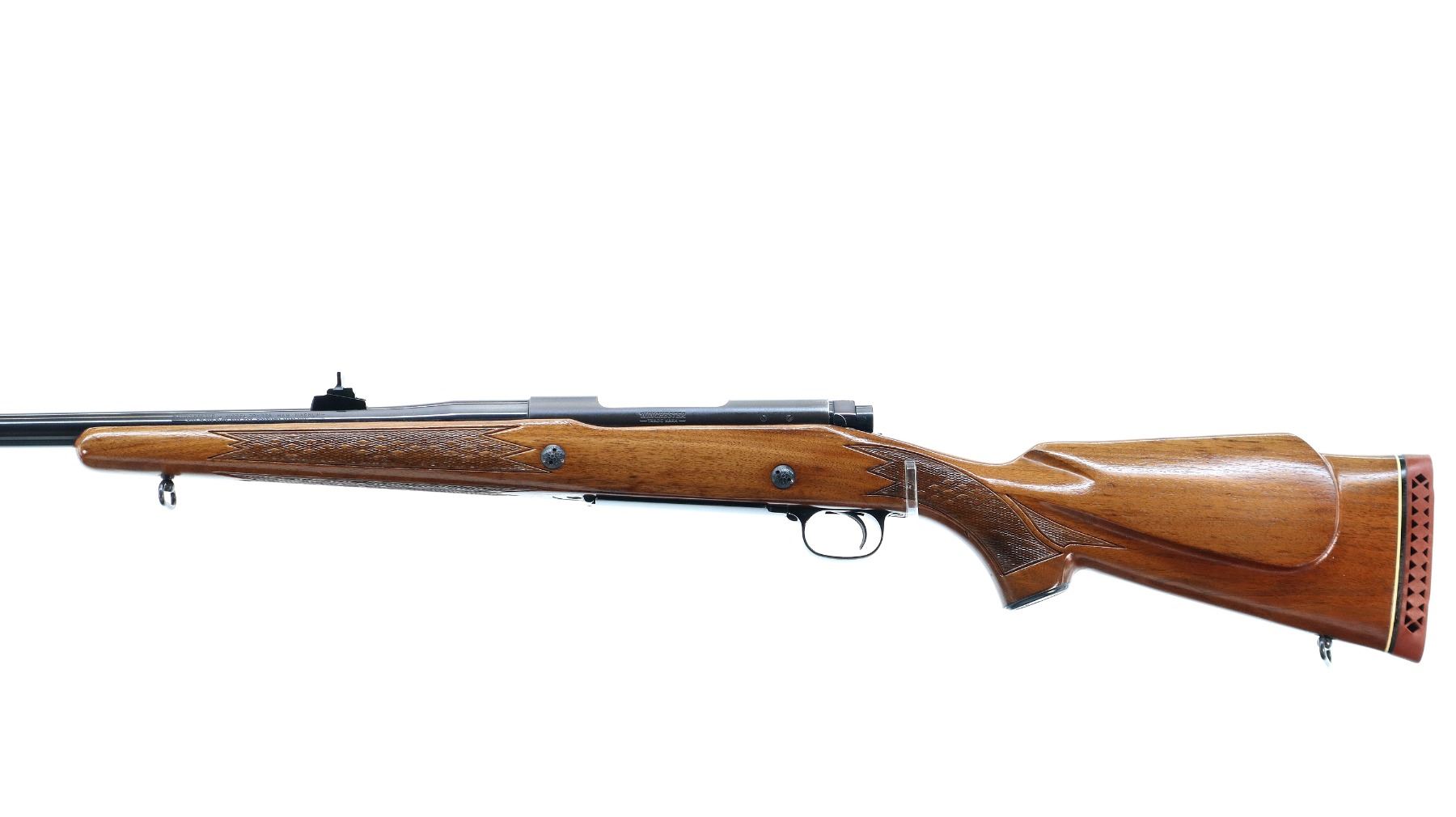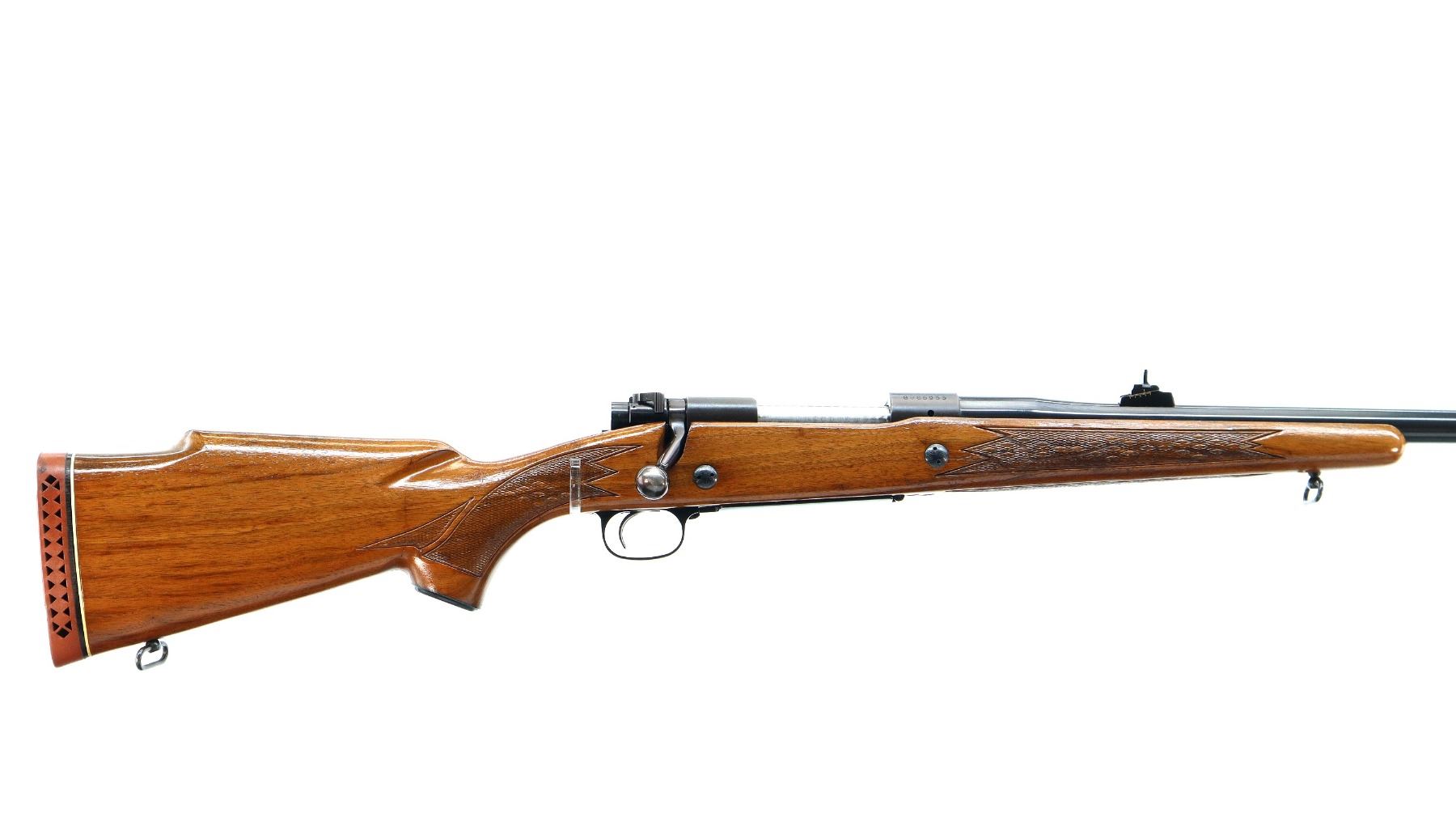 Main Description: Manufactured 1970. Blade front sight with hood and ramp, adjustable u notched rear sight, polish blued barrel, Satin finish receiver drilled and tapped with plug screws installed, jeweled bolt with smooth knob. One piece wood stock, checkered forearm and pistol grip, cheek rest, red vented rubber recoil, 13.5" LOP, steel grip cap, hinged floor plate, sling swivels.