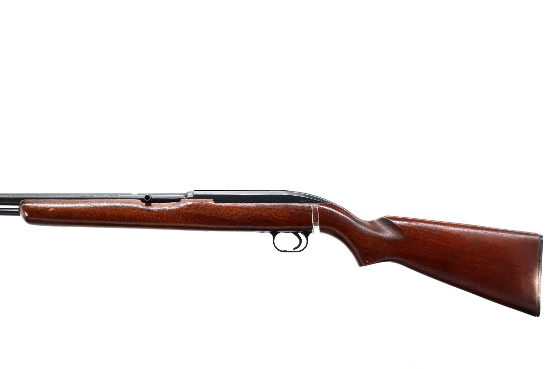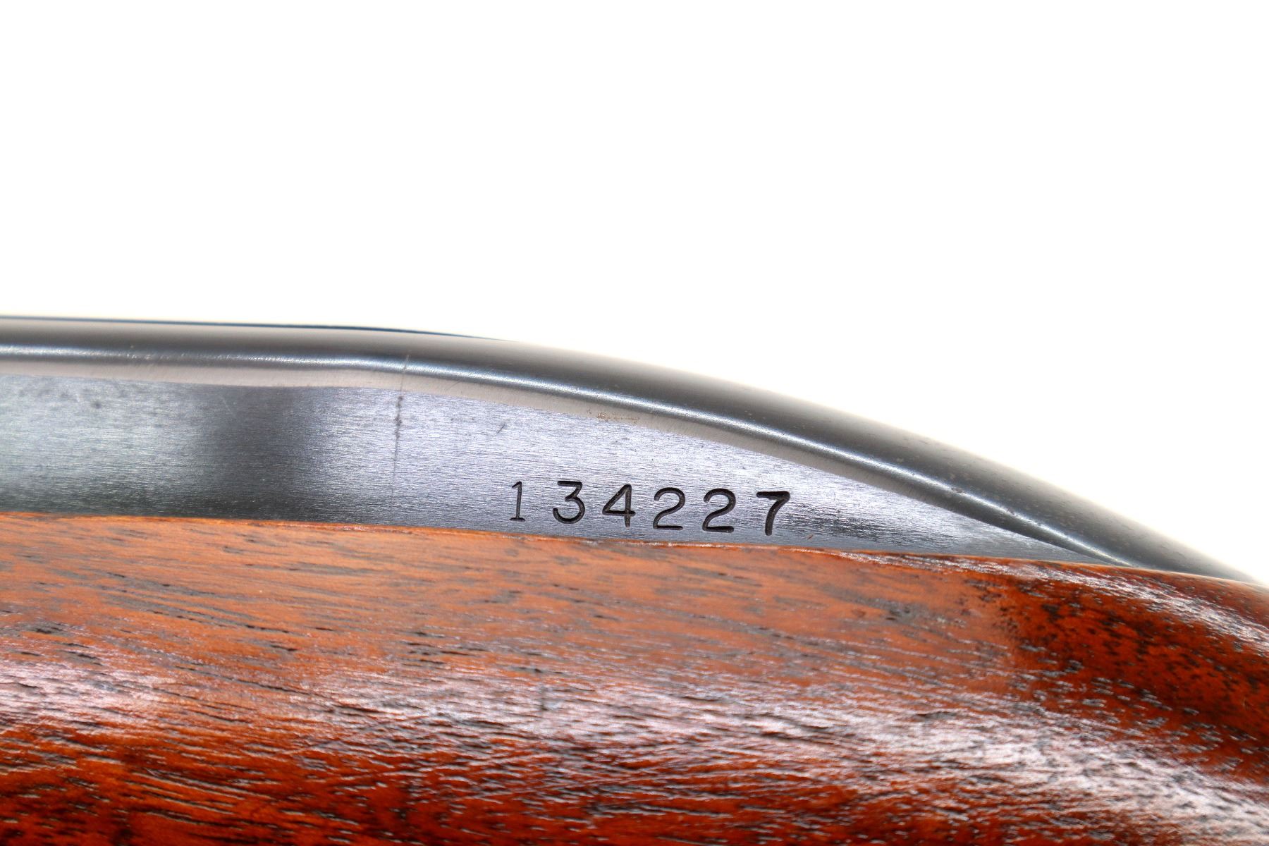 Main Description: Missing front and rear sights dovetails present, blued finish, grooved receiver. One piece wood stock, pistol grip, checkered black polymer butt plate.
