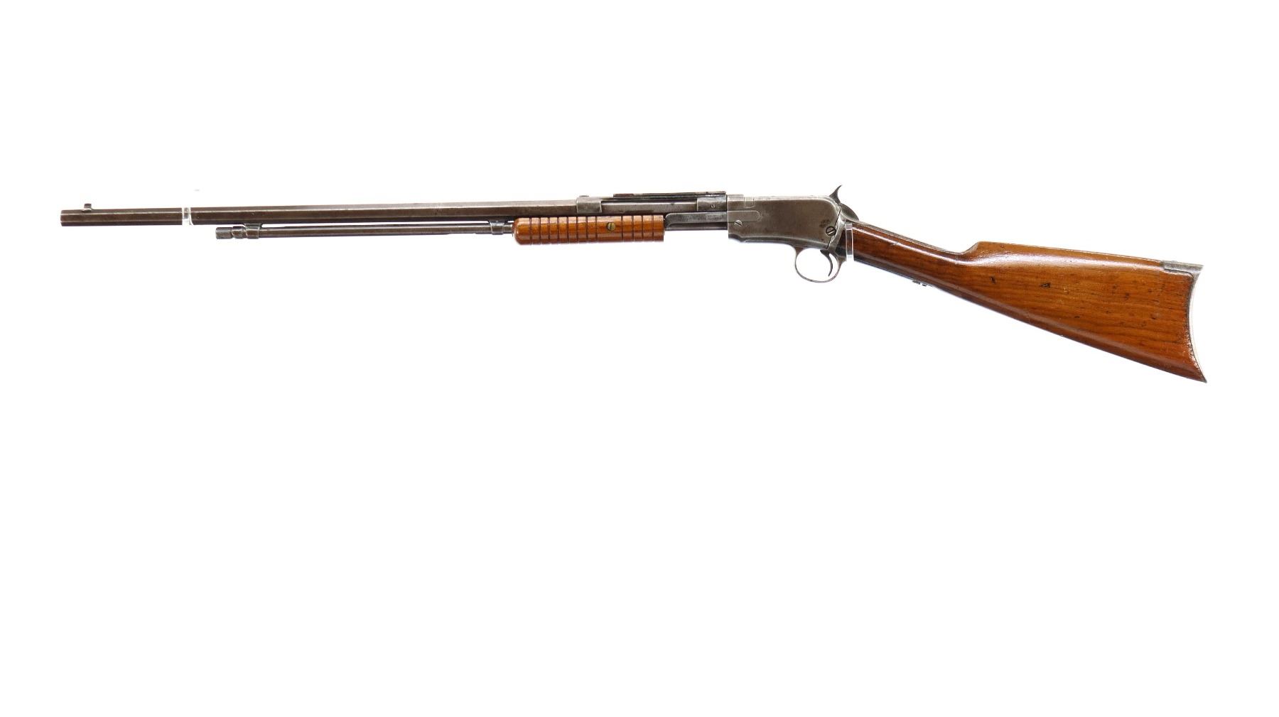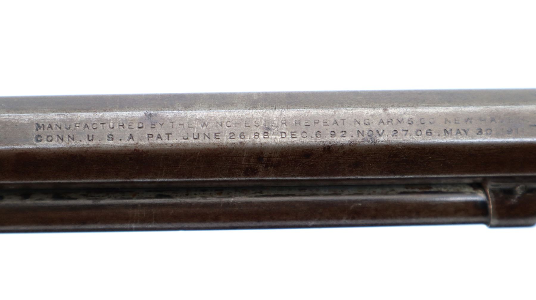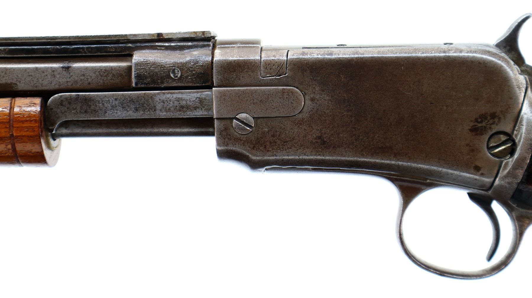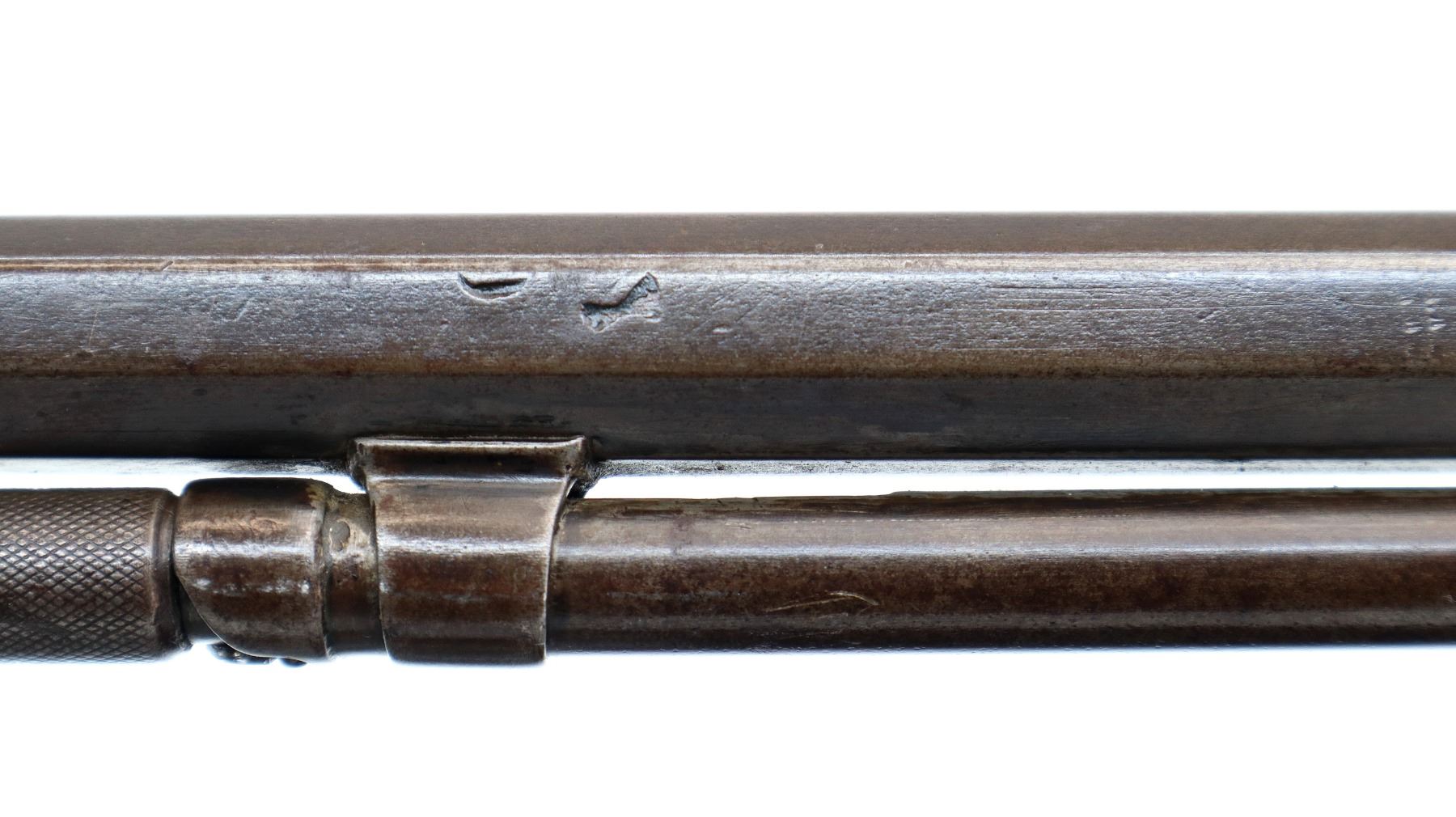Main Description: Blade front sight, no rear sight, octagon barrel with custom scope mount installed, checkered spur hammer, lifter has holes drilled in it. Two piece wood stocks, grooved forearm, straight grip, smooth curved steel butt plate, stock chipped at toe, 3/4 length magtube.