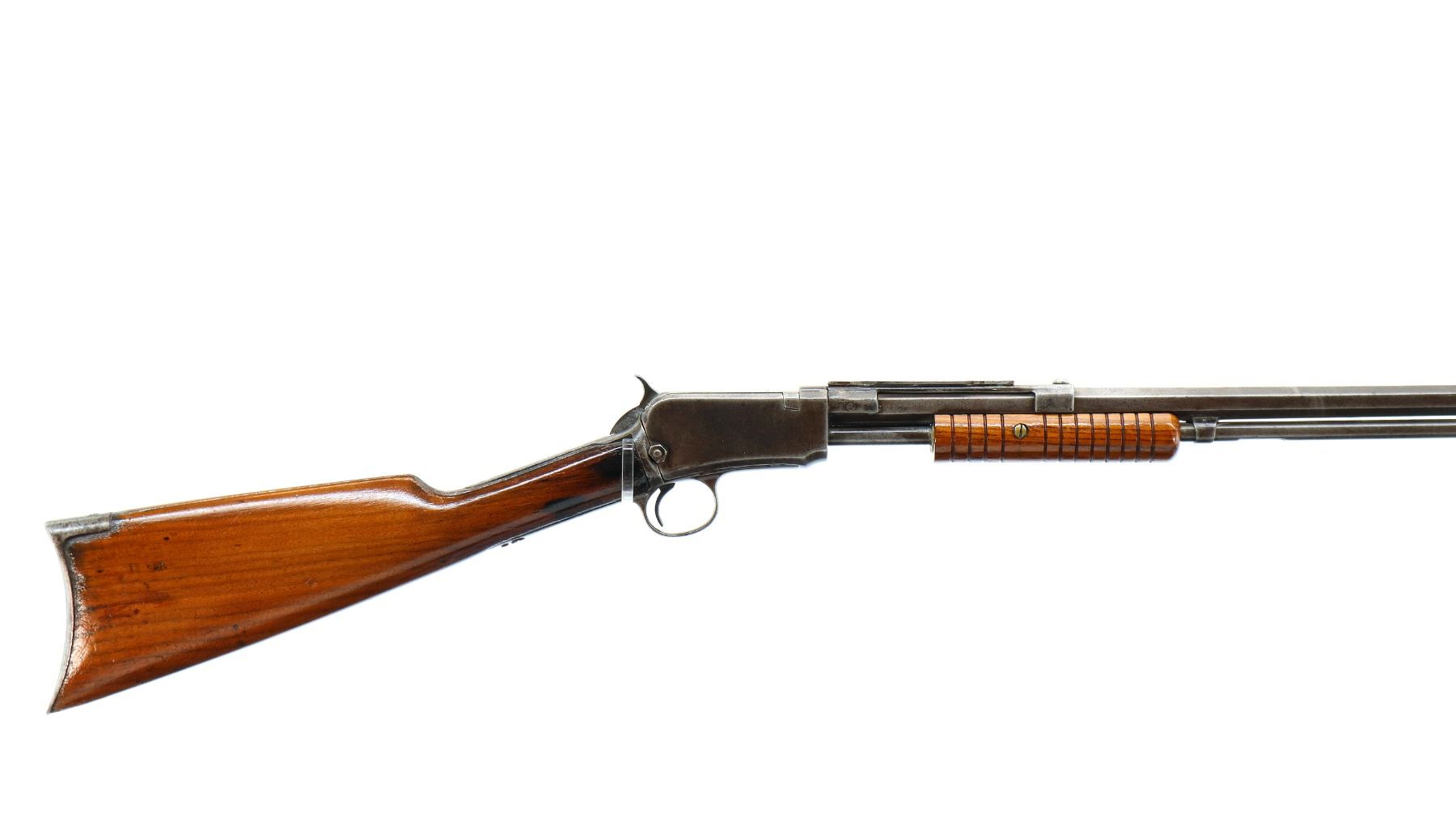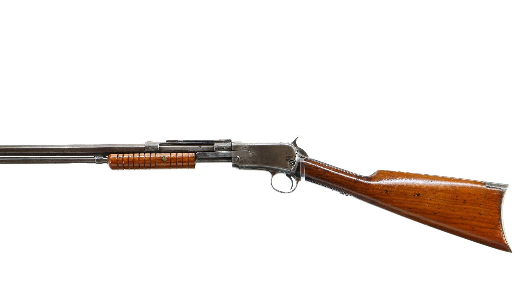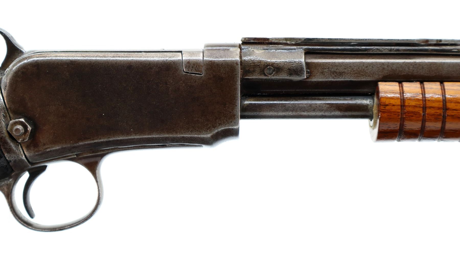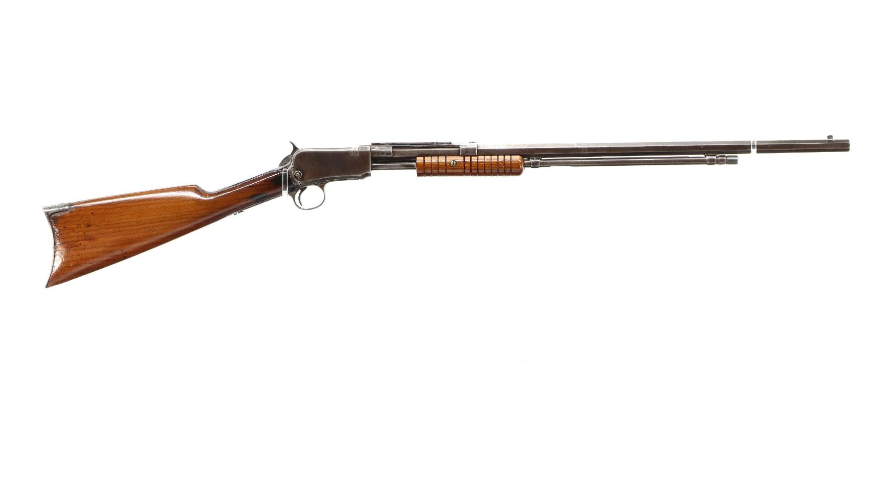 Main Description: Blade front sight, no rear sight, octagon barrel with custom scope mount installed, checkered spur hammer, lifter has holes drilled in it. Two piece wood stocks, grooved forearm, straight grip, smooth curved steel butt plate, stock chipped at toe, 3/4 length magtube.
