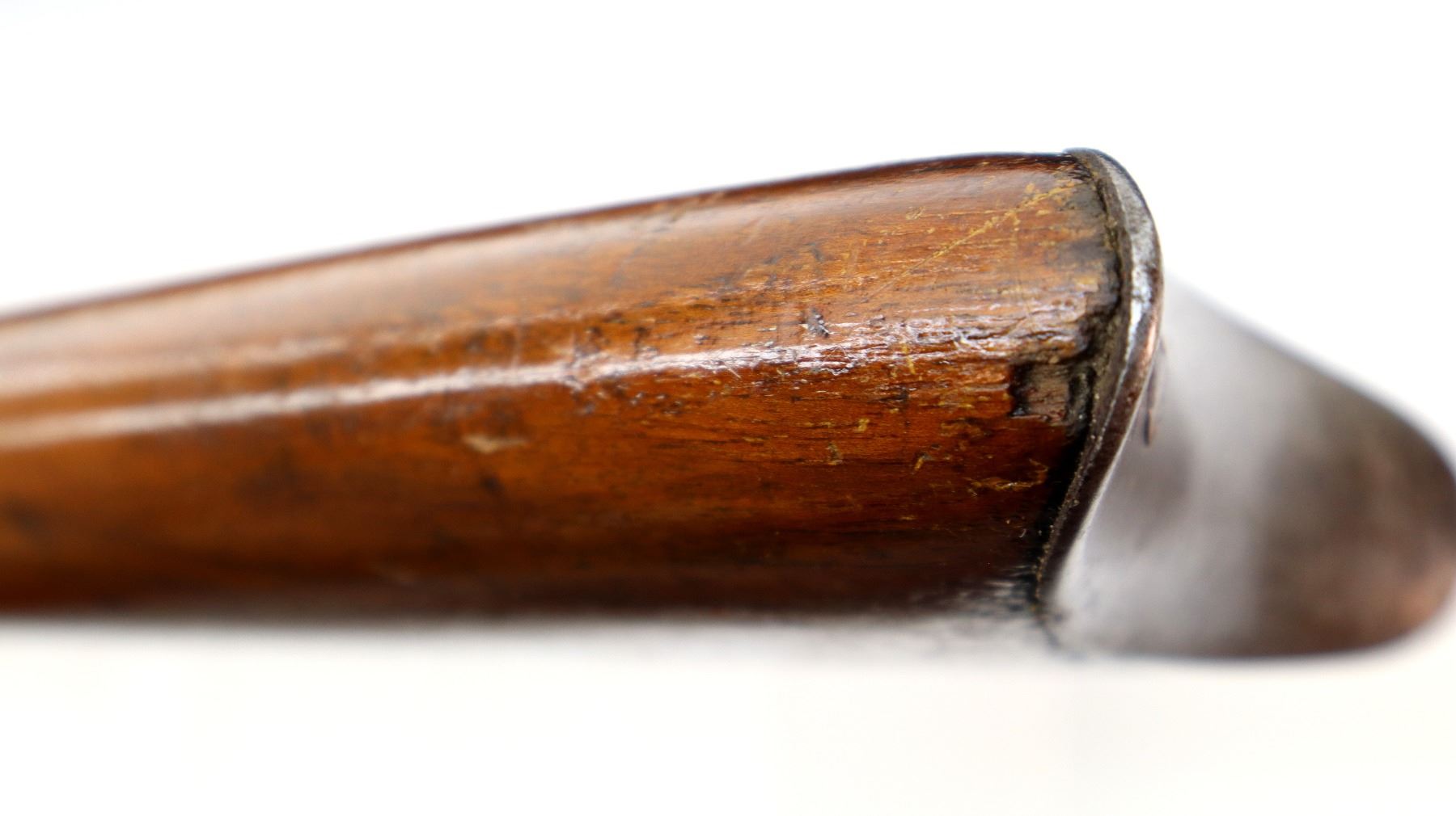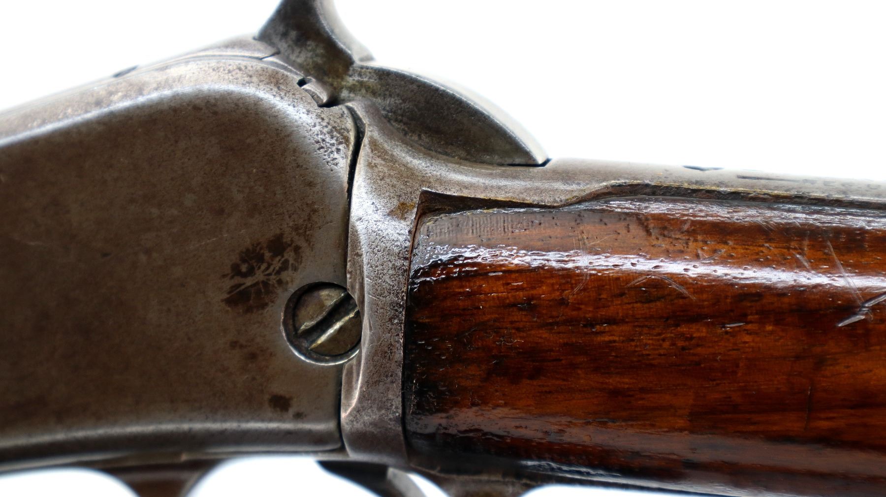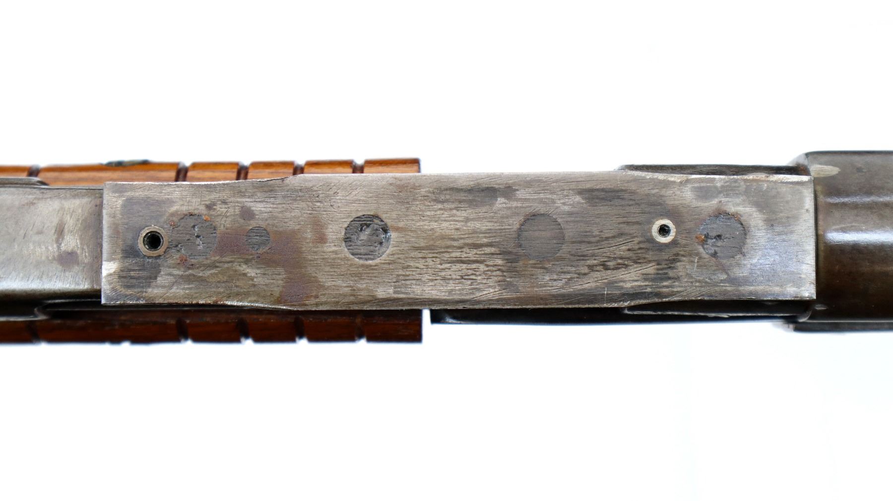 Wear: Metal finish turning silver grey with pitting, light rust speckles, scratches, handling marks and wear. Stocks show marks, scratches and wear.
