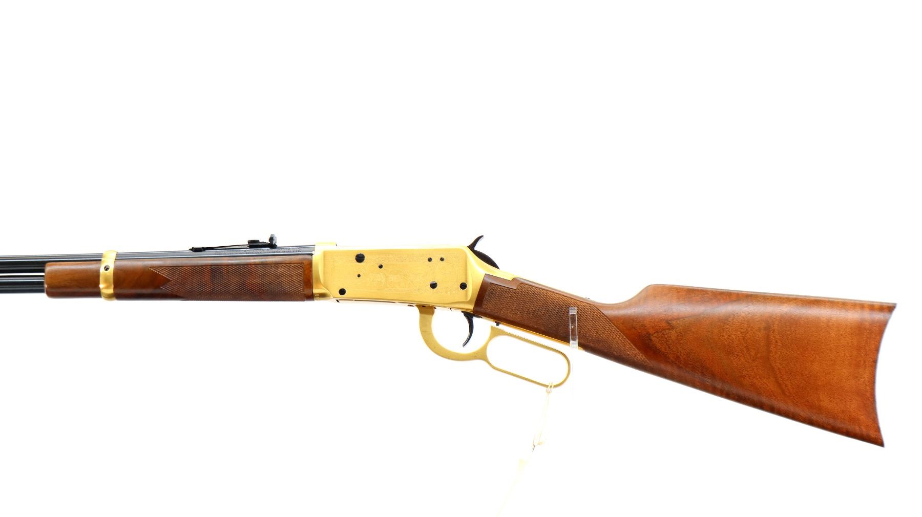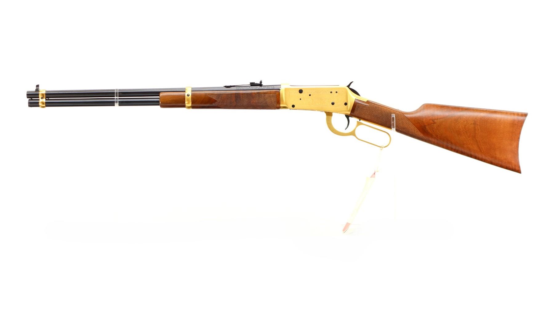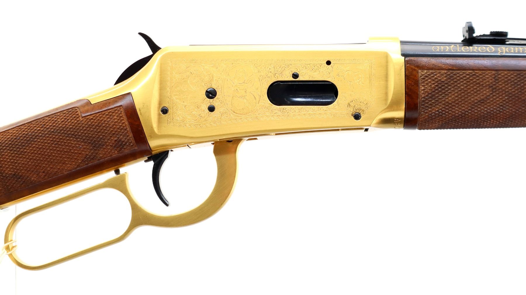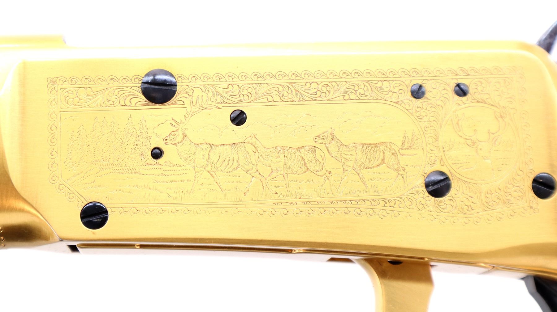 Main Description: Blade front sight, adjustable u notched rear sight, blued barrel, bolt and full length magtube, engraved gold game scene receiver, grooved spur hammer. Two piece wood stocks, checkered forearm and straight grip, smooth curved steel butt plate with some light rust around the edges, medallion in right side of stock, gold barrel bands, retains factory hang tag.