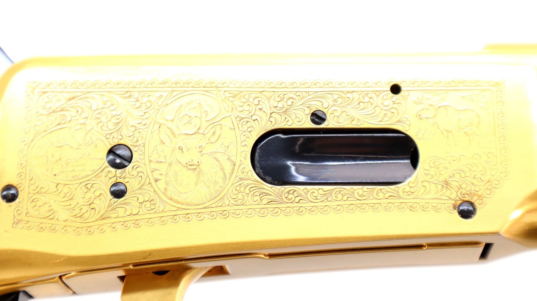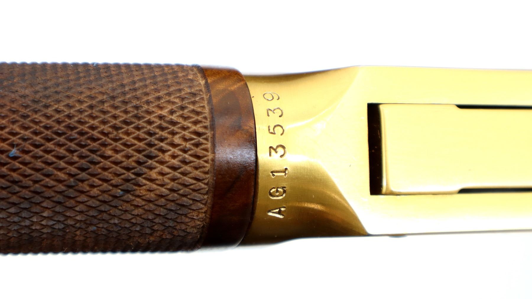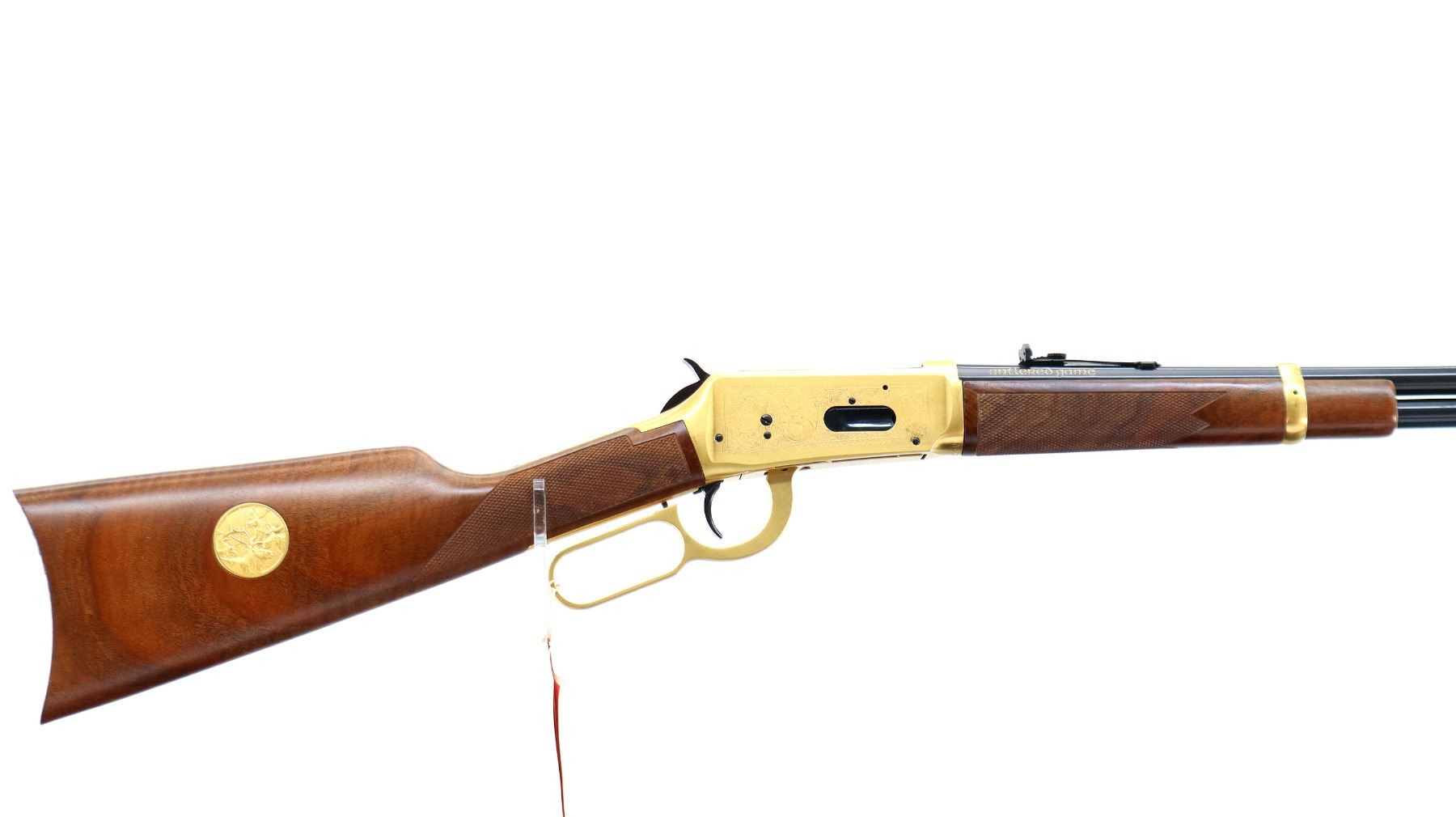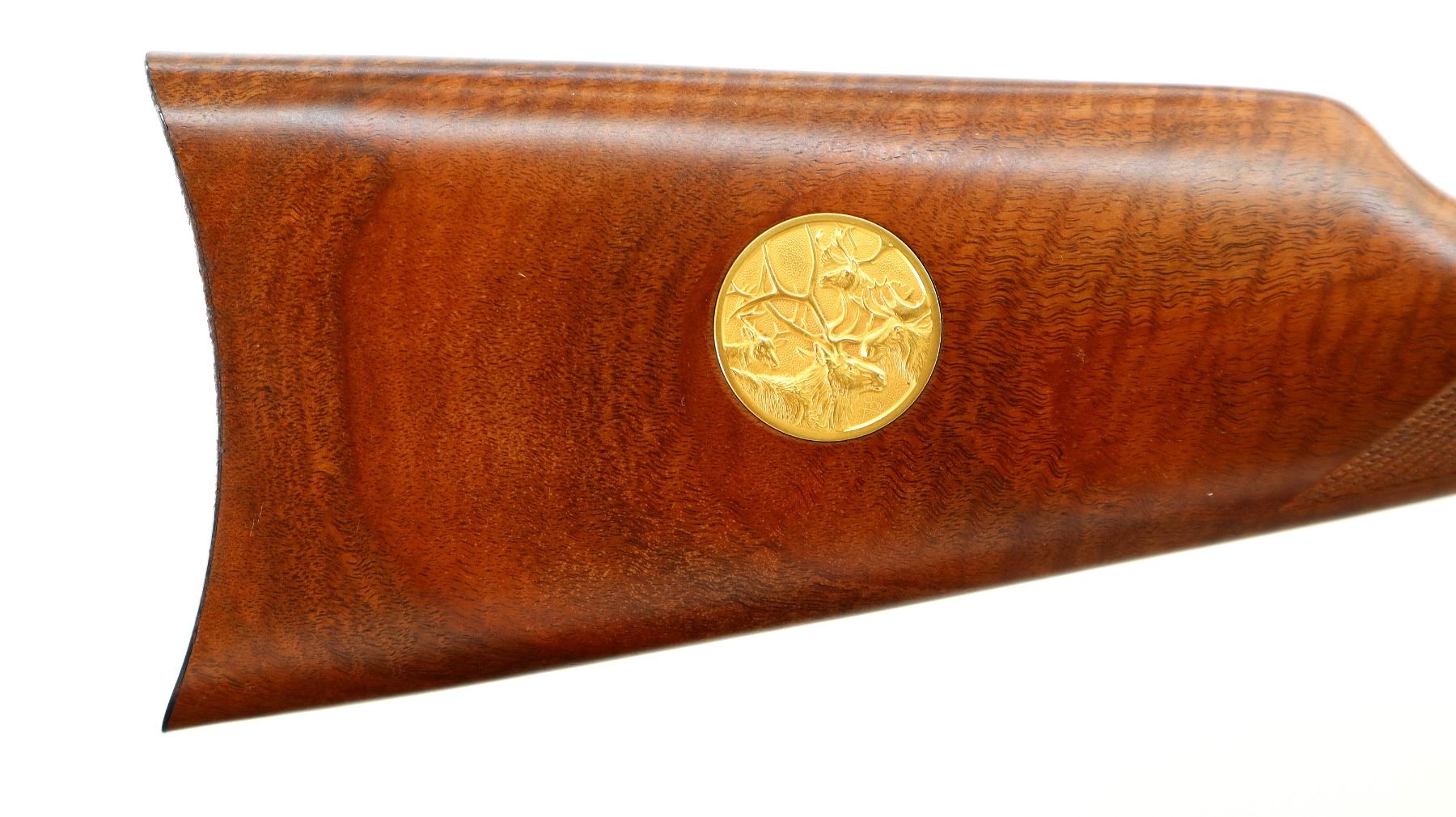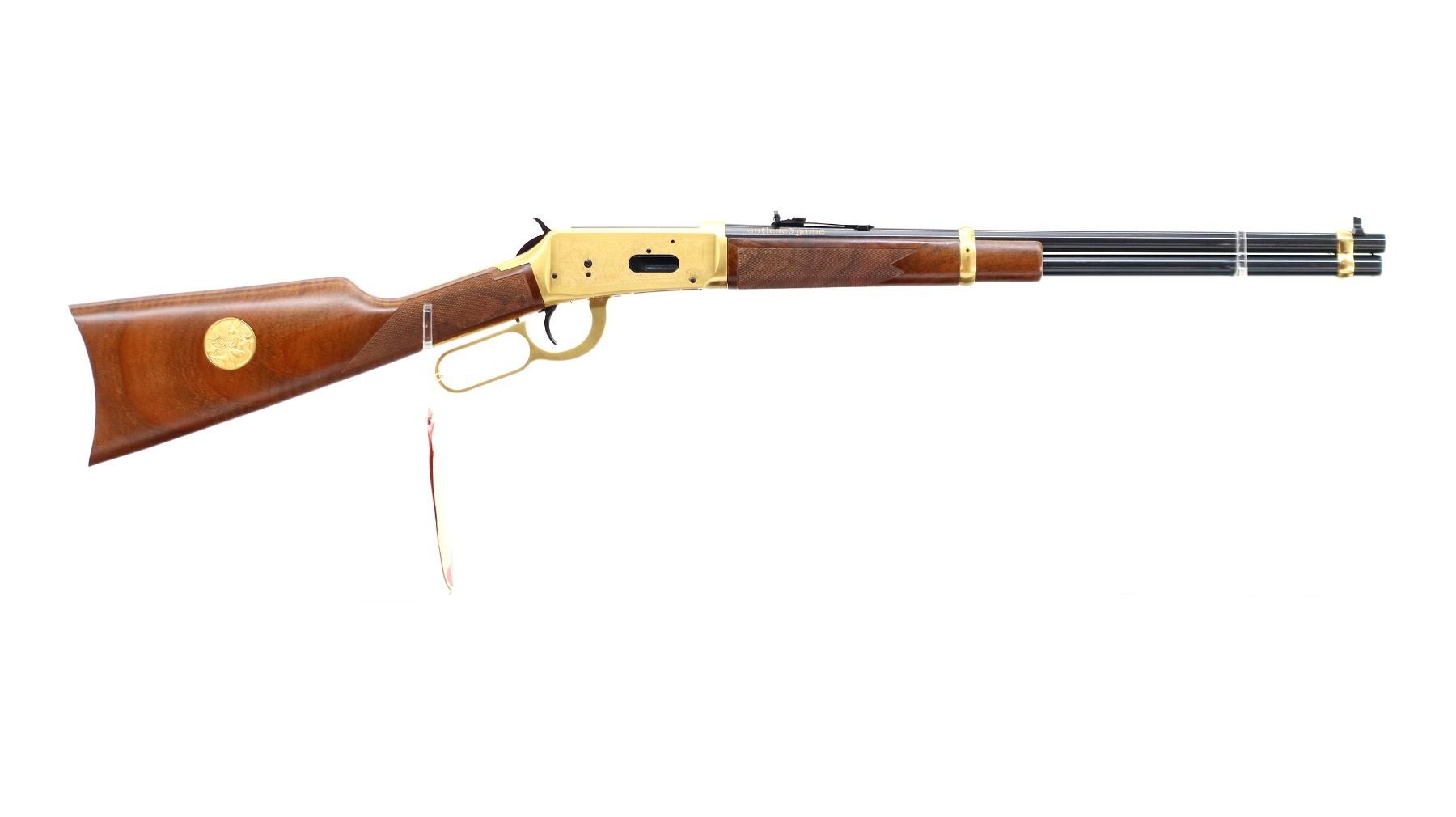 Main Description: Blade front sight, adjustable u notched rear sight, blued barrel, bolt and full length magtube, engraved gold game scene receiver, grooved spur hammer. Two piece wood stocks, checkered forearm and straight grip, smooth curved steel butt plate with some light rust around the edges, medallion in right side of stock, gold barrel bands, retains factory hang tag.