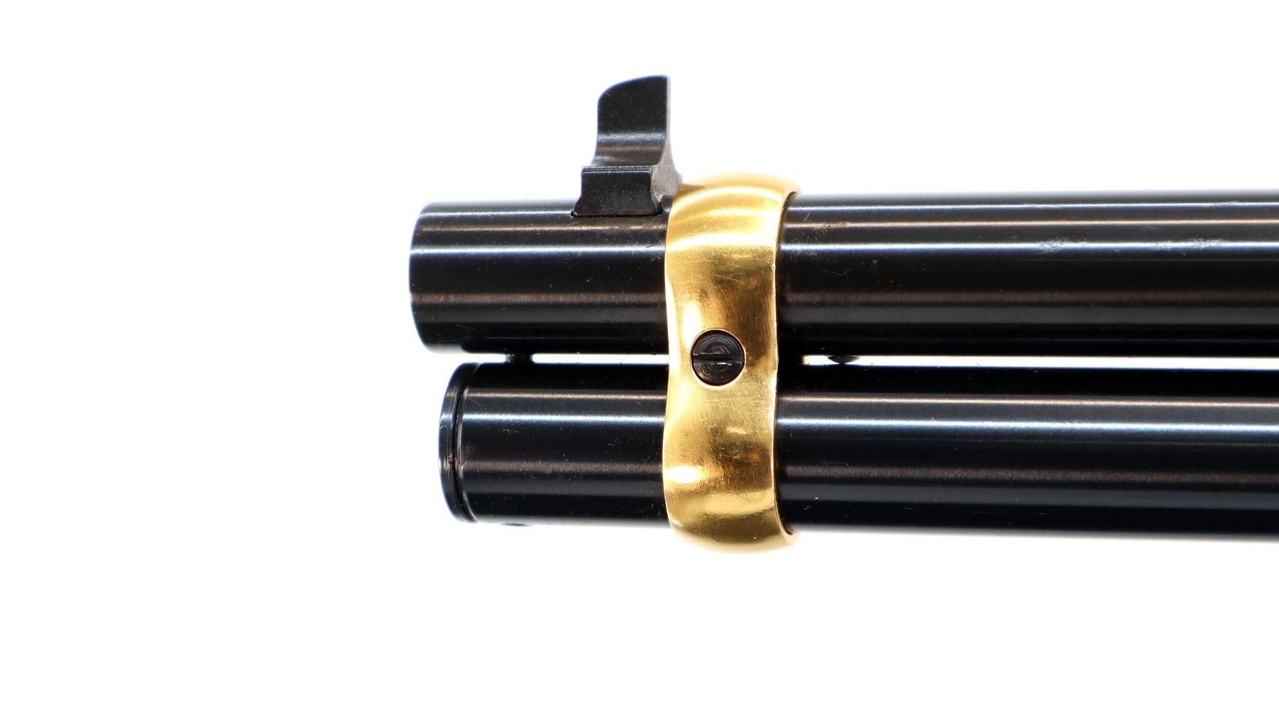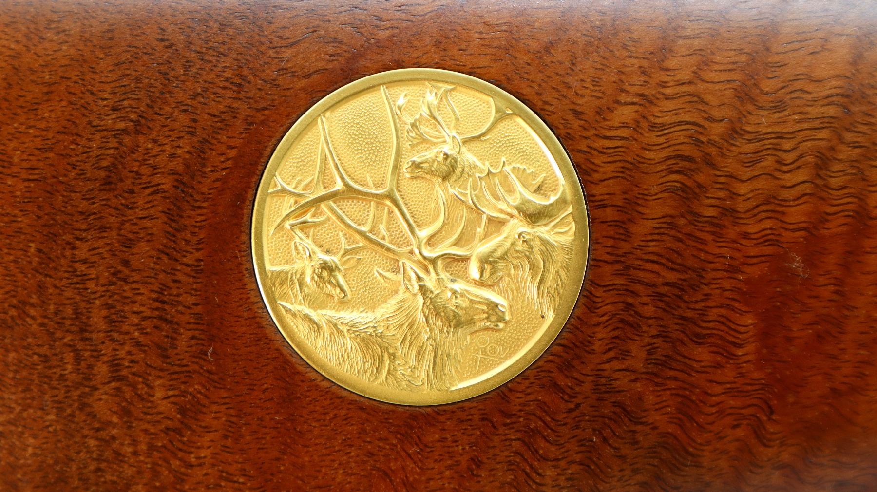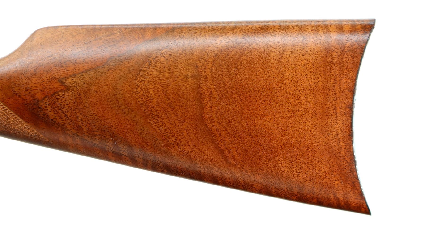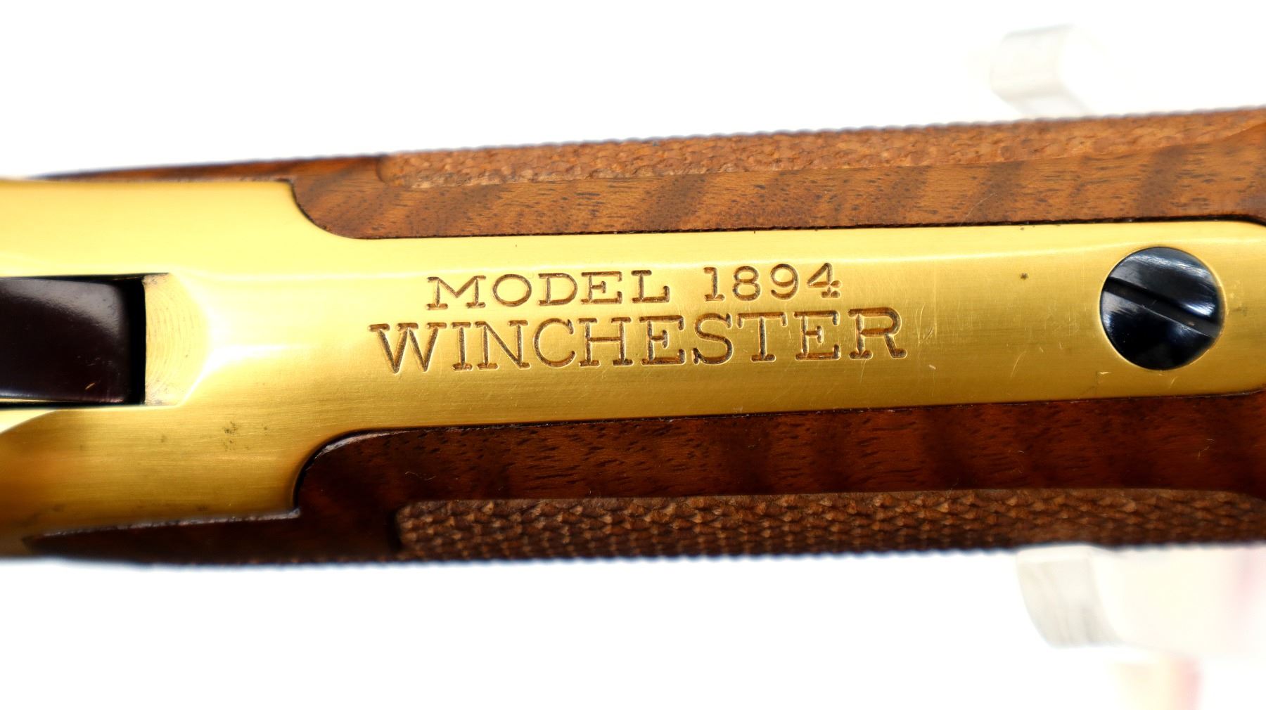 Main Description: Blade front sight, adjustable u notched rear sight, blued barrel, bolt and full length magtube, engraved gold game scene receiver, grooved spur hammer. Two piece wood stocks, checkered forearm and straight grip, smooth curved steel butt plate with some light rust around the edges, medallion in right side of stock, gold barrel bands, retains factory hang tag.