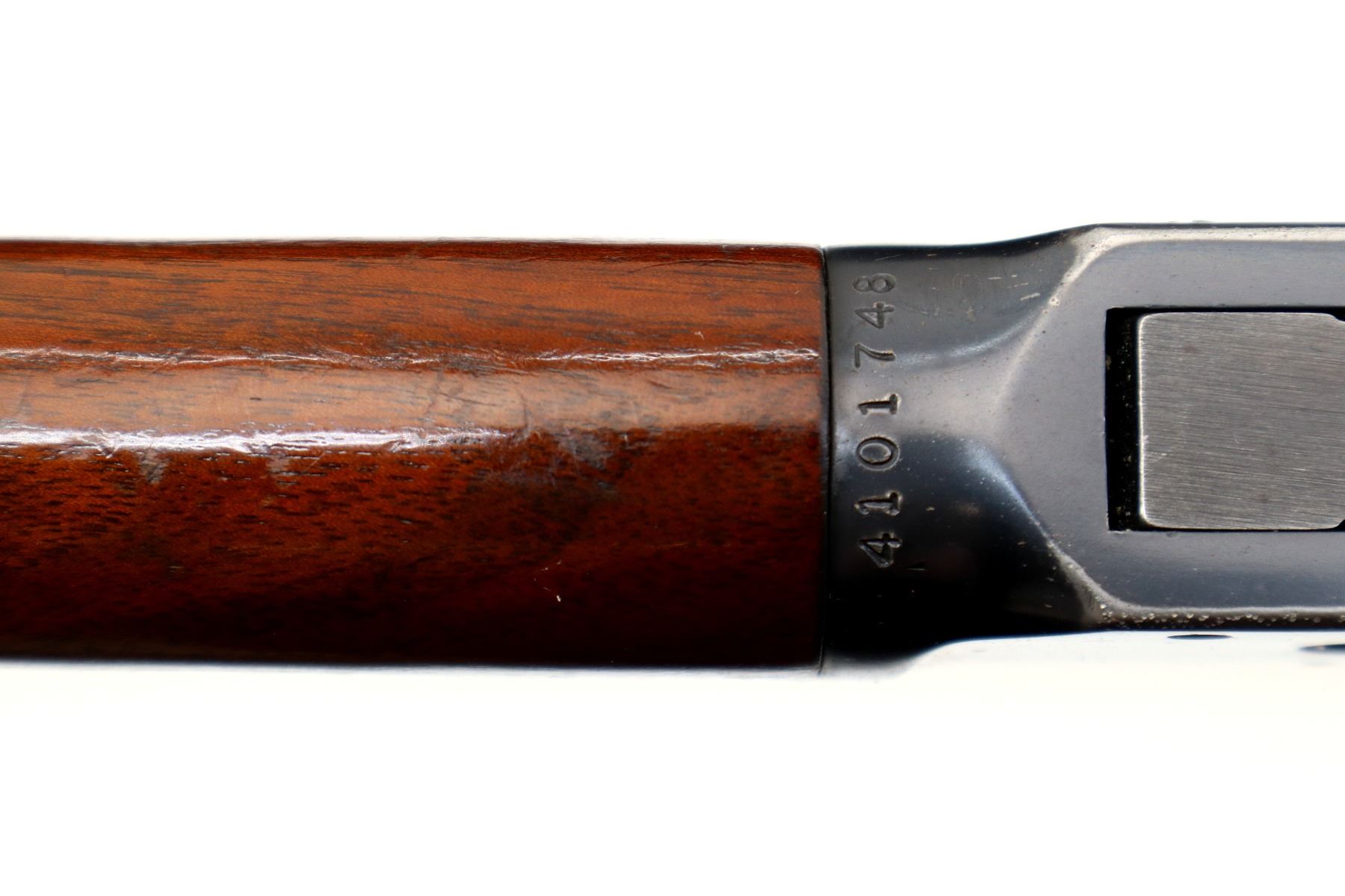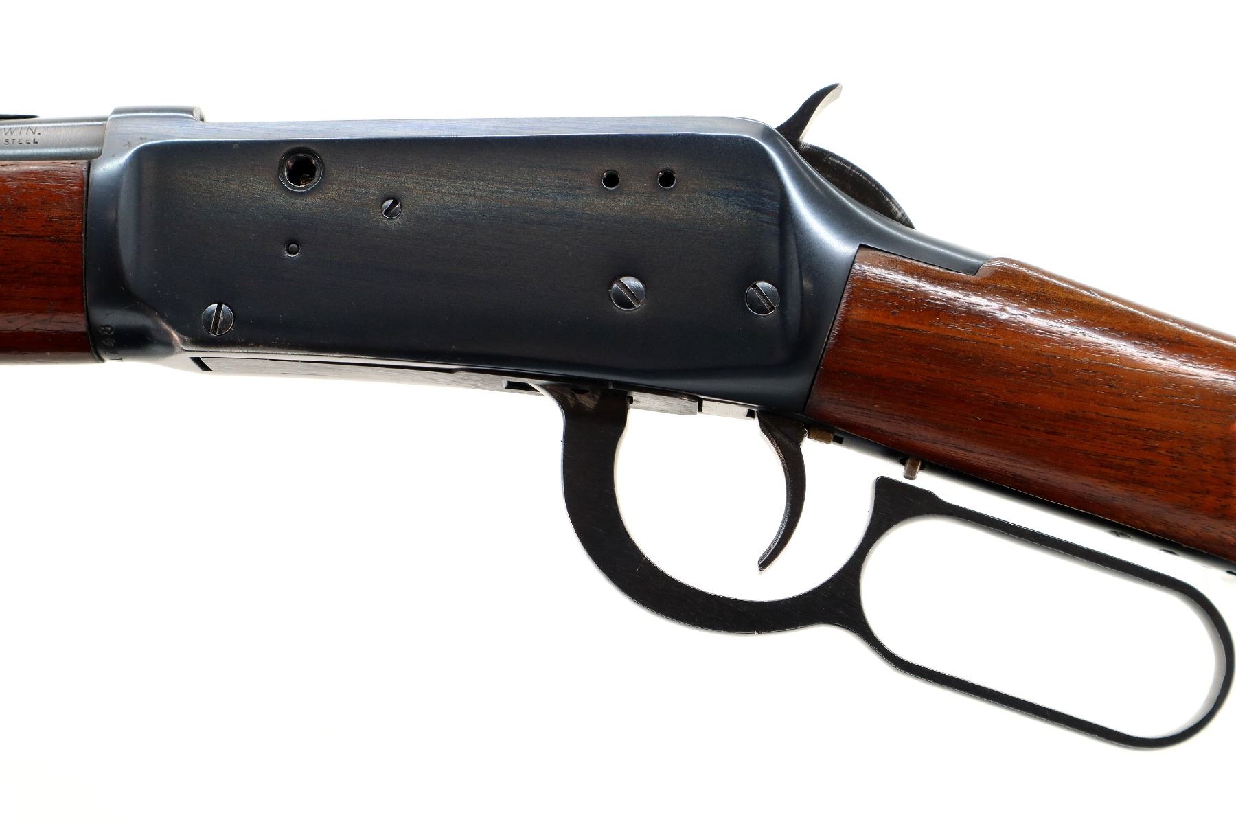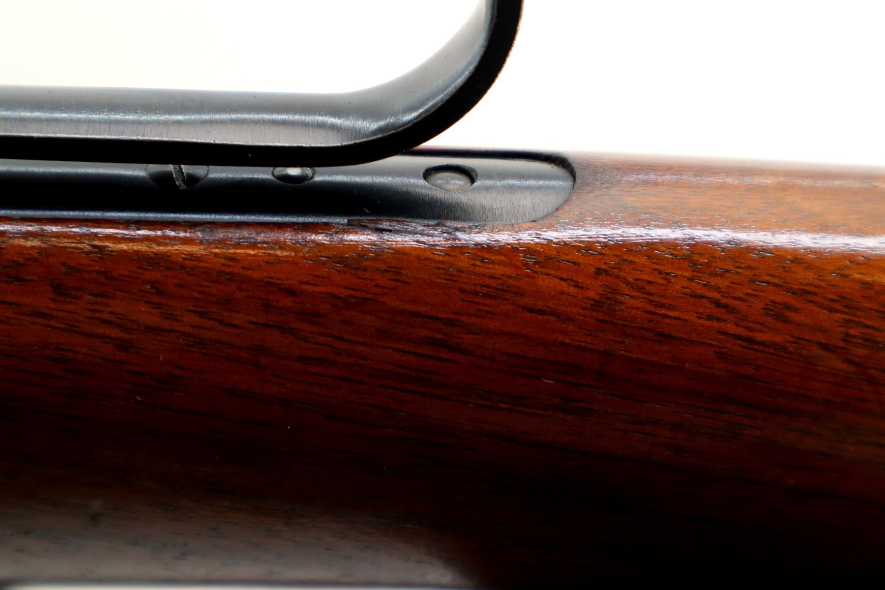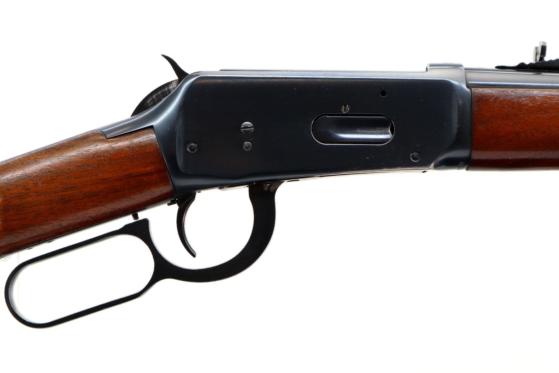 Main Description: Blade front sight with ramp, replaced adjustable u notched rear sight, blued finish, receiver missing three screws on left side, grooved spur hammer. Two piece wood stocks, straight grip, checkered black polymer butt plate, full length magtube.
