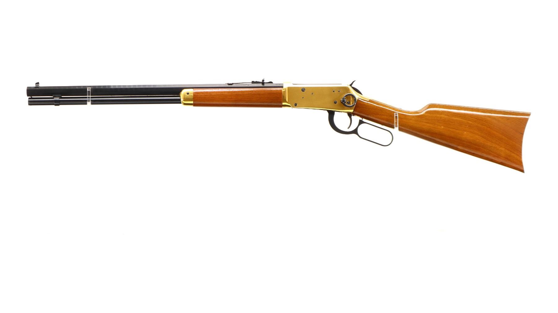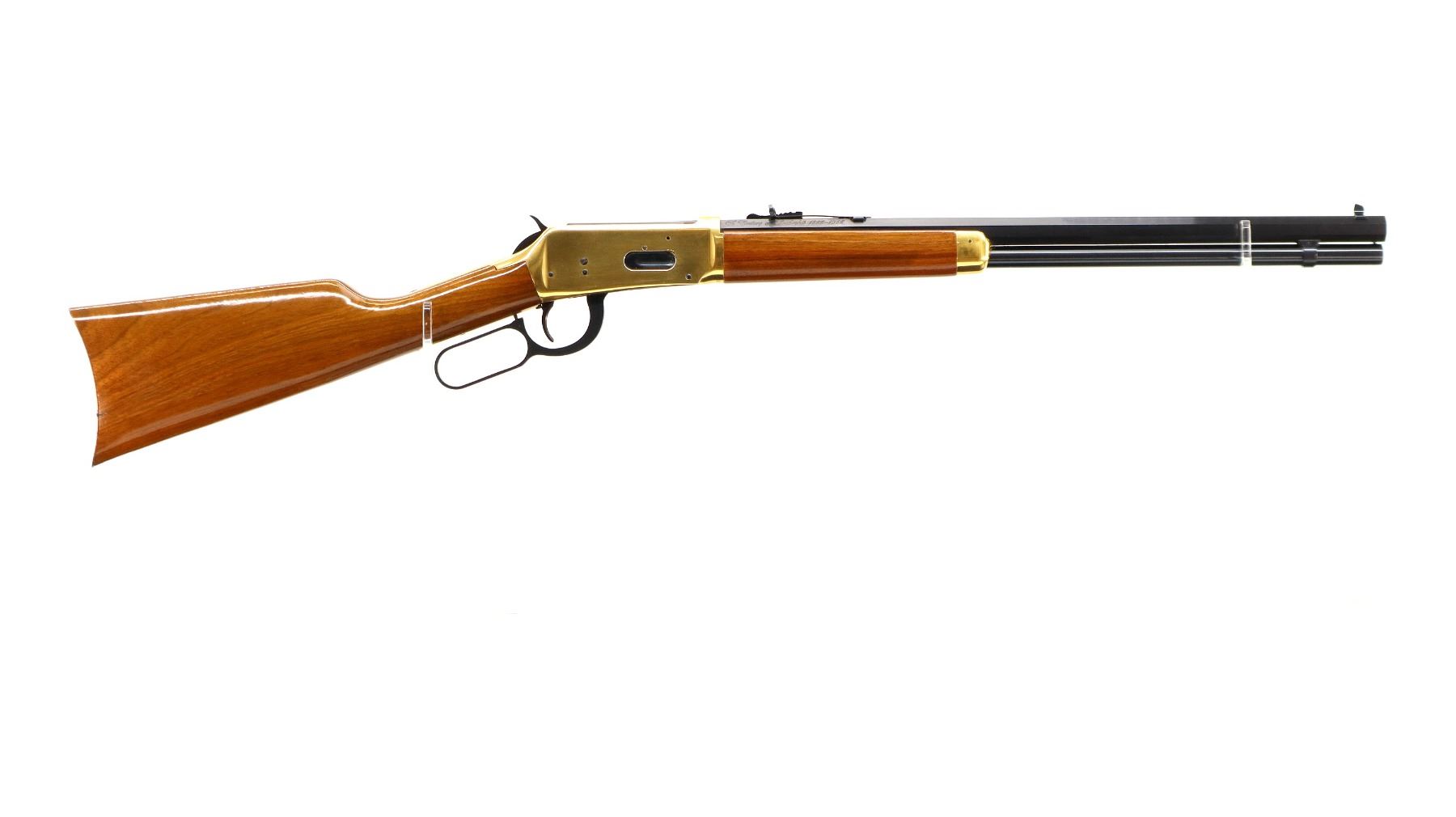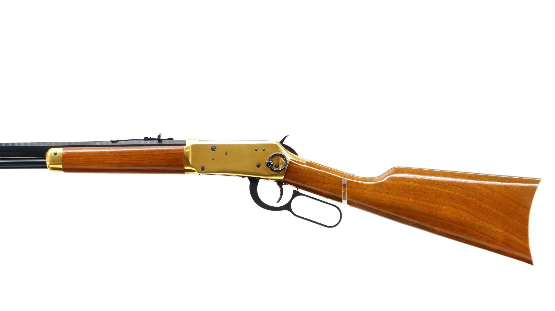 Main Description: Blade front sight, adjustable u notched rear sight, blued octagon barrel, bolt, lever and full length magtube, gold receiver with some corrosion around the loading gate, grooved spur hammer, saddle ring and stud. Two piece wood stocks, straight grip, smooth curved gold butt plate which is tarnished and gold nose cap.