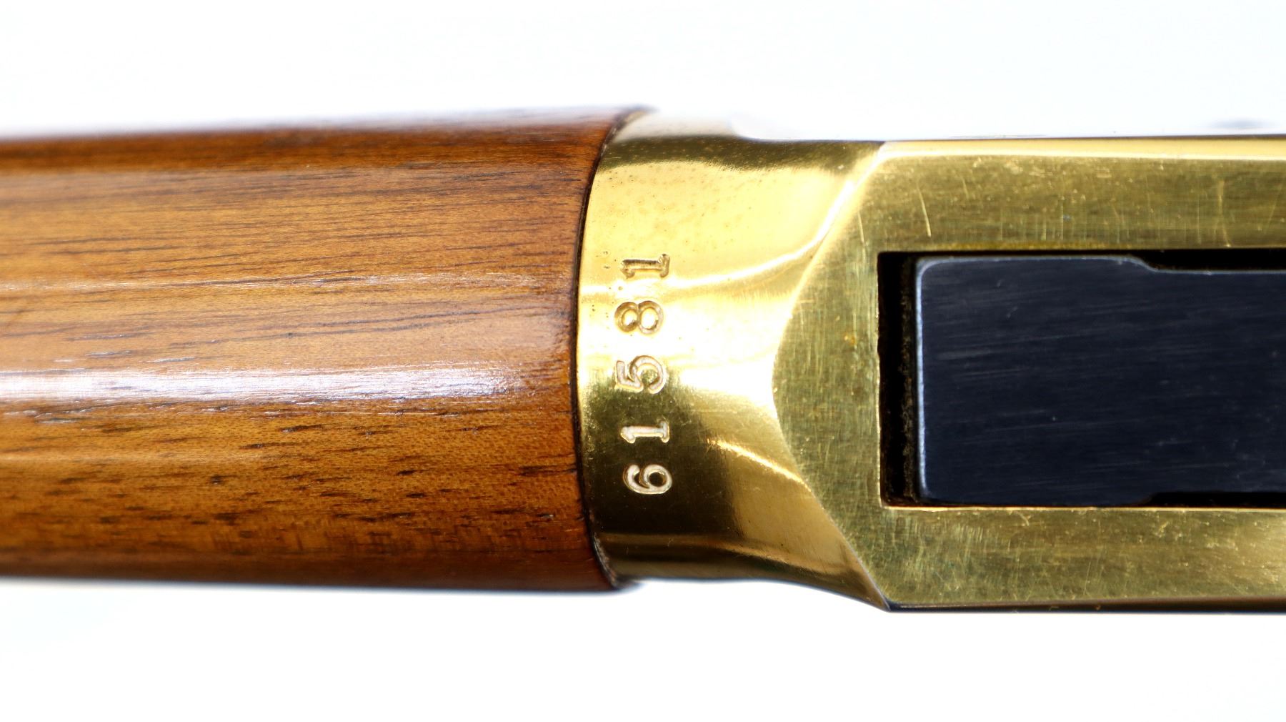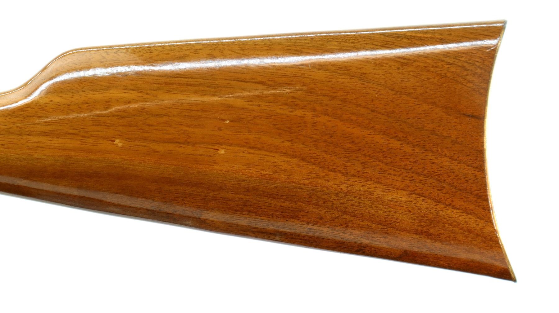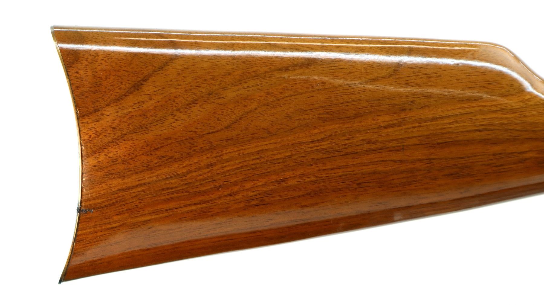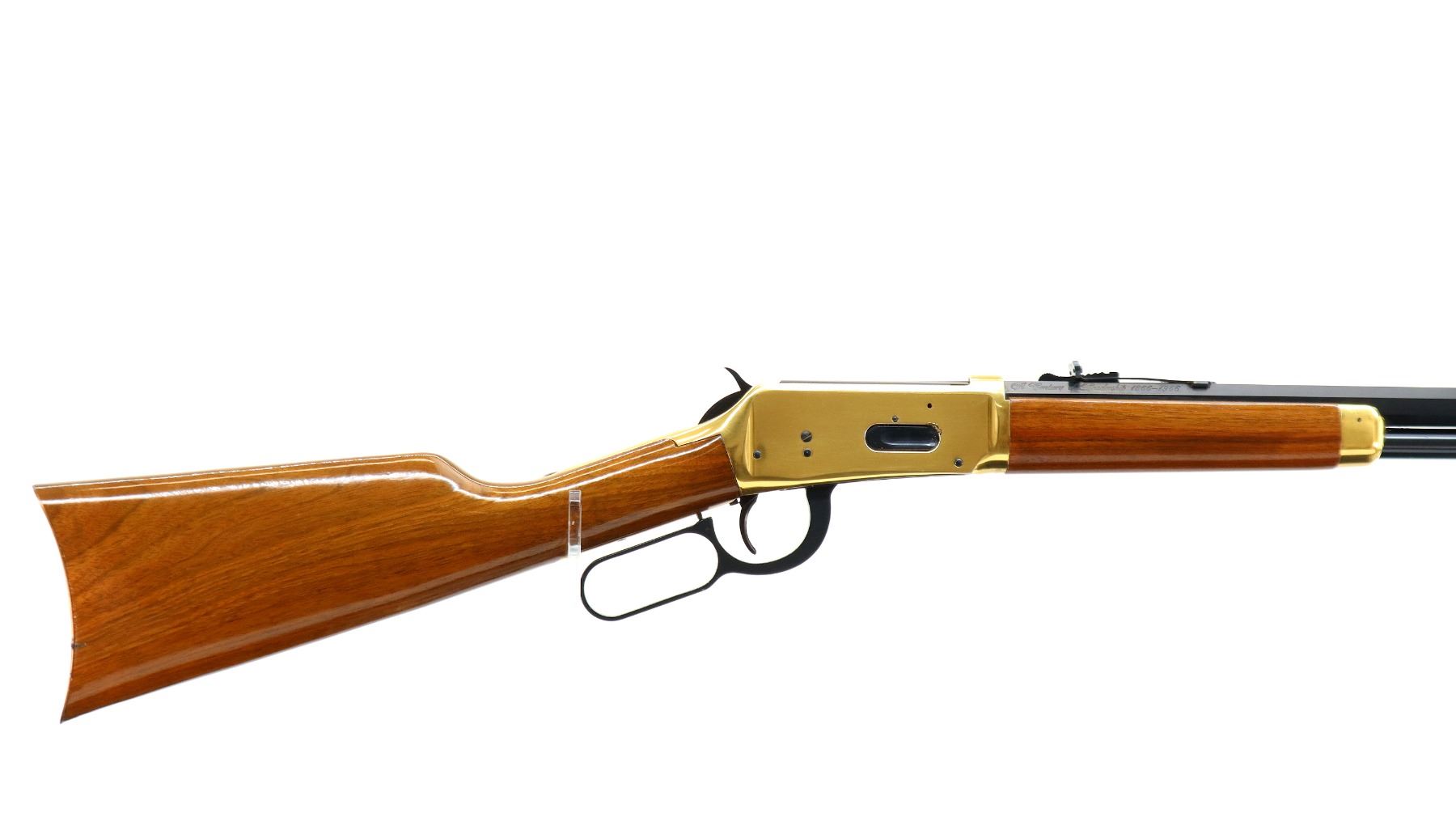 Main Description: Blade front sight, adjustable u notched rear sight, blued octagon barrel, bolt, lever and full length magtube, gold receiver with some corrosion around the loading gate, grooved spur hammer, saddle ring and stud. Two piece wood stocks, straight grip, smooth curved gold butt plate which is tarnished and gold nose cap.