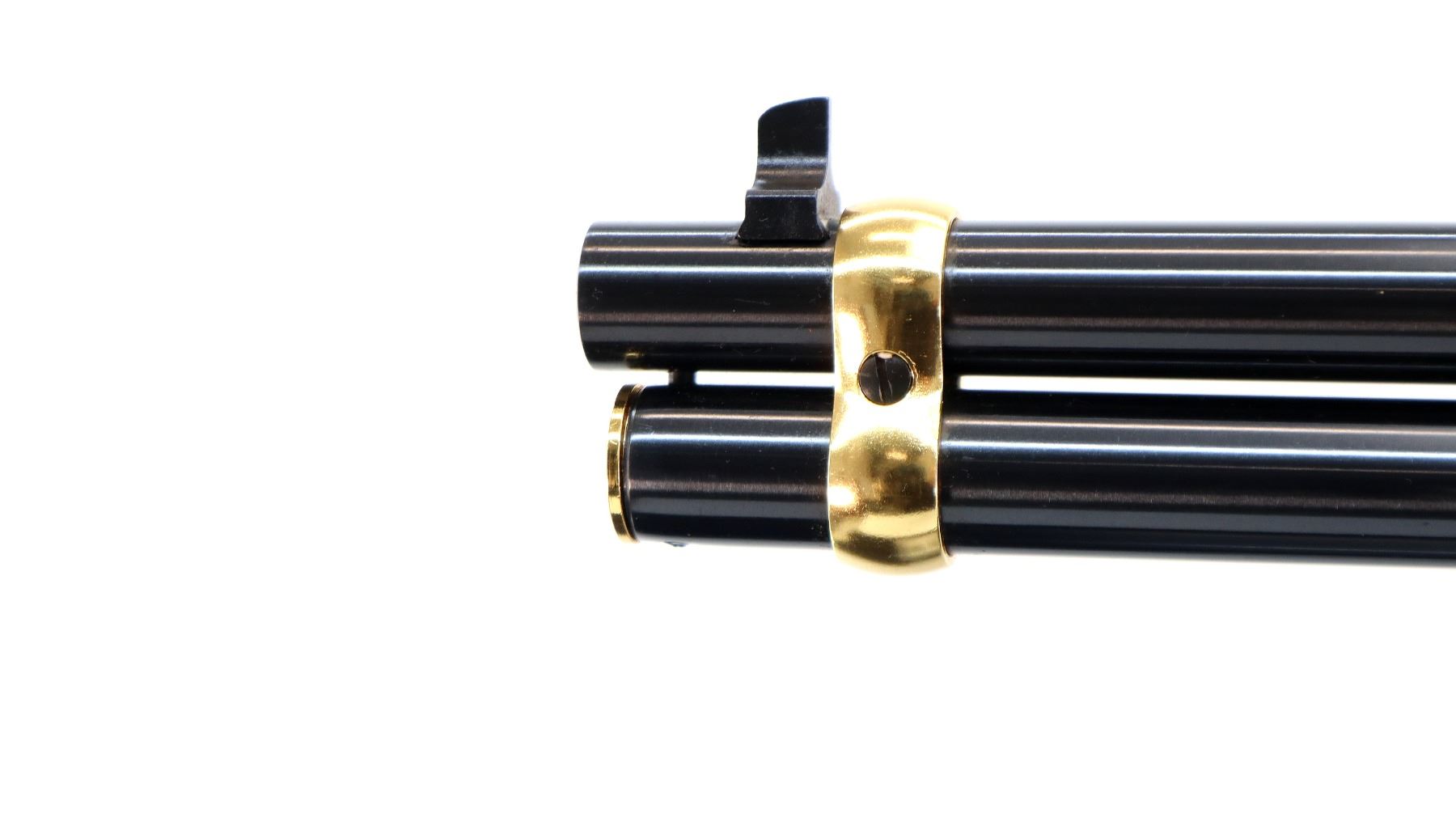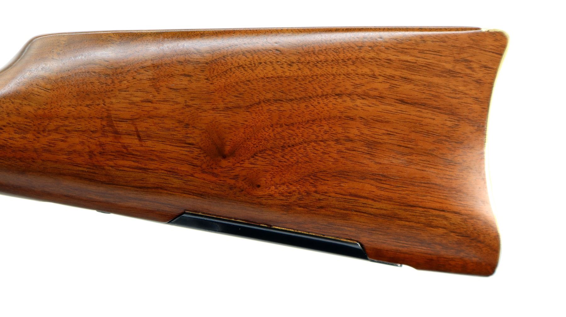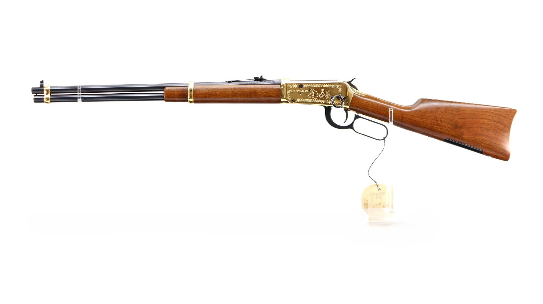 Main Description: Blade front sight, adjustable u notched rear sight, blued round barrel, bolt, lever and full length magtube, engraved Western Scene gold receiver, grooved spur hammer, saddle ring and stud. Two piece wood stocks, straight grip, smooth curved gold butt plate and two barrel bands, bottom of stock has a blued steel four round shell holder installed, medallion in right side of stock, retains factory hang tag.
