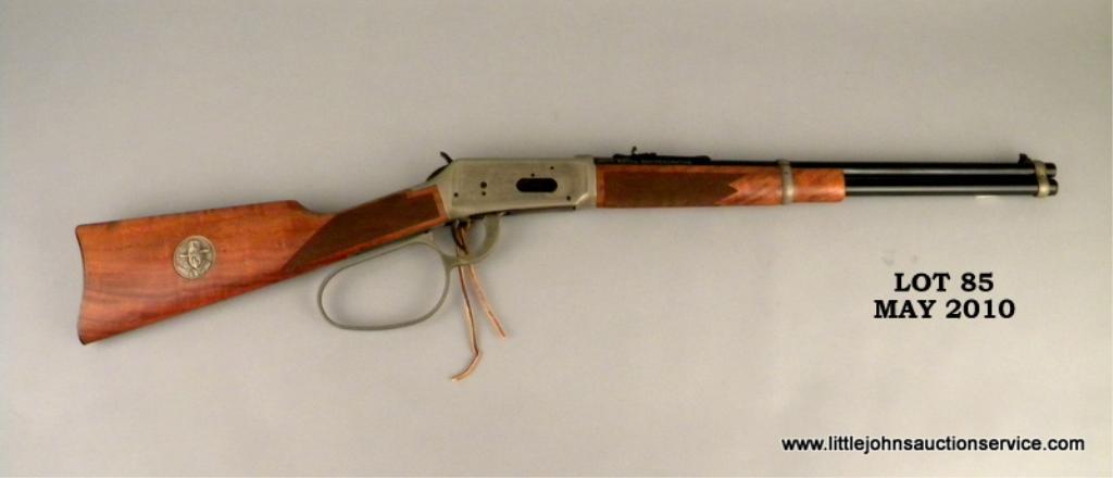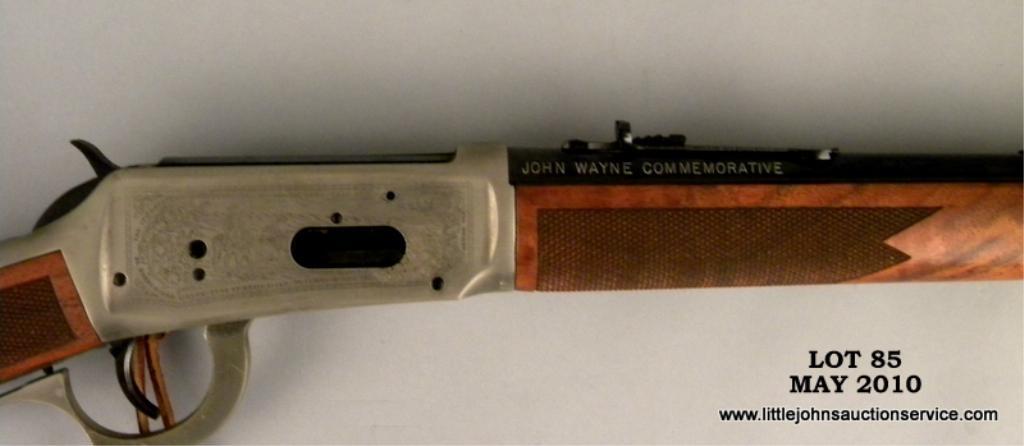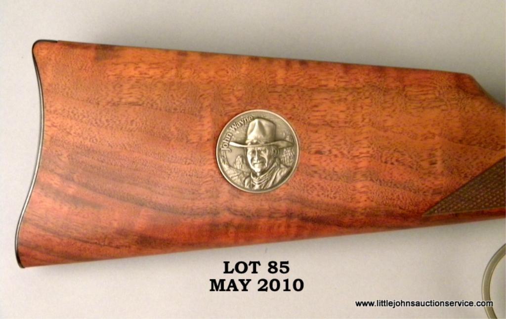 WINCHESTER Model 94 John Wayne Commemorative SRC, # JW10184, .32-40 cal., 18.5" barrel, large loop lever, roll engraved receiver scene of stage coach and cowboy scene, checkered walnut stock, with a John Wayne medallion inlaid into the right side the stock. Rifle is in very good condition overall, nickel receiver has tarnished, but should clean, wood is in excellent condition. Includes a box of Winchester John Wayne commemorative 32-40 ammunition, and a rare wooden Winchester walldisplay with stamped leather stage coach scene. Est. $750-$1,500.