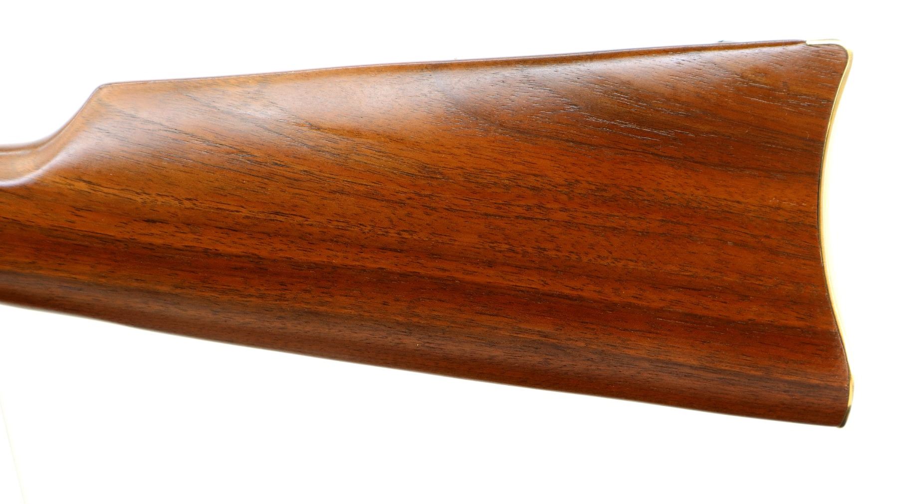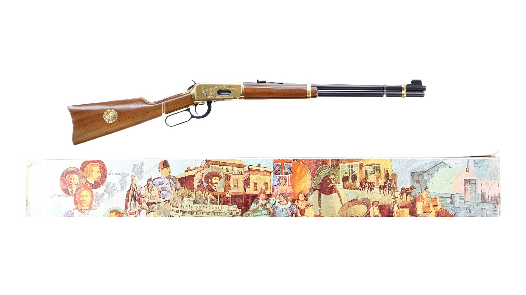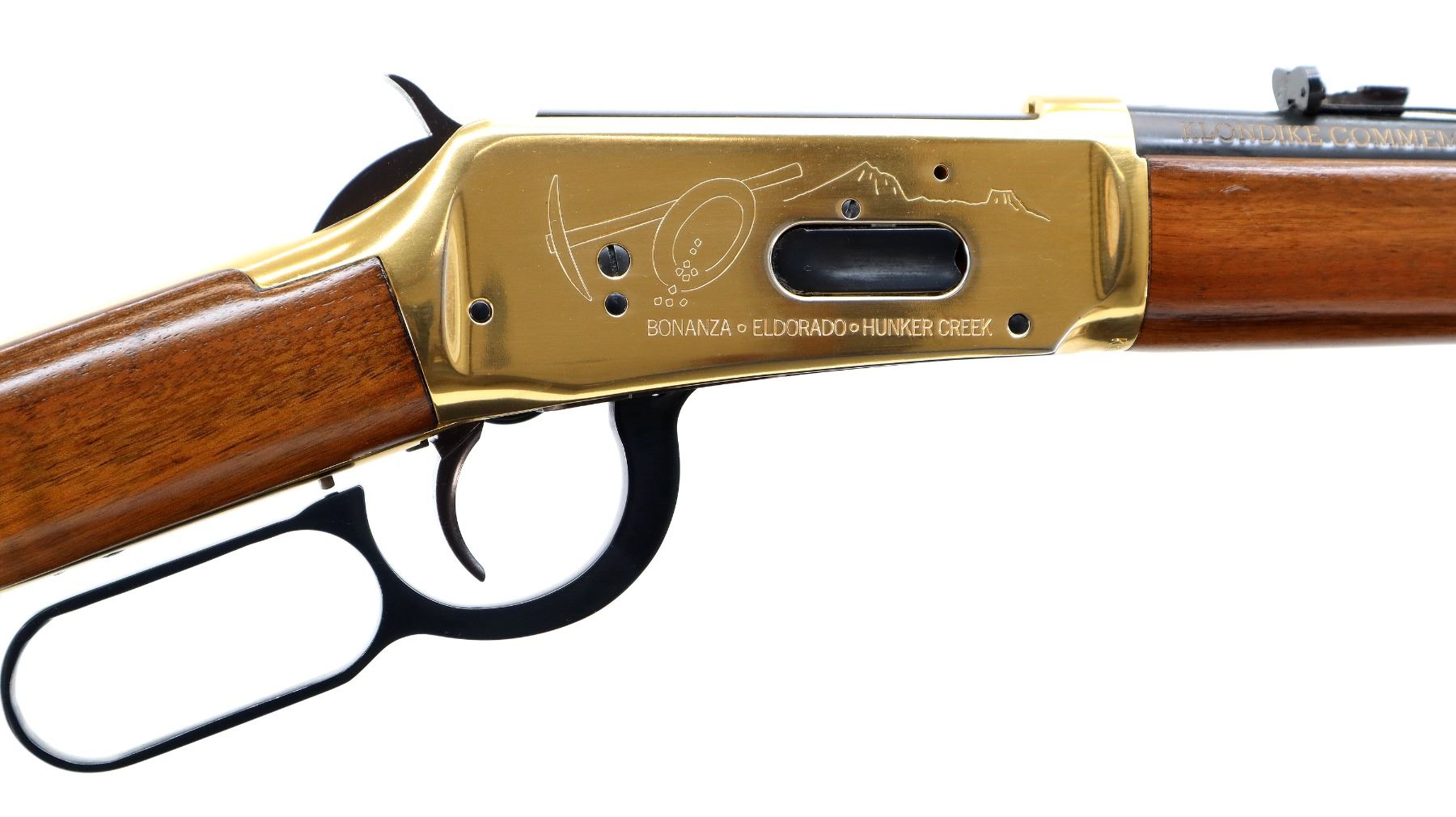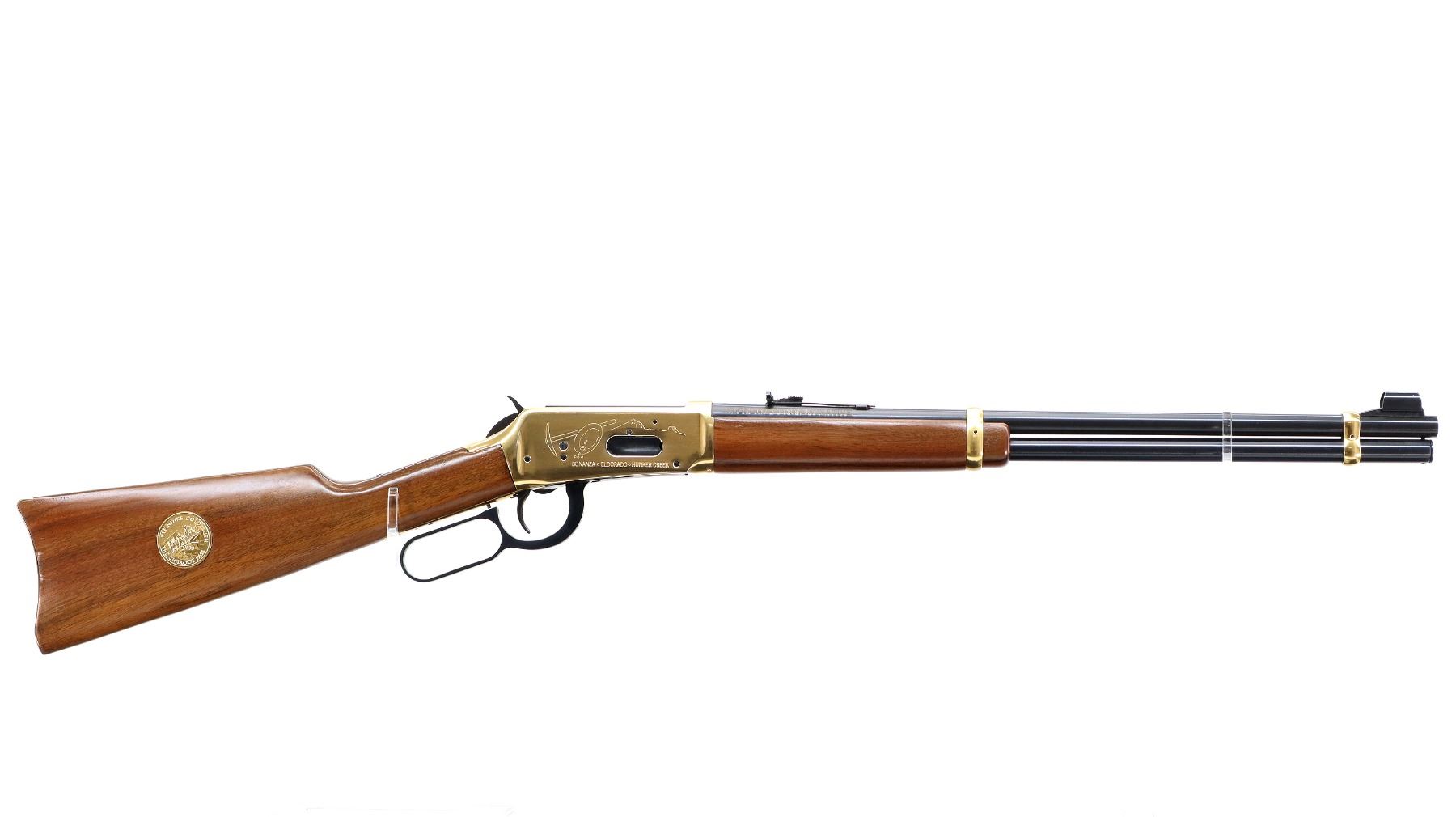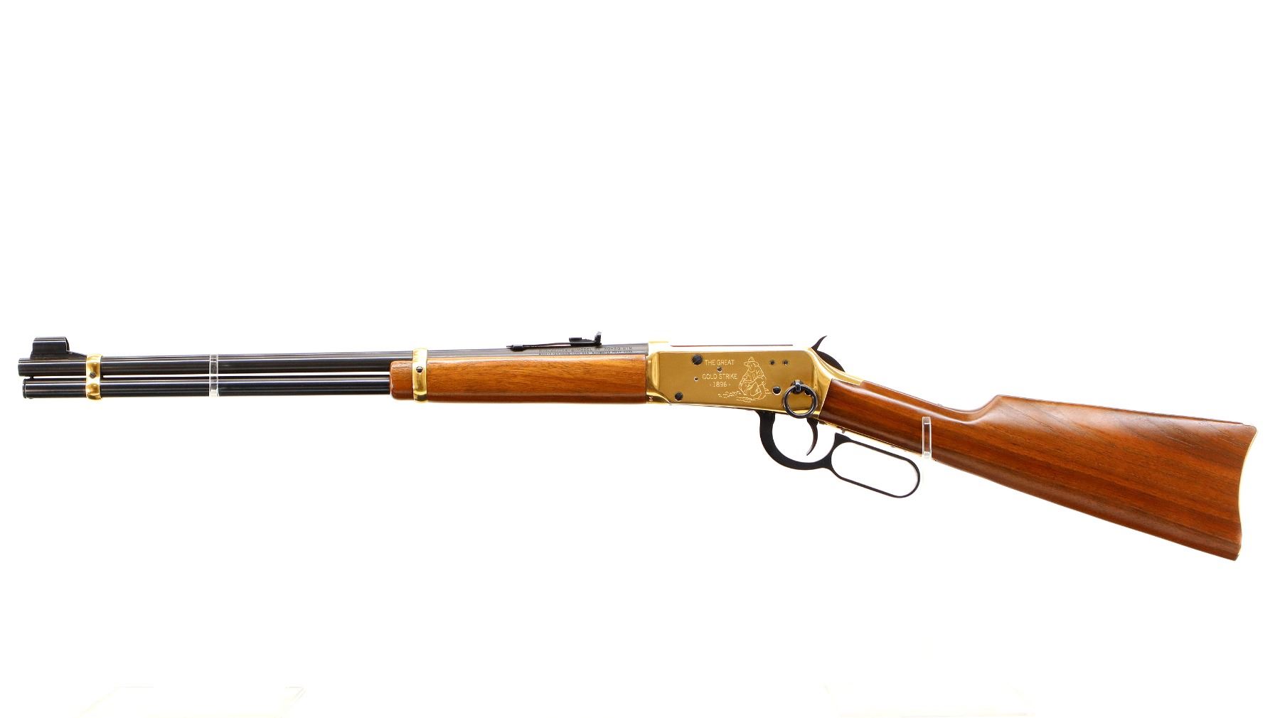 Main Description: Blade front sight with hood and ramp, adjustable u notched rear sight, blued round barrel, bolt, grooved spur hammer, lever and full length magtube. Gold receiver with western scene, saddle ring and stud. Two piece wood stocks, straight grip, smooth curved gold butt plate and barrel bands, medallion in right side of stock.
