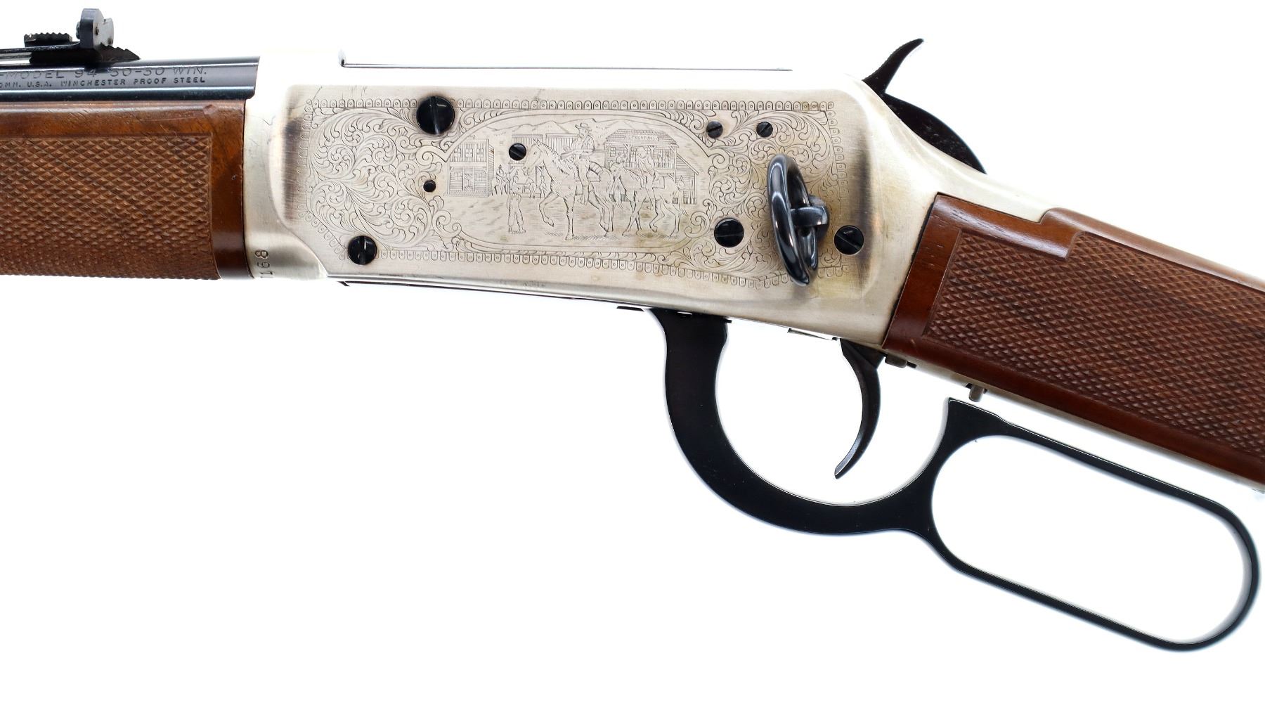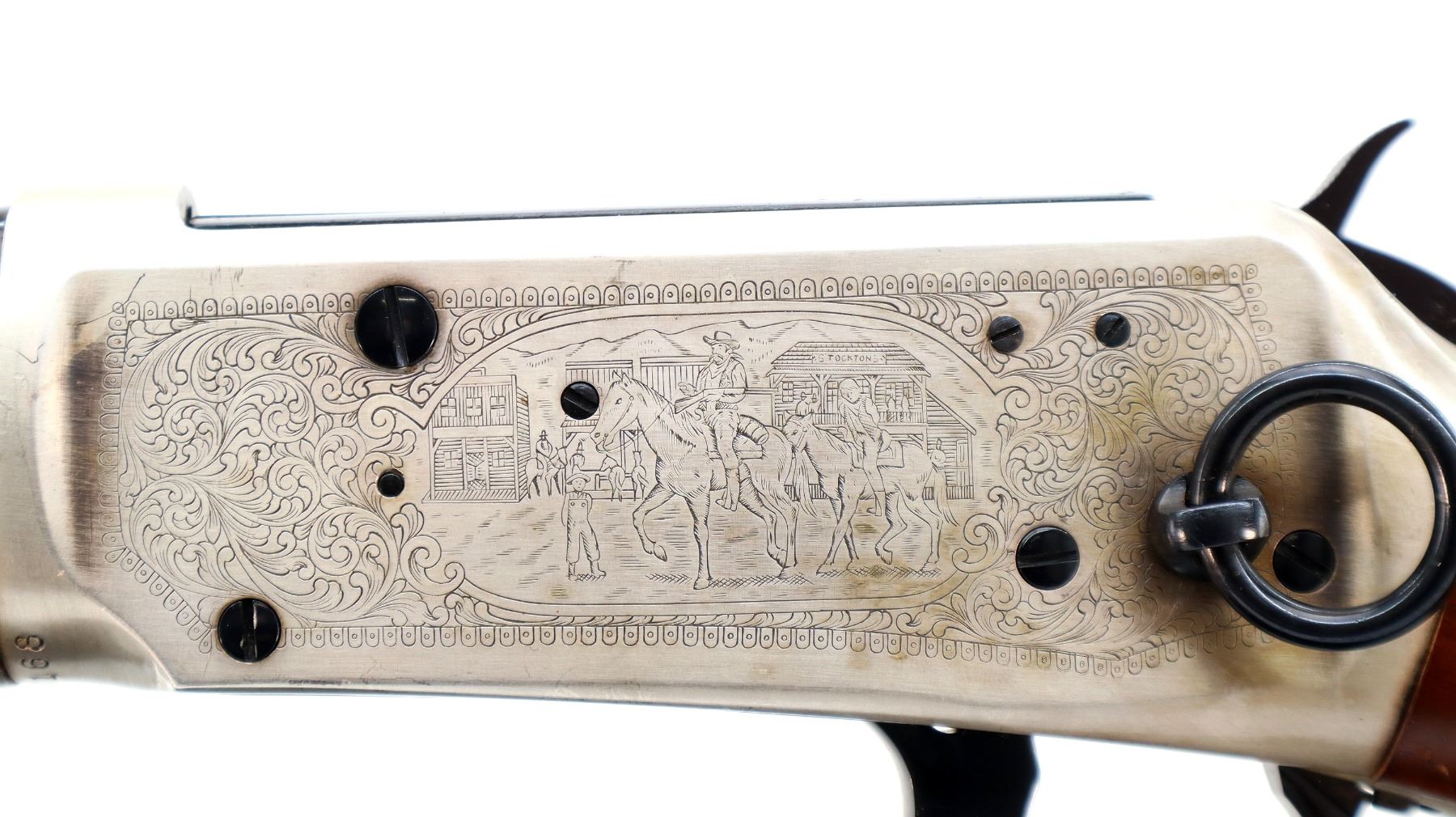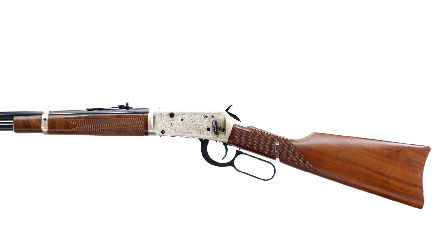 Main Description: Blade front sight, adjustable u notched rear sight, blued barrel, bolt, lever and full length magtube, engraved Western scene silver receiver, grooved spur hammer, saddle ring and stud. Two piece wood stocks, checkered forearm and straight grip, smooth curved steel butt plate with light rust spots, small chip on right side of stock with silver medallion, two silver barrel bands.