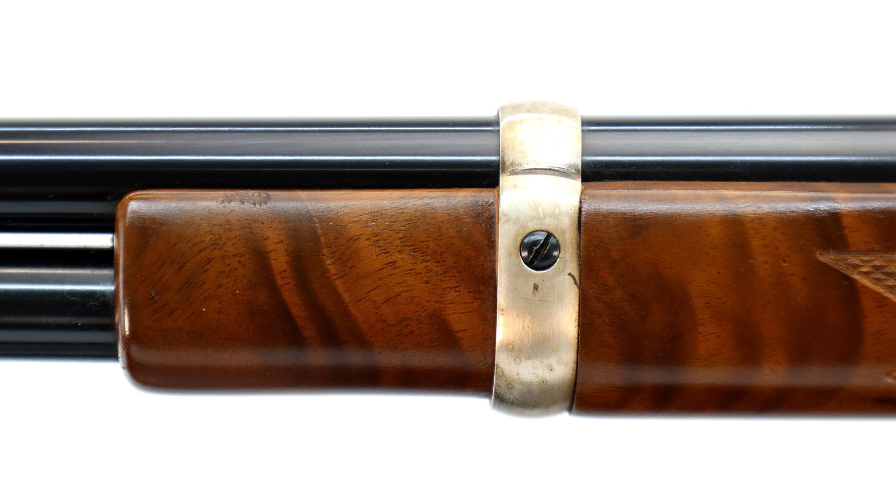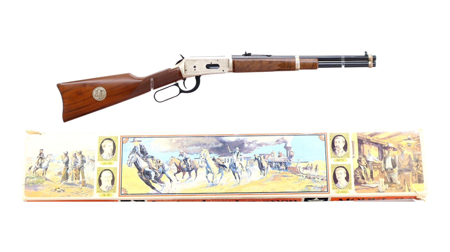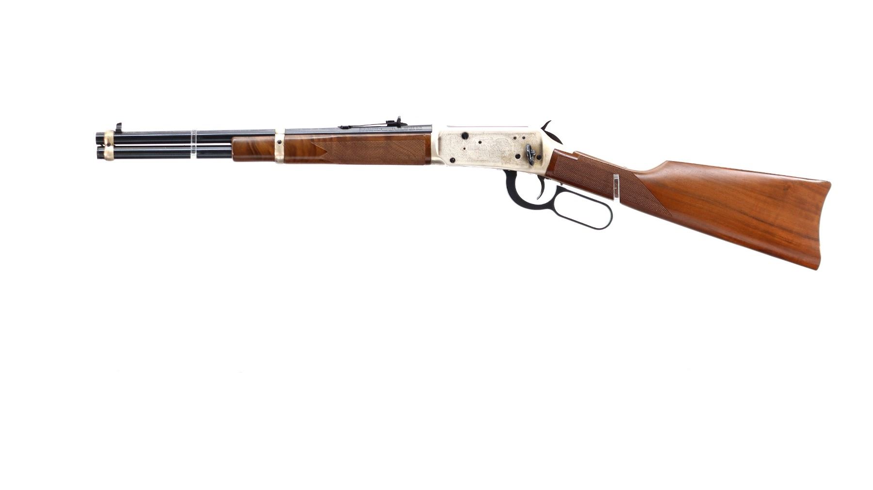 Main Description: Blade front sight, adjustable u notched rear sight, blued barrel, bolt, lever and full length magtube, engraved Western scene silver receiver, grooved spur hammer, saddle ring and stud. Two piece wood stocks, checkered forearm and straight grip, smooth curved steel butt plate with light rust spots, small chip on right side of stock with silver medallion, two silver barrel bands.