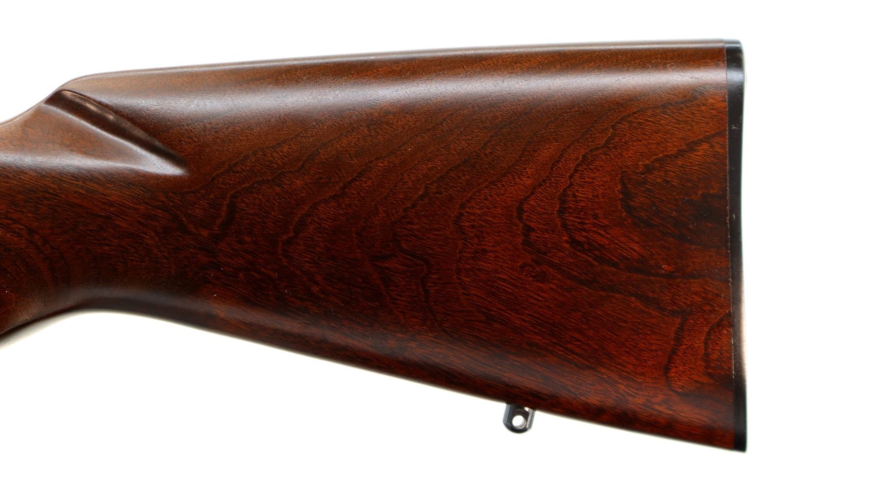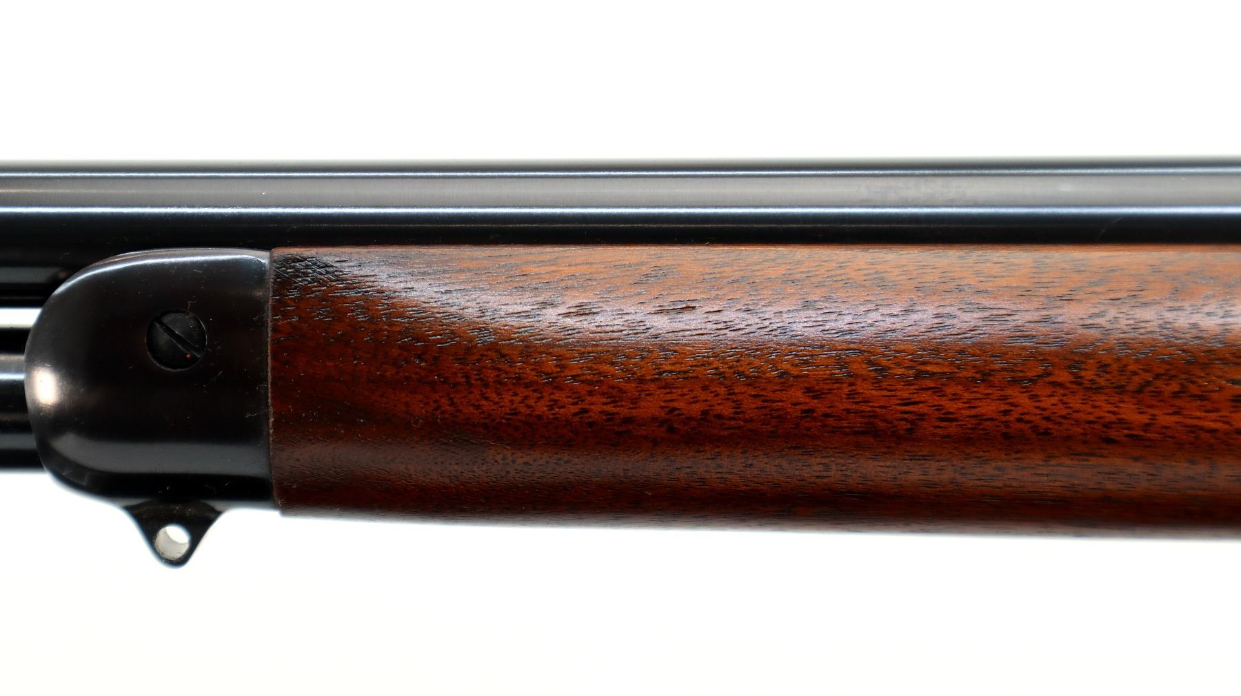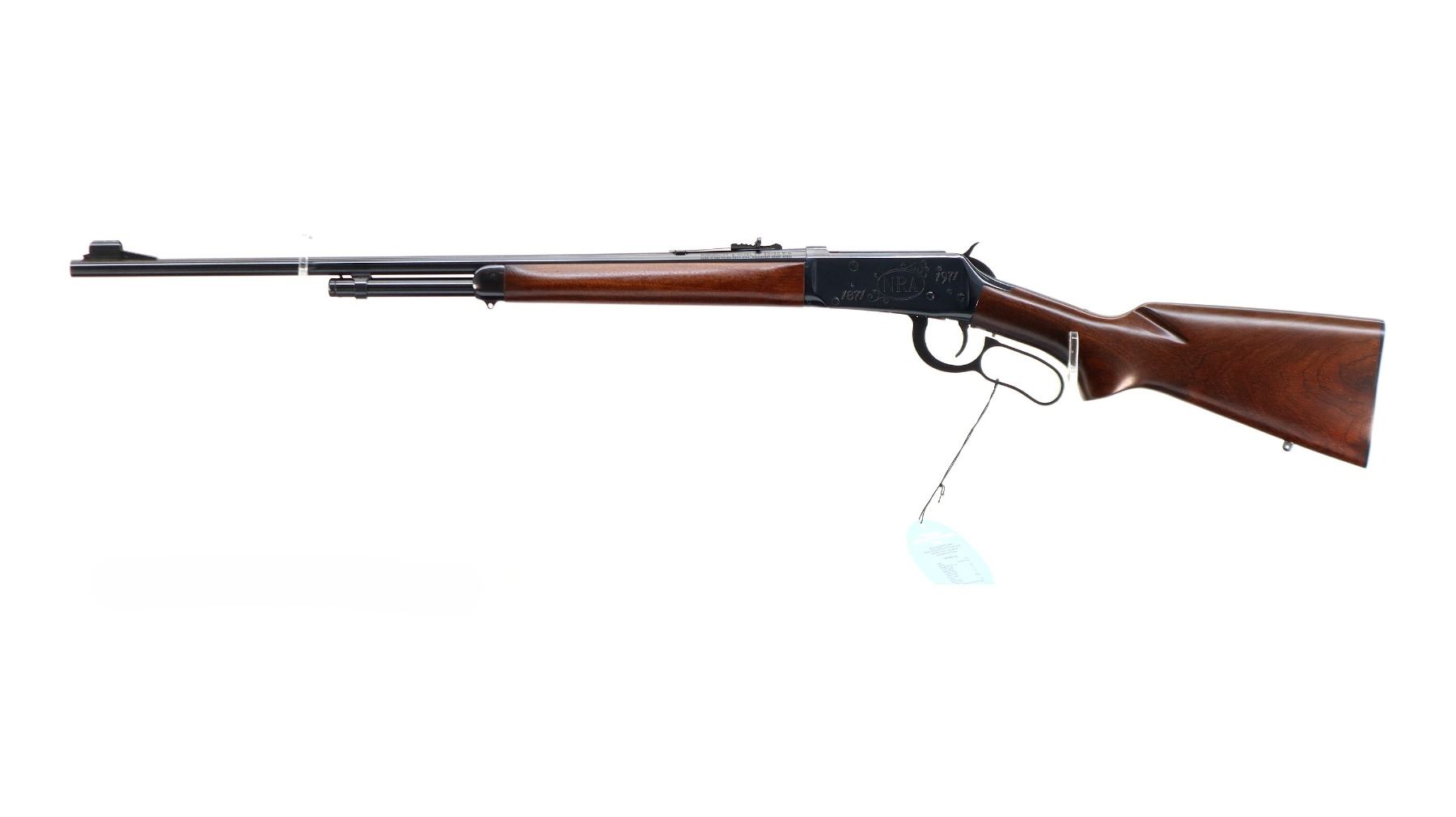 Main Description: Blade front sight with hood and ramp, adjustable u notched rear sight, polish blued finish, tapered round barrel, engraved receiver, grooved spur hammer. Two piece wood stocks, pistol grip, checkered black polymer butt plate, medallion in right side of stock, swivel studs, 2/3rd length button magtube, retains factory hang tag.