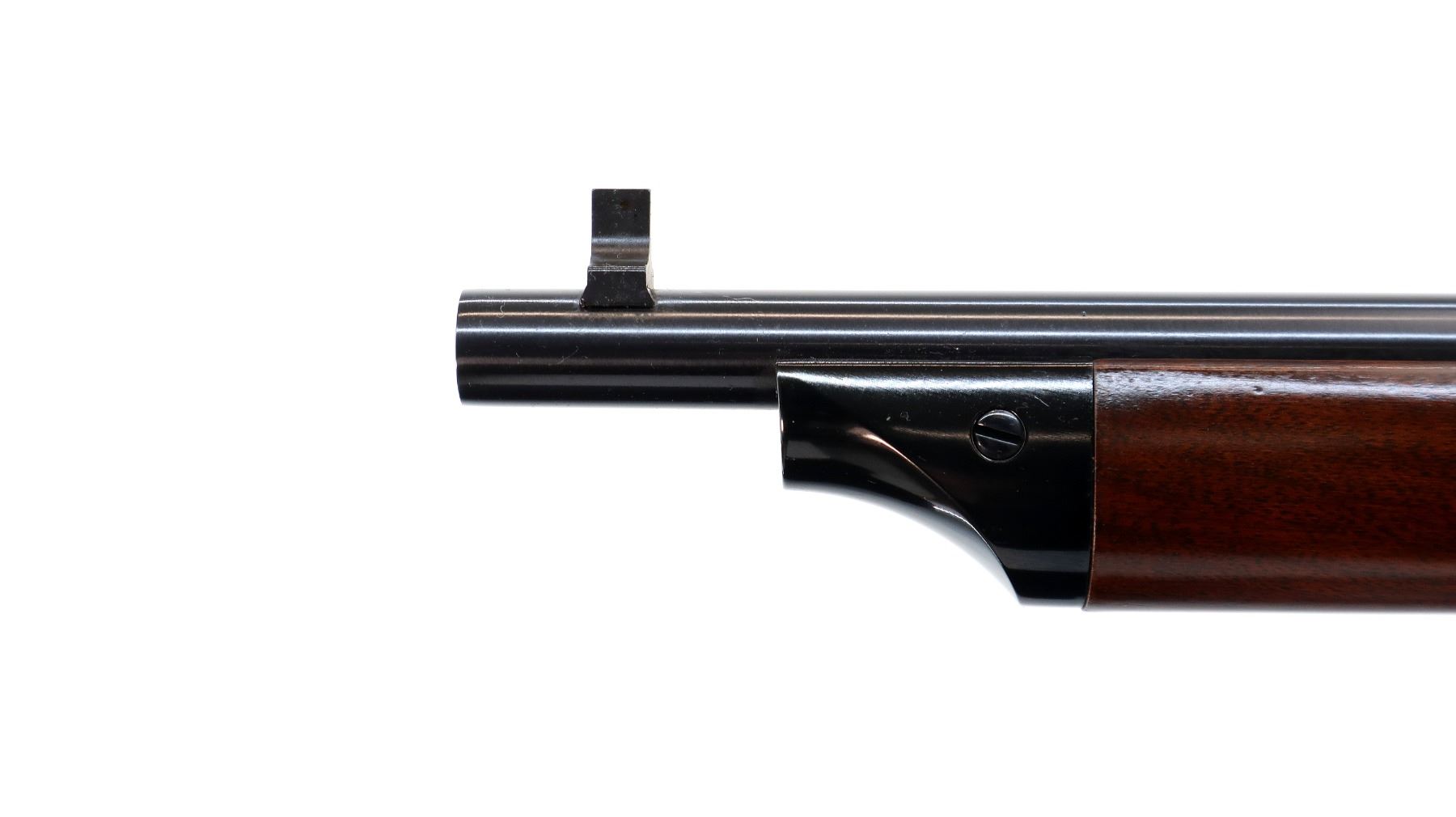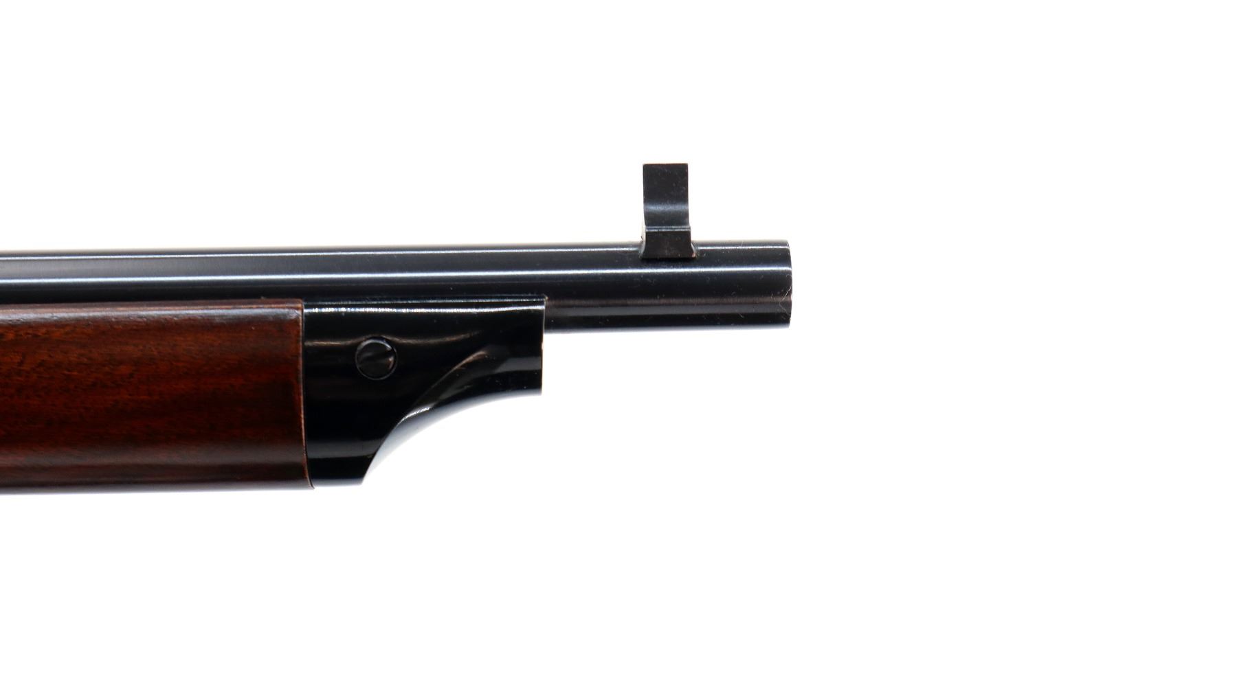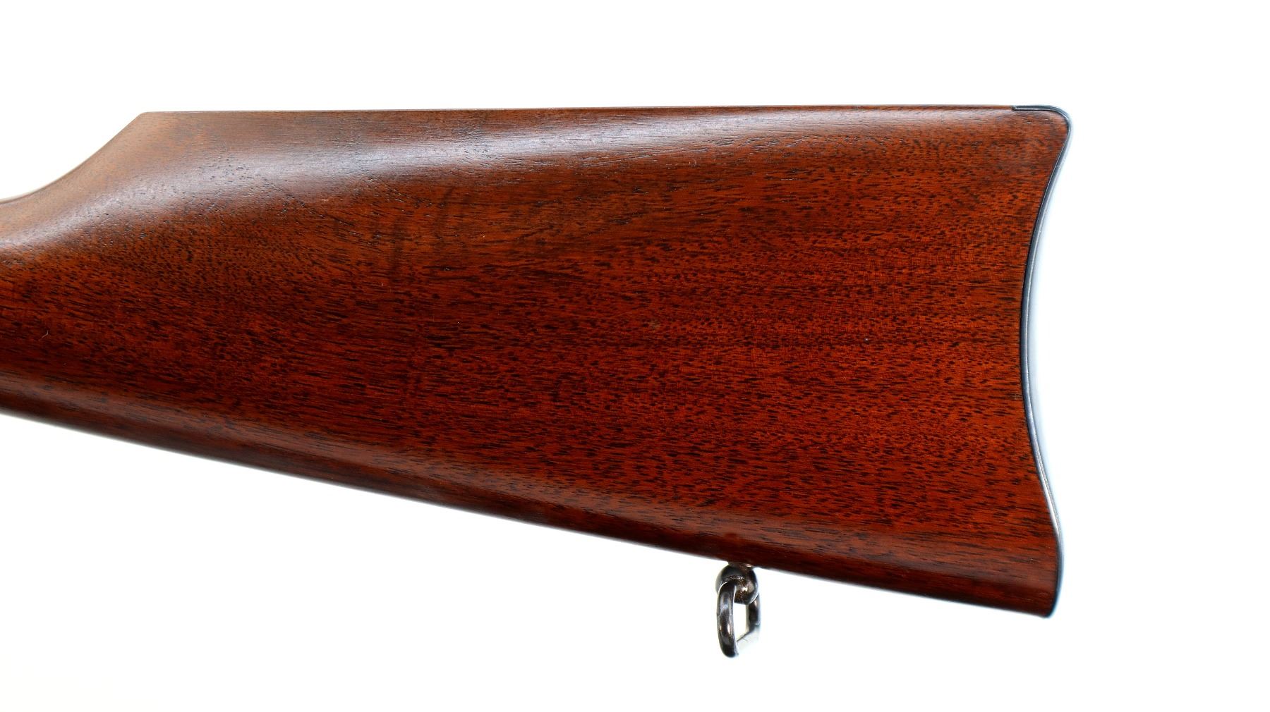 Main Description: Blade front sight, adjustable u notched ladder rear sight, polish blued finish, engraved receiver, grooved spur hammer. Two piece wood stocks, straight grip, smooth curved steel butt plate, medallion in right side of stock, sling swivels note: rear swivel has some light rust speckles, retains factory hang tag