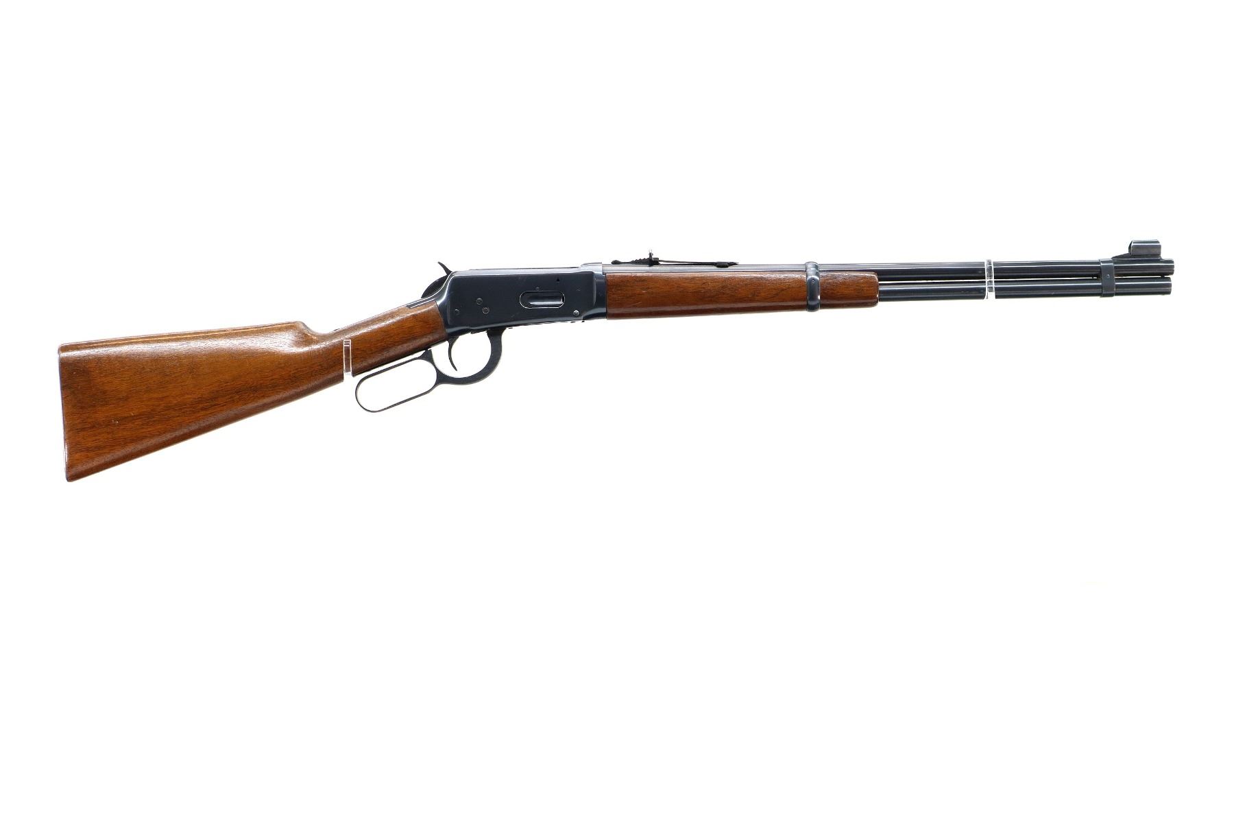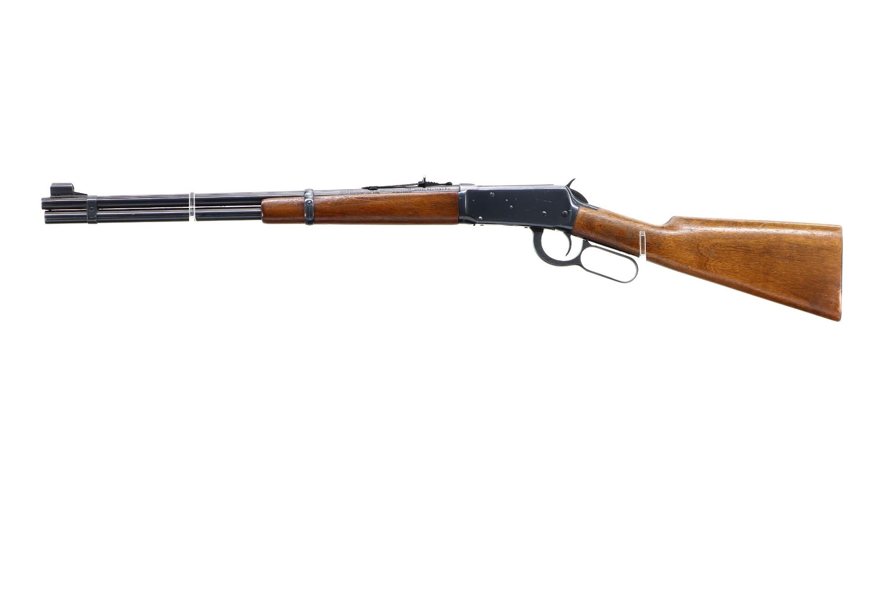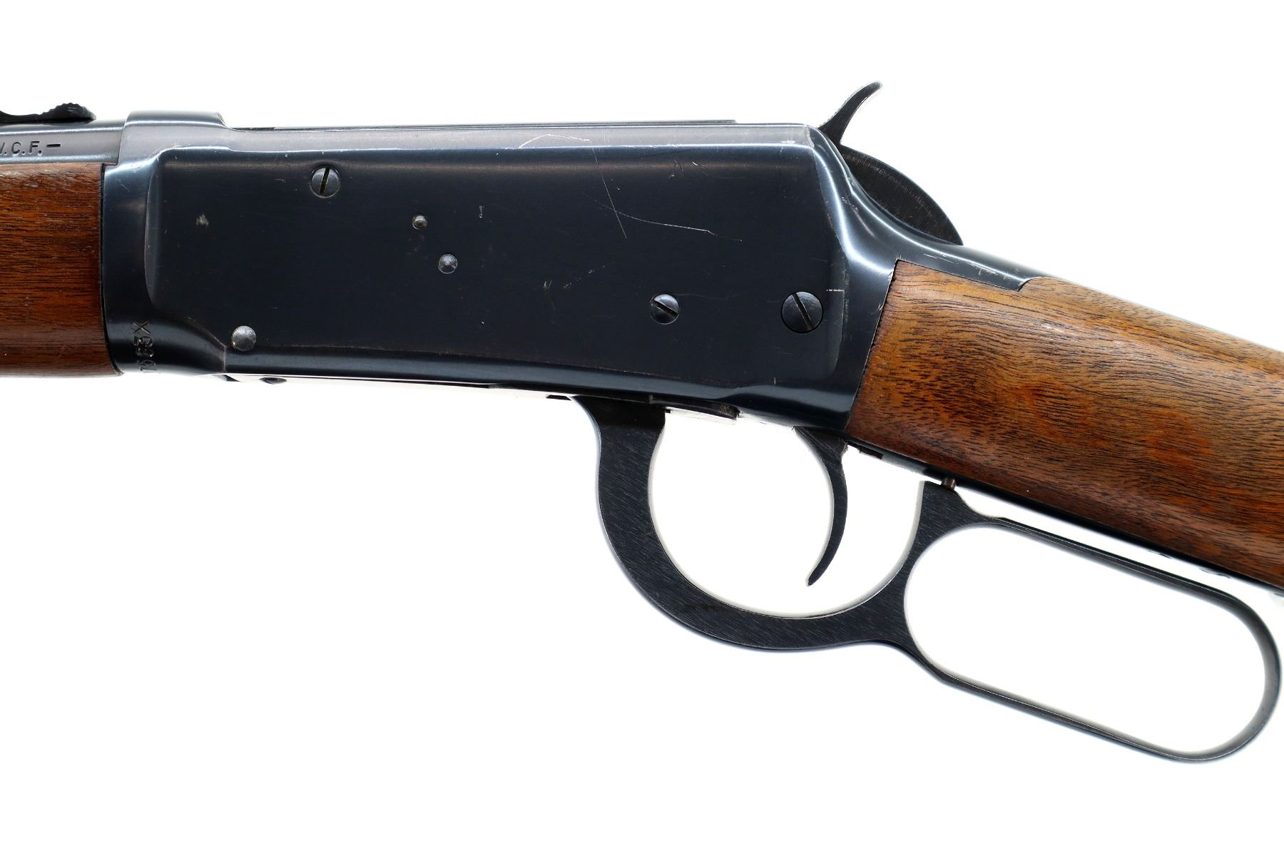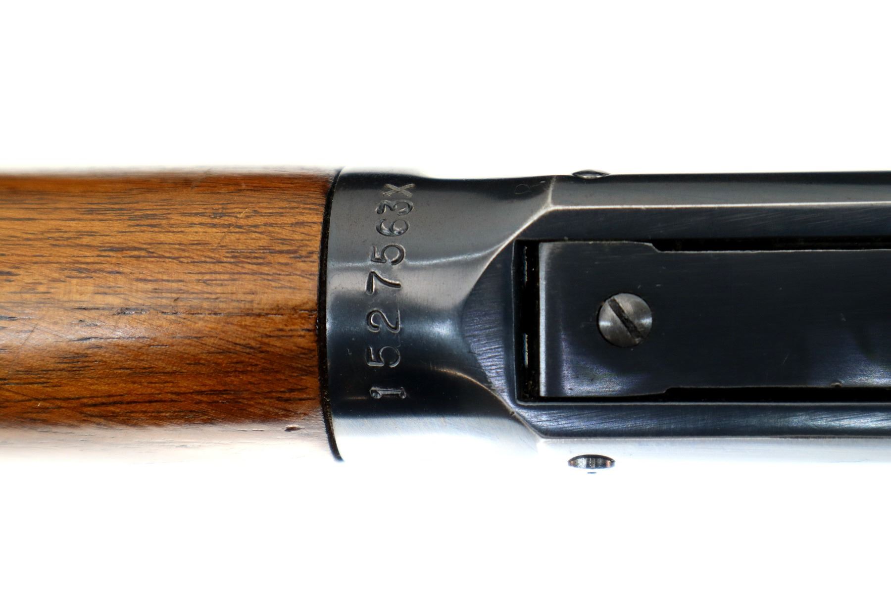 Main Description: Manufactured 1948. Note: this serial number with an X at the end usually indicates a duplicate serial number from the factory. Blade front sight with hood and ramp, adjustable u notched rear sight, blued finish, grooved spur hammer. Two piece wood stocks, straight grip, checkered steel butt plate, flat front barrel band, full length magtube.