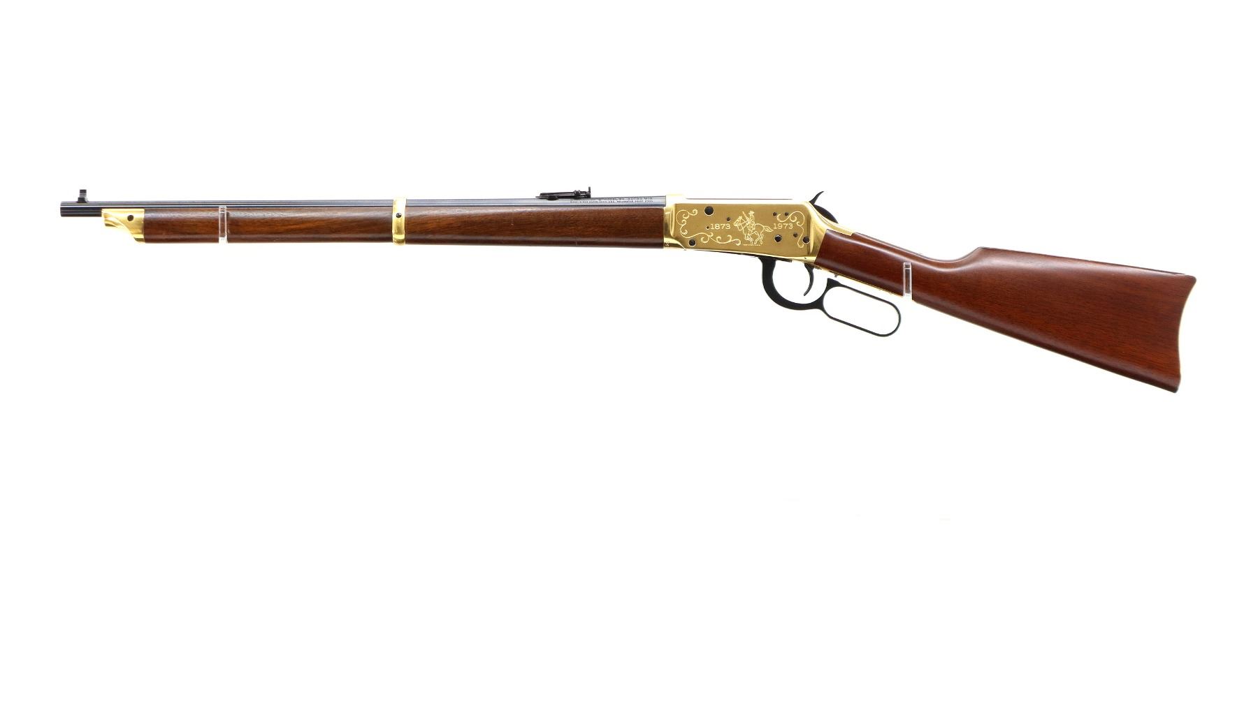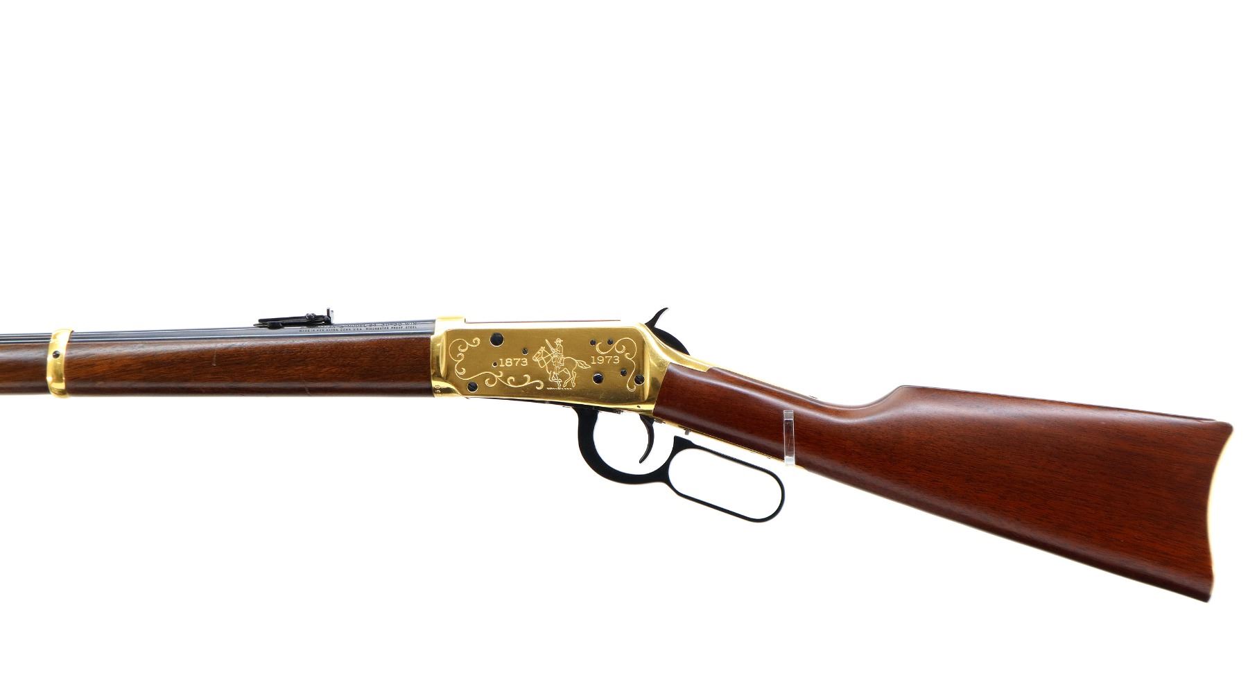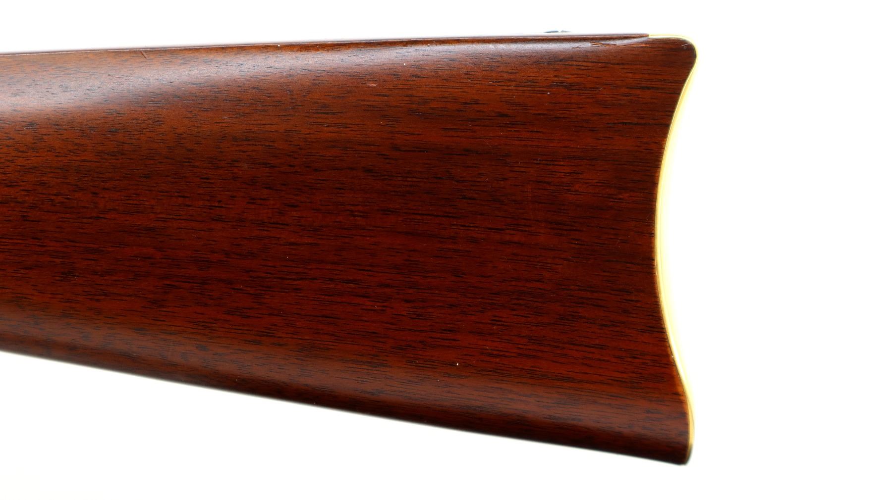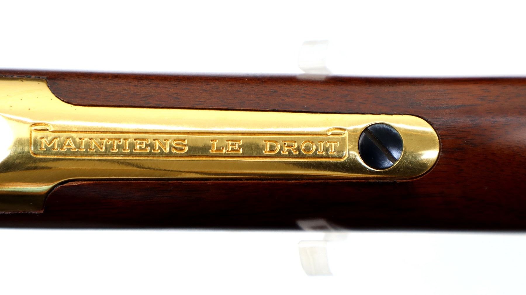 Main Description: Blade front sight, adjustable u notched ladder rear sight, polish blued barrel, bolt and lever, engraved gold receiver, grooved spur hammer. Two piece wood stocks, straight grip, smooth curved gold butt plate, barrel band and nose cap, medallion in right side of stock with letters MP stamped