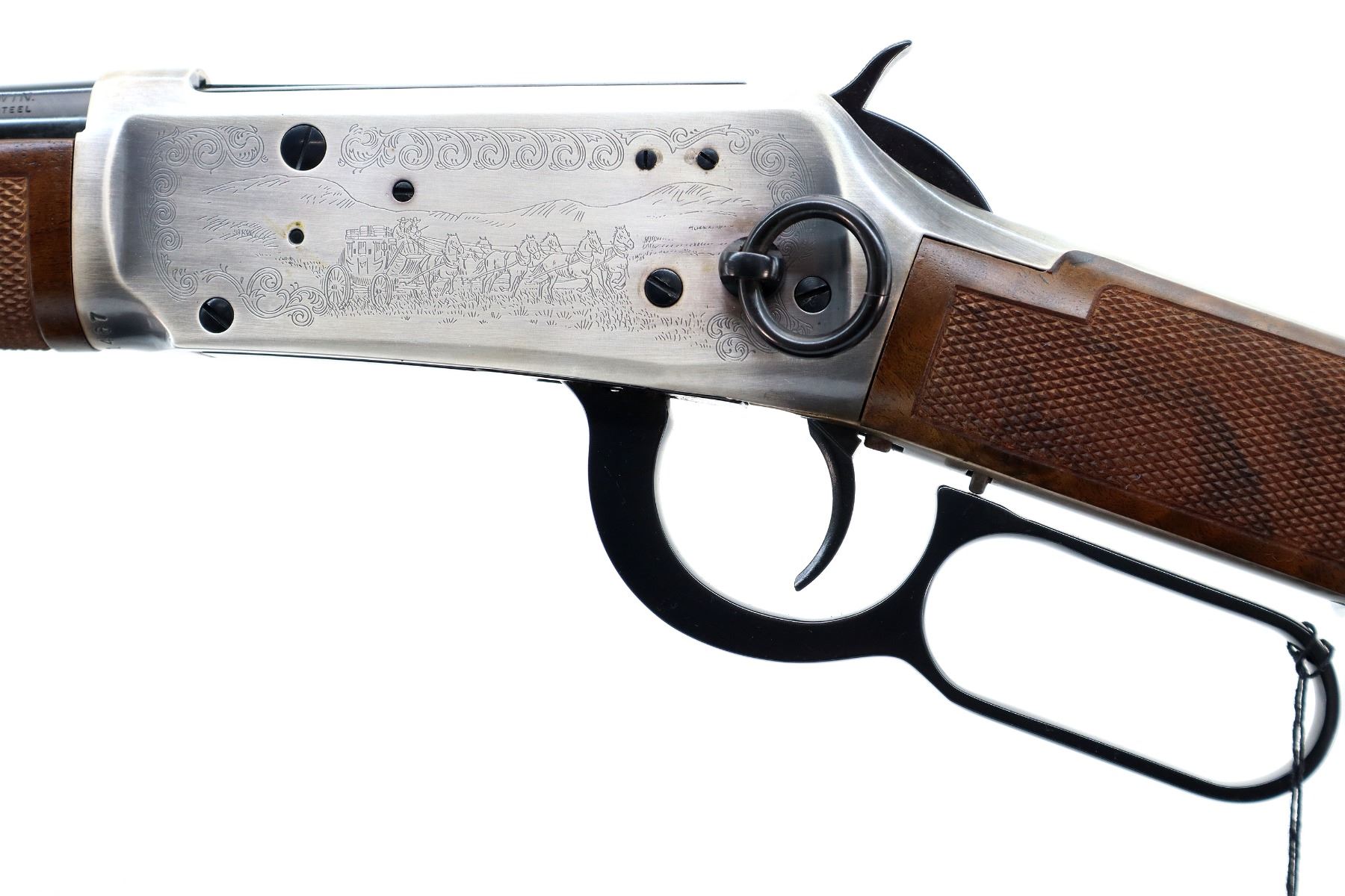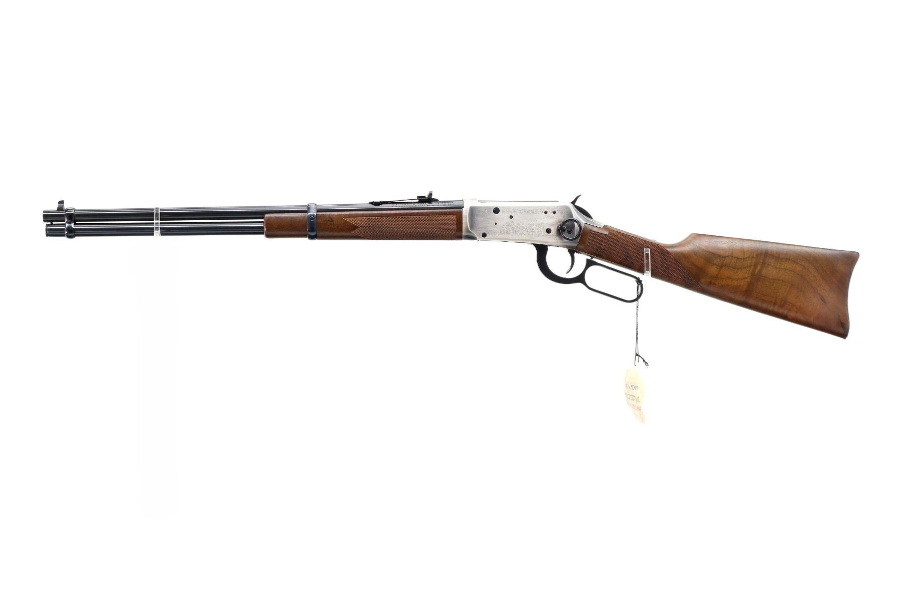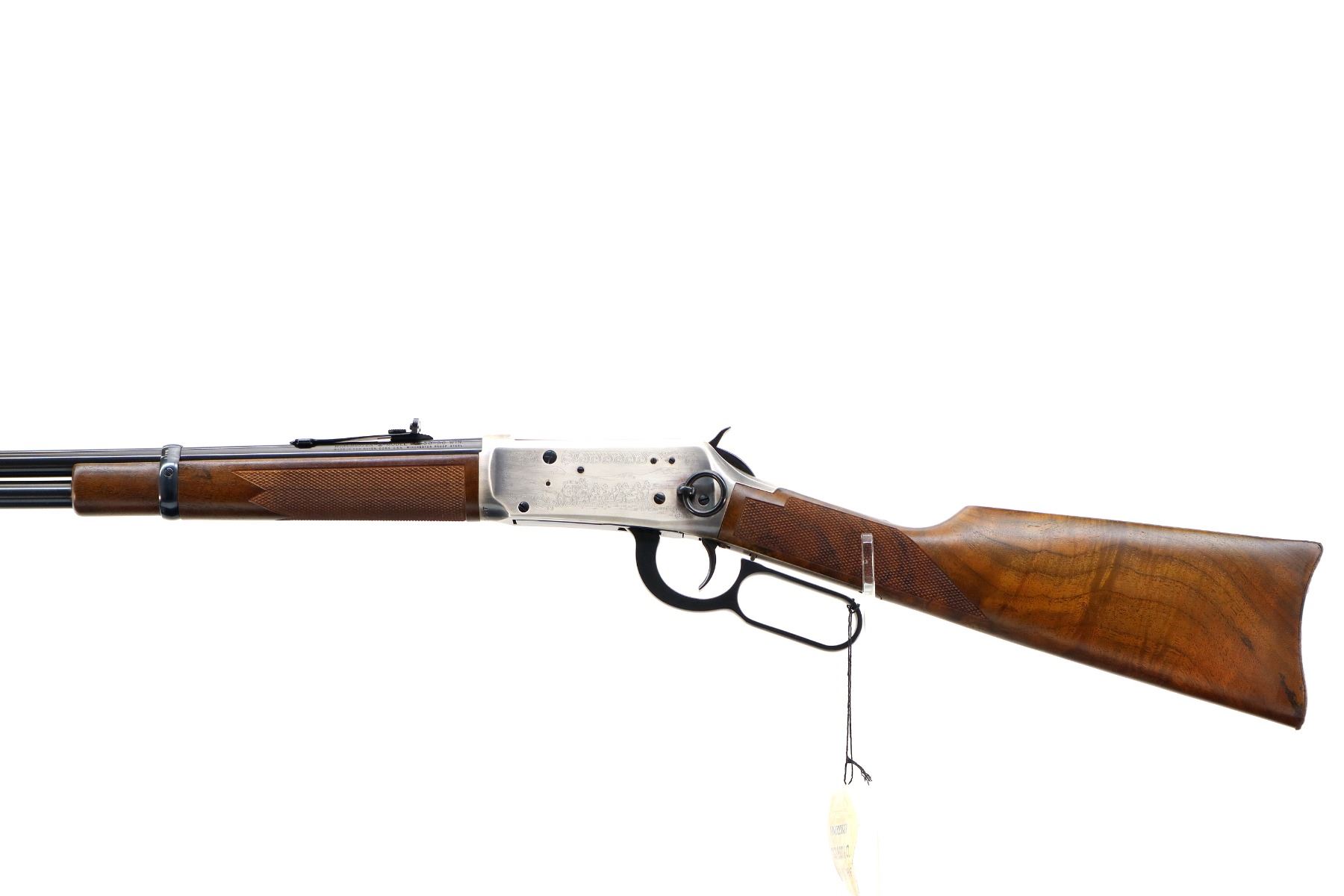 Main Description: Blade front sight, adjustable u notched rear sight, blued barrel, bolt, lever and full length magtube, engraved Western Scene silver receiver with some tarnish, grooved spur hammer, saddle ring and stud. Two piece wood stocks, checkered forearm and straight grip, smooth steel butt plate, medallion in right side of stock, retains factory hang tag.