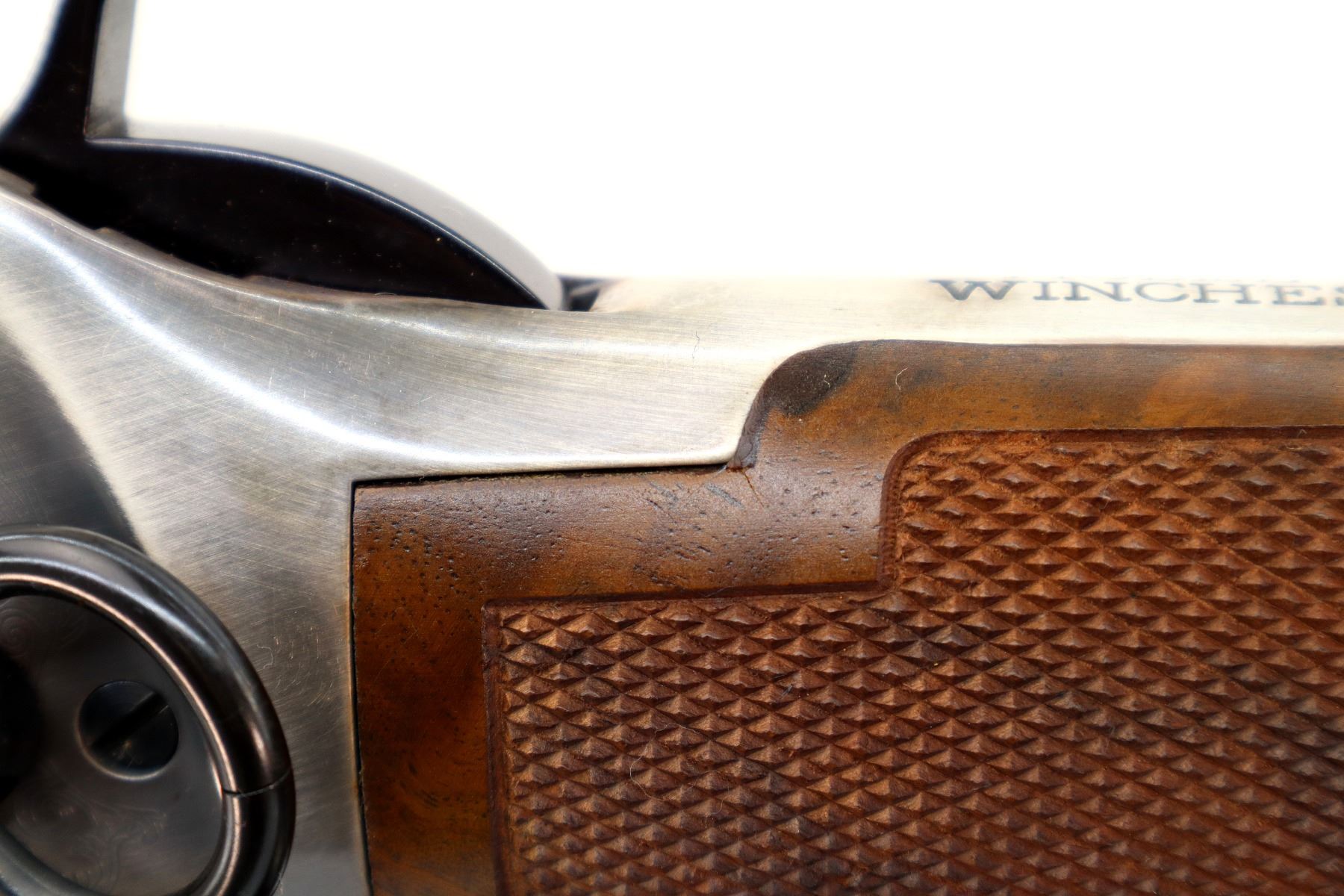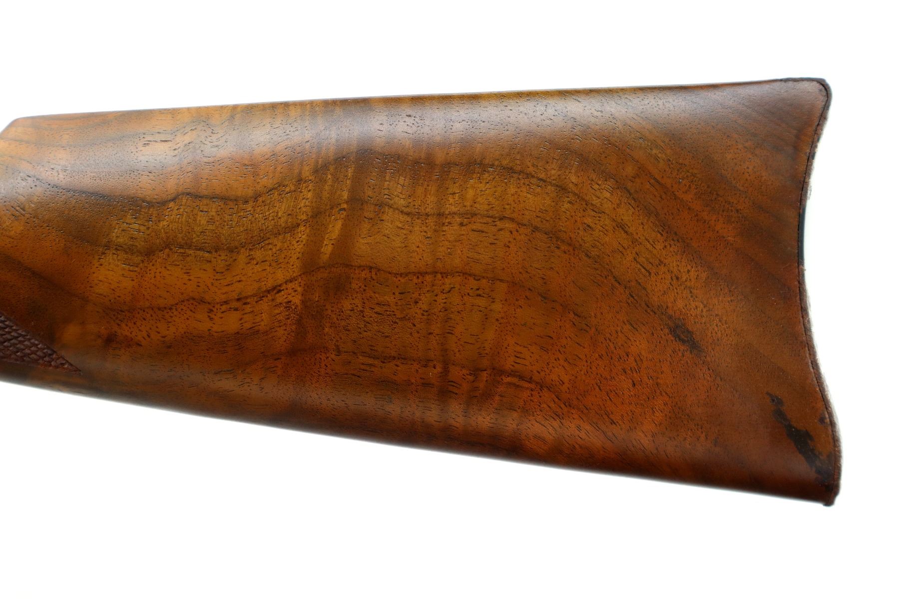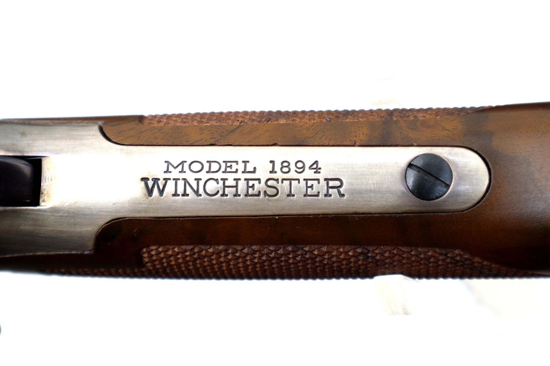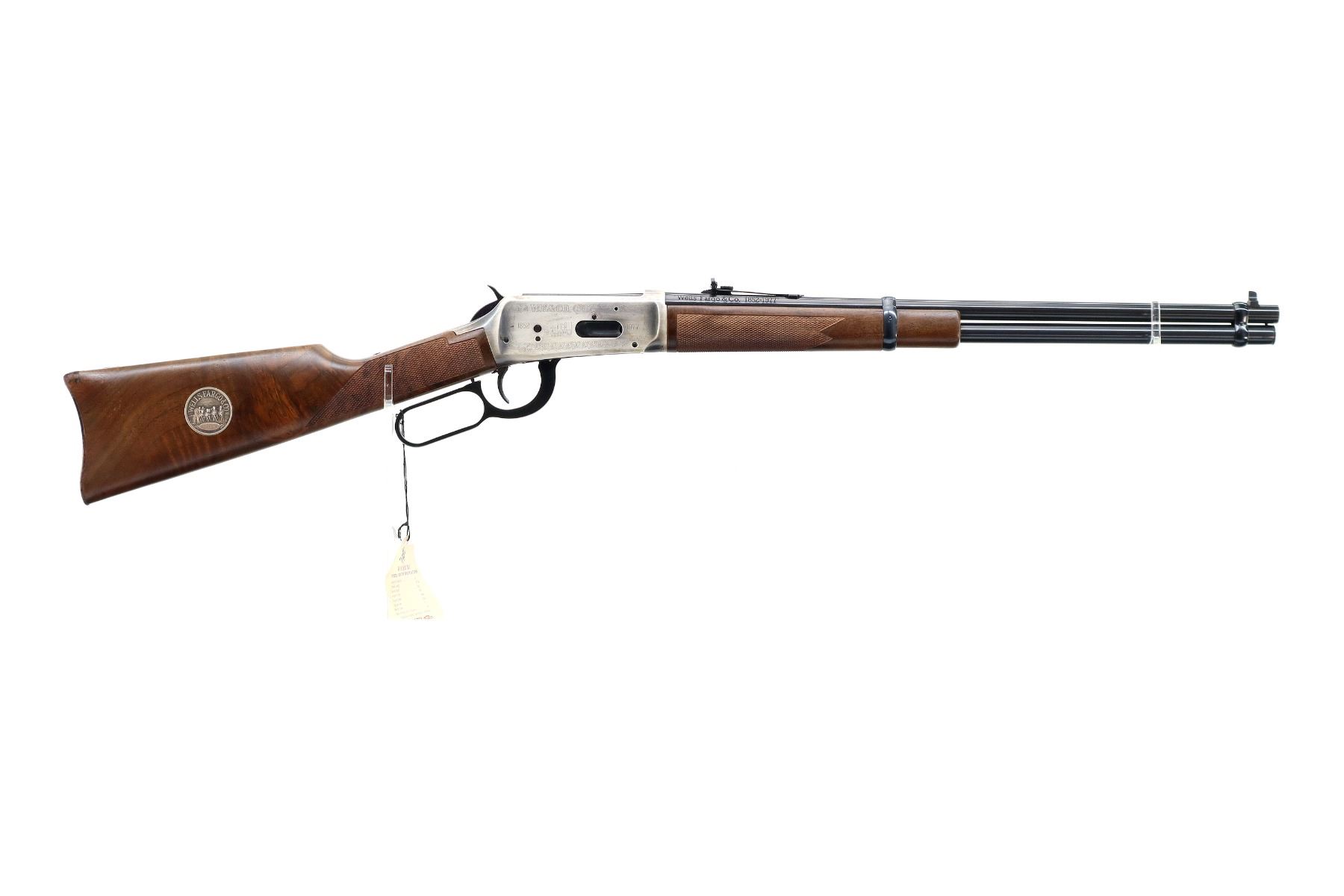 Main Description: Blade front sight, adjustable u notched rear sight, blued barrel, bolt, lever and full length magtube, engraved Western Scene silver receiver with some tarnish, grooved spur hammer, saddle ring and stud. Two piece wood stocks, checkered forearm and straight grip, smooth steel butt plate, medallion in right side of stock, retains factory hang tag.
