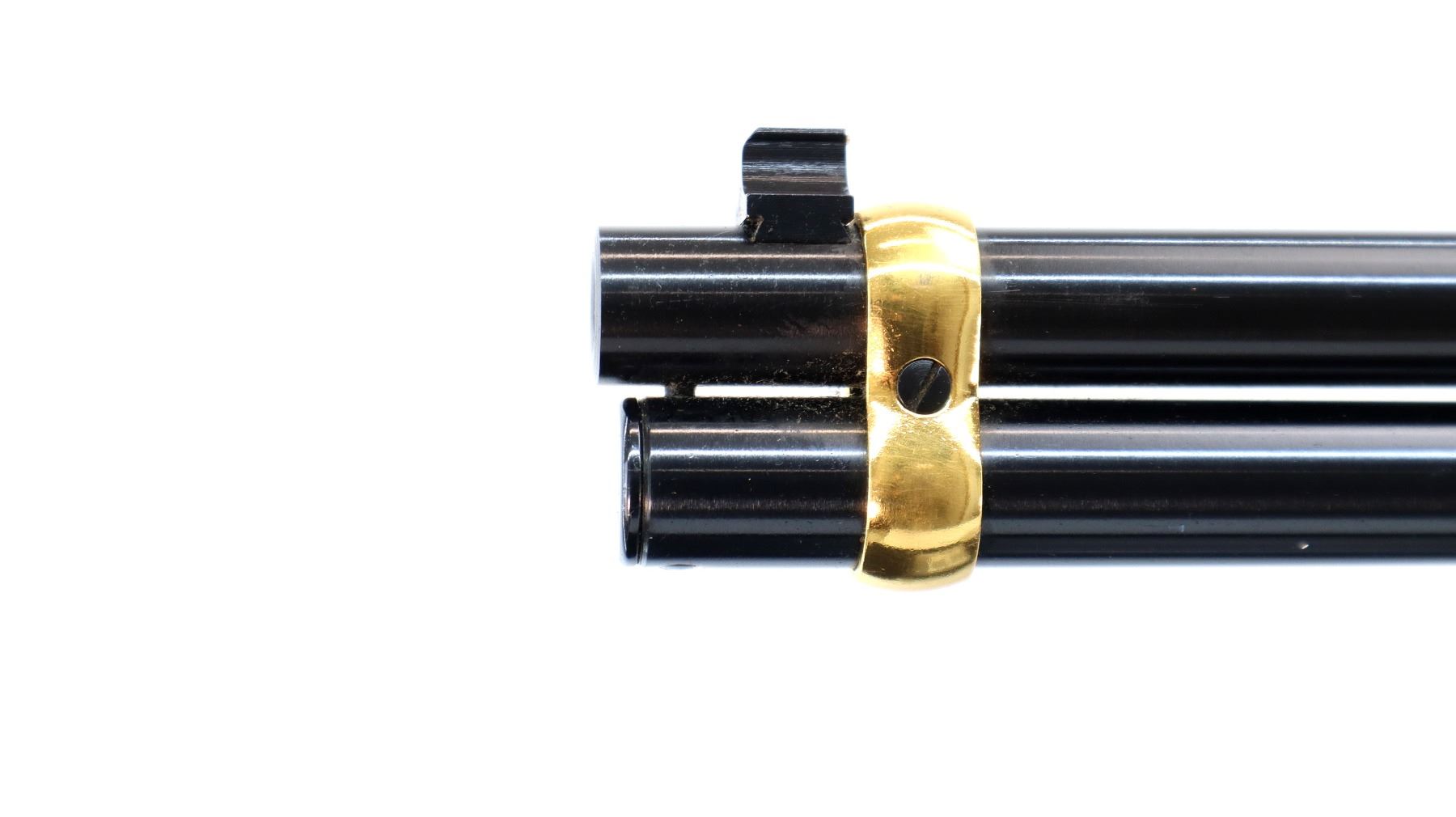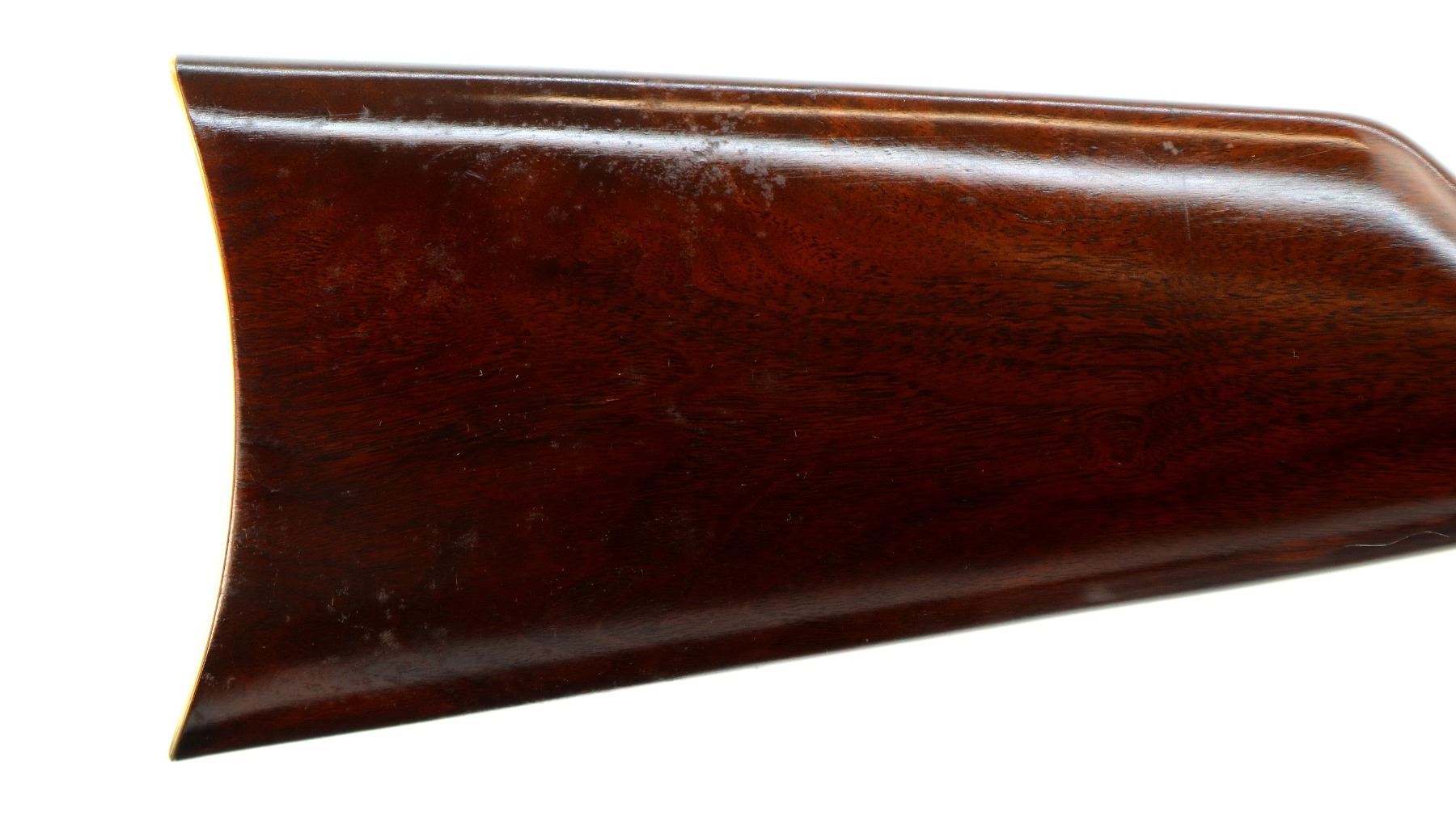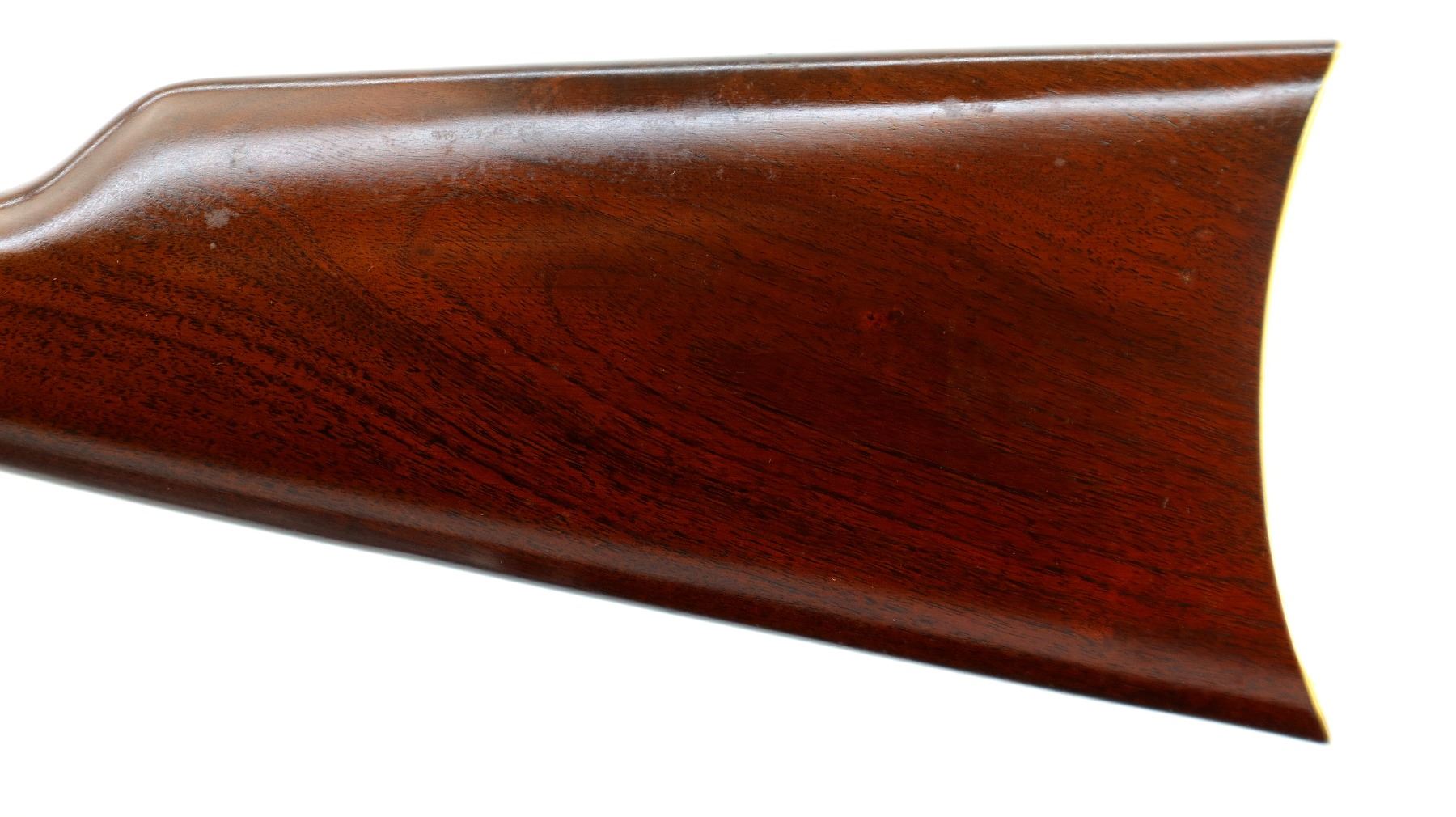 Main Description: Blade front sight, adjustable u notched ladder rear sight, blued barrel, bolt, lever and full length magtube, engraved gold receiver, grooved spur hammer, saddle ring and stud. Two piece wood stocks, straight grip, smooth curved gold butt plate and two barrel bands.