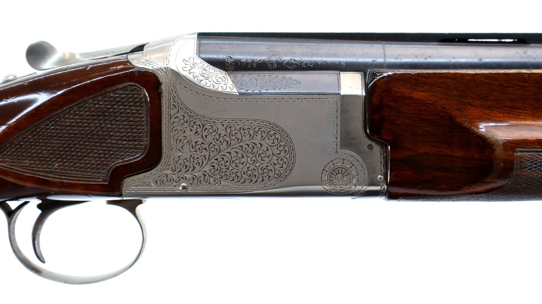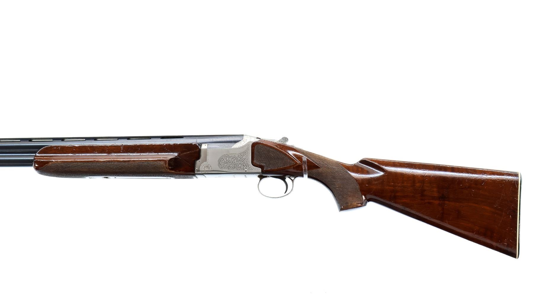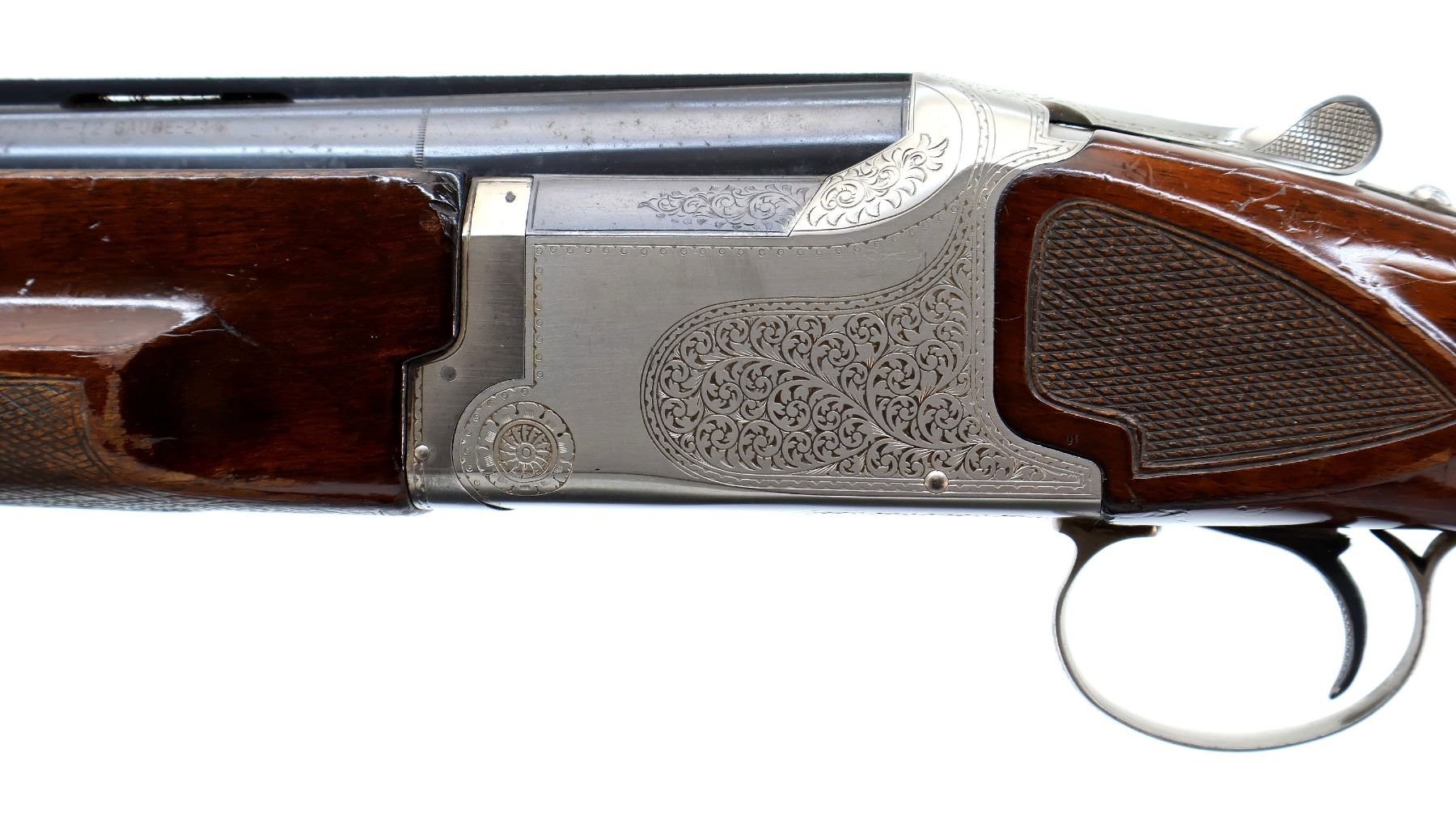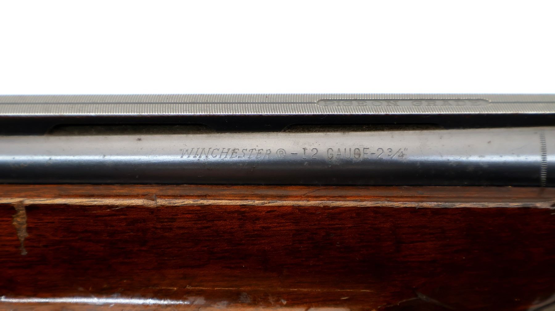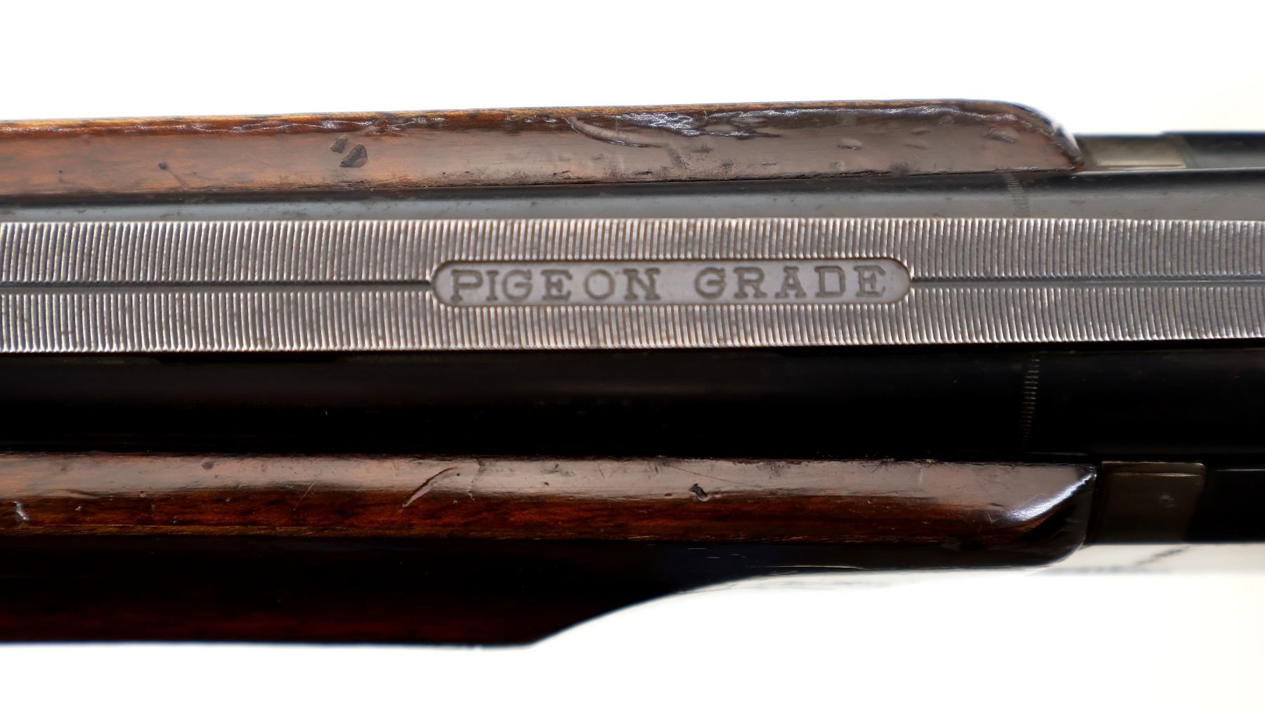 Main Description: White front and mid rib beads, blued wide vent rib barrels that are loose on face, silver engraved receiver with Pigeon on the bottom, manual selective safety, action does not function requires adjustment parts or repair, missing right extractor and single trigger. Two piece wood stocks, checkered forearm and pistol grip, grooved black polymer butt plate