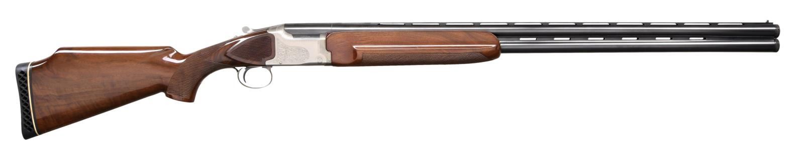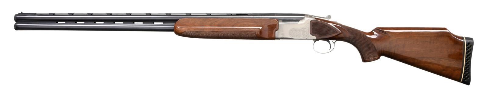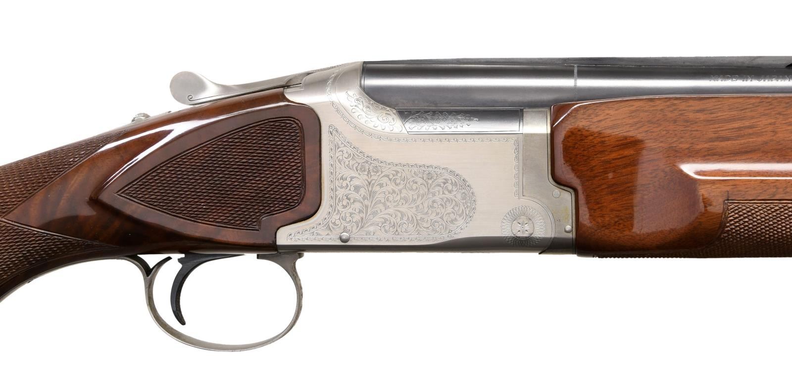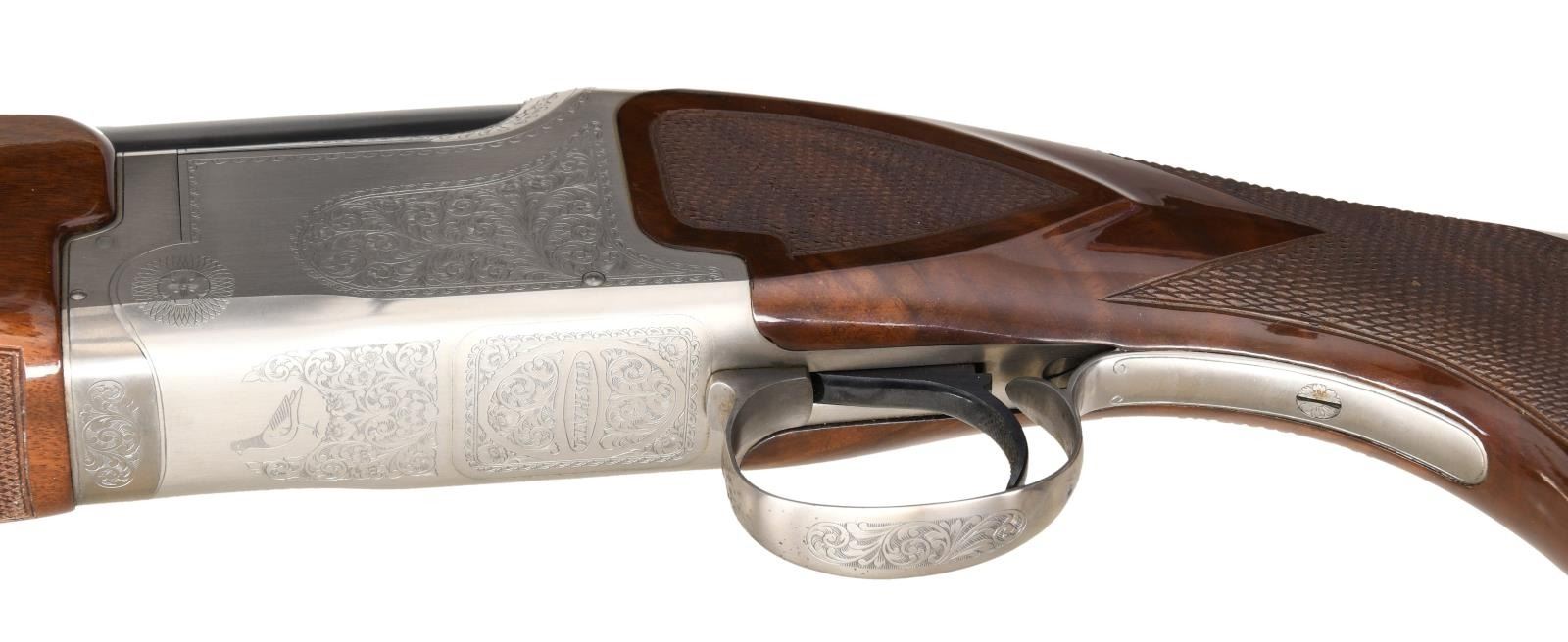 Cal. 12 Ga., 2 3/4". S# PK446156 (mfg. 1974-1987). Mfg. by Kodensha of Japan w/ 30" VR barrel. White target front sight & white mid bead. Fitted for Winchokes: Imp-Mod & Full tubes included. Bright finish action w/ scroll ornamentation featuring pigeon on floorplate. Features include SST & selective ejectors. Gloss finished walnut forearm & uncapped pistol grip. Monte Carlo stock having trap dimensions & XTR cut checkering. LOP: 14 1/2" over Pachmayr White Line pad. WEIGHT: 8.66 lbs. CONDITION: near excellent metal finish. Very good to near excellent wood finish showing scattered light impressions. Bright shiny bores showing faint pitting forward of chambers. (24-1906/MD). MODERN. $1,200-1,800.