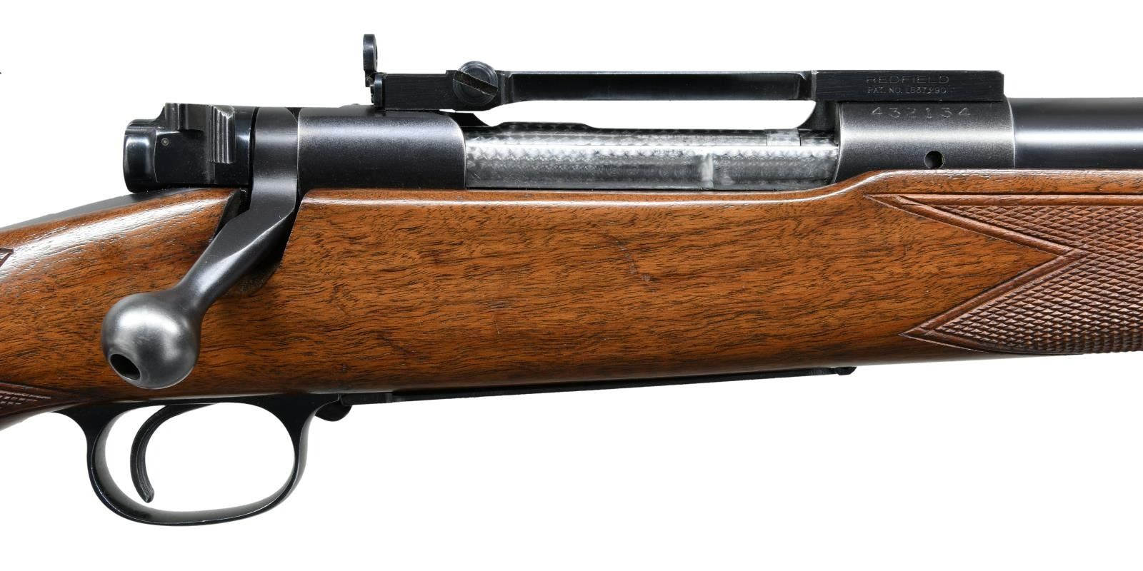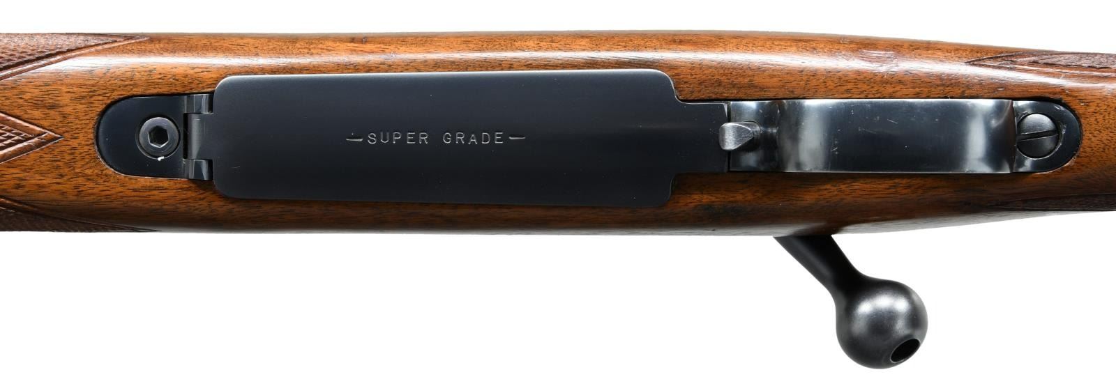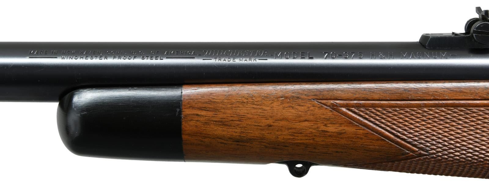 ACTION RIFLE. Cal. 375 H&H Mag. S# 432134. Bbl. 25" contour 1. Winchester 70B "roll over" rear sight. Hooded ramp front with high replacement blade (original No. 255 gold bead sight is included). Redfield 1 piece base with folding peep sight. Jeweled bolt, extractor, extractor ring & follower. Bolt is number to the rifle. Super Grade marked floor plate. Hex head floor plate bolt is installed (original is included). High comb Monte Carlo cheekpiece stock has Super Grade checkering, black forend tip, steel grip cap, solid red pad & Super Grade swivel bases. S# indicates 1958 mfg. UNATTACHED ACCESORIES: Parts envelope containing Super Grade swivels, original front sight, 2 higher replacement front sights, 2 scope base filler screws & original floorplate bolt. 4 boxes of Winchester .375 H&H Mag, ammo in red & yellow boxes. 3 boxes have 270 grain soft point bullets, 1 box has 300 grain Silvertip Expanding bullets. I box of 270 grain ammo has several cartridge showing heavy green corrosion. CONDITION: Very fine. Bbl. retains over 98% original blue. Action has 90% blue showing light carry & edge wear. Very good original stock finish shows scattered small dents & handling marks. Bright near excellent bore. (23-1396/DS). CURIO. $5000-7500.