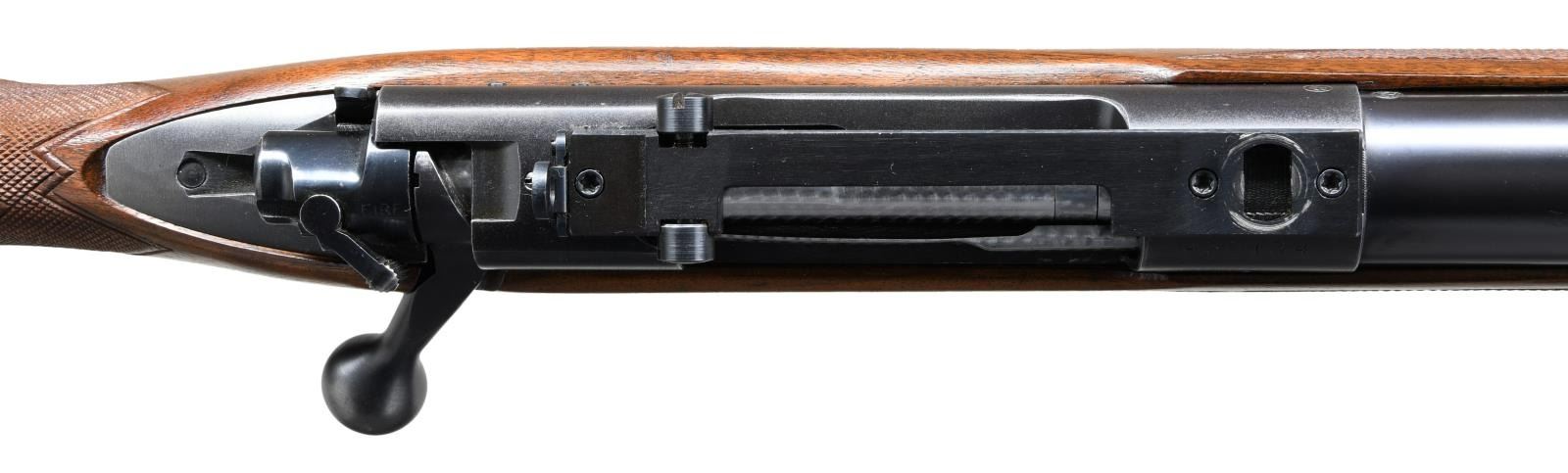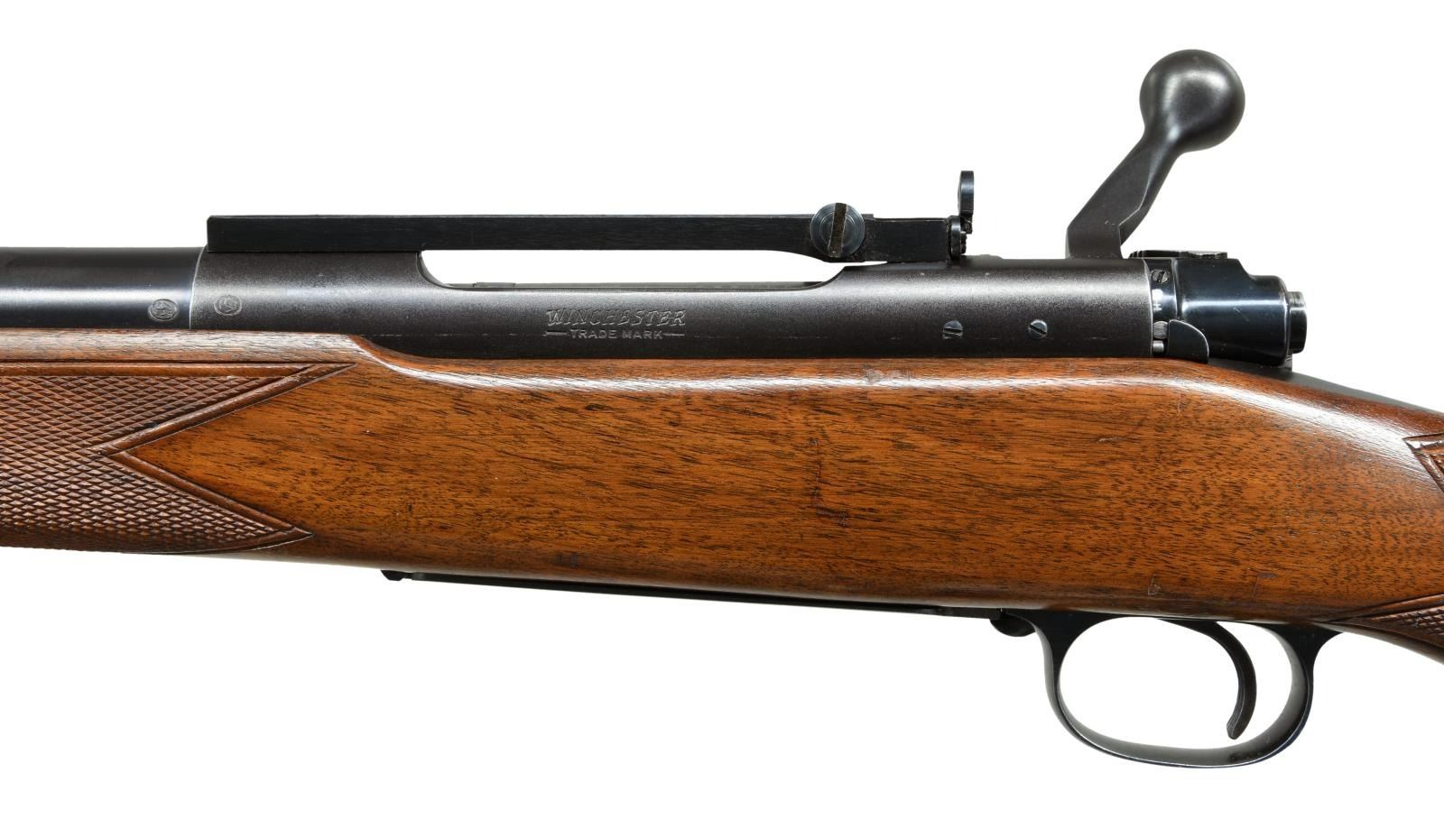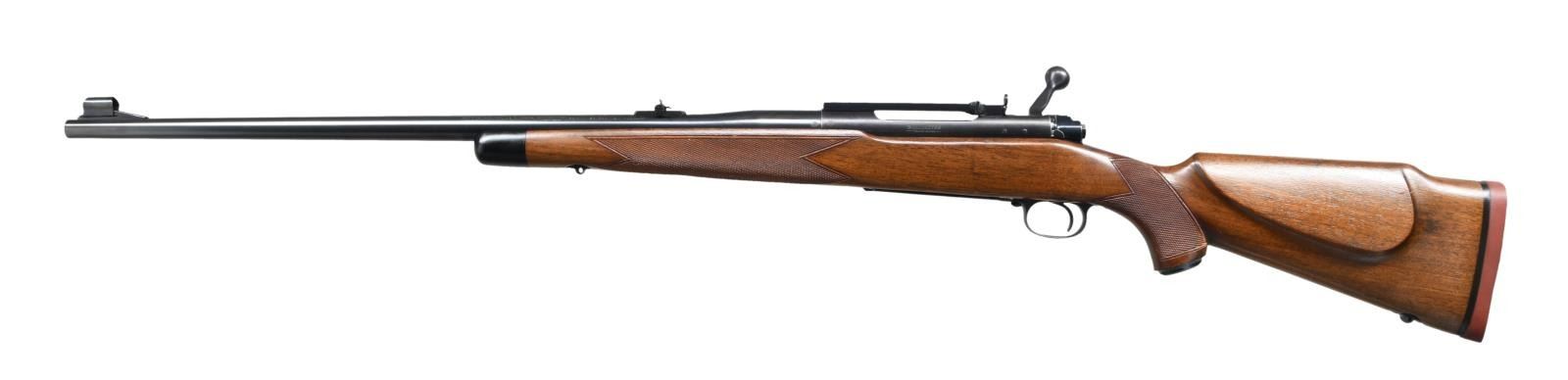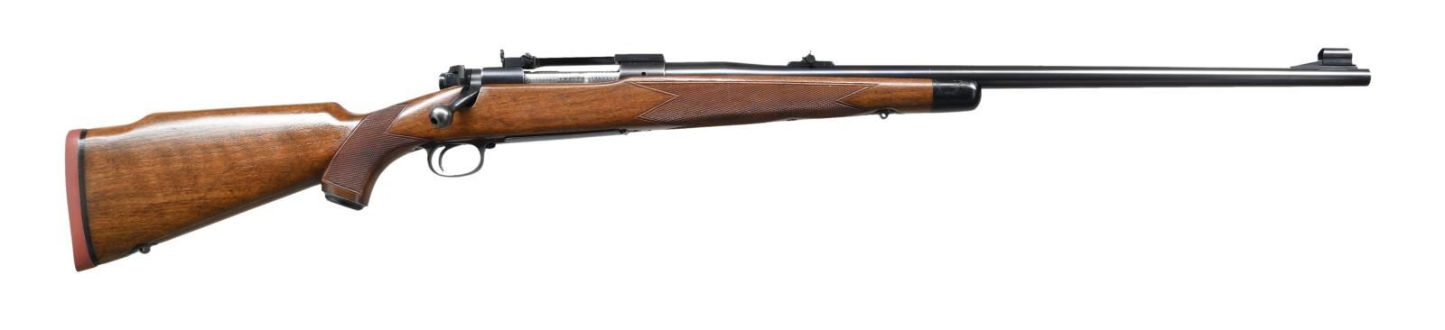 ACTION RIFLE. Cal. 375 H&H Mag. S# 432134. Bbl. 25" contour 1. Winchester 70B "roll over" rear sight. Hooded ramp front with high replacement blade (original No. 255 gold bead sight is included). Redfield 1 piece base with folding peep sight. Jeweled bolt, extractor, extractor ring & follower. Bolt is number to the rifle. Super Grade marked floor plate. Hex head floor plate bolt is installed (original is included). High comb Monte Carlo cheekpiece stock has Super Grade checkering, black forend tip, steel grip cap, solid red pad & Super Grade swivel bases. S# indicates 1958 mfg. UNATTACHED ACCESORIES: Parts envelope containing Super Grade swivels, original front sight, 2 higher replacement front sights, 2 scope base filler screws & original floorplate bolt. 4 boxes of Winchester .375 H&H Mag, ammo in red & yellow boxes. 3 boxes have 270 grain soft point bullets, 1 box has 300 grain Silvertip Expanding bullets. I box of 270 grain ammo has several cartridge showing heavy green corrosion. CONDITION: Very fine. Bbl. retains over 98% original blue. Action has 90% blue showing light carry & edge wear. Very good original stock finish shows scattered small dents & handling marks. Bright near excellent bore. (23-1396/DS). CURIO. $5000-7500.