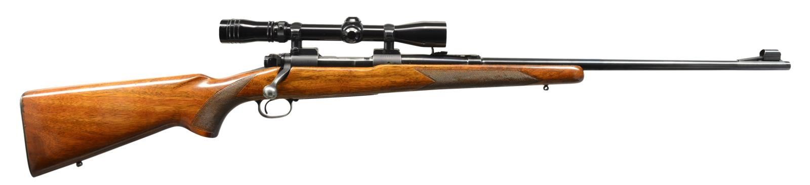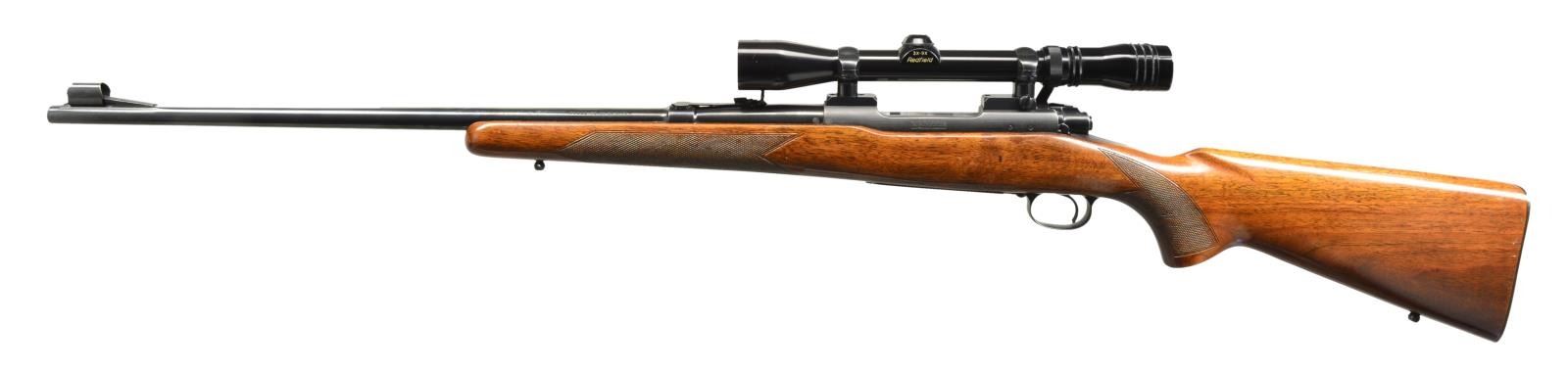 Cal. 30-06. S# 161198. Bbl. 24" w/ hooded ramp front sight & elevator adj. sporting rear sight. Redfield 3x-9x gloss finished Widefield scope w/ duplex reticle on Redfield Jr. mts. Bolt is numbered to rifle. Straight comb checkered walnut stock w/ replacement swivel bases & checkered steel buttplate. Mfg. 1950. CONDITION: 90% lightly faded blue showing edge wear. Refinished stock showing handling marks. Bright bore retains strong rifling. Scope has clear optics. (20-2247/DS). CURIO. $650-1,000.